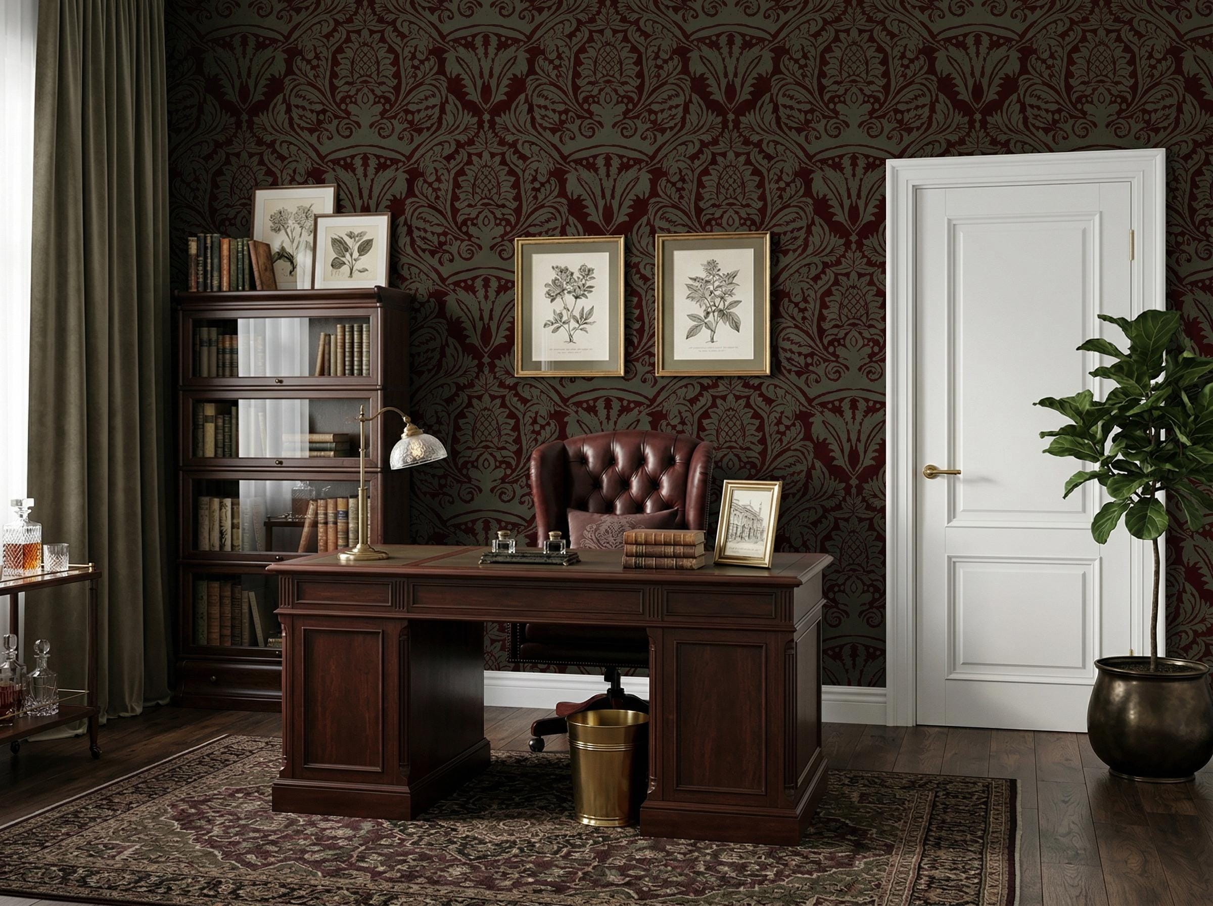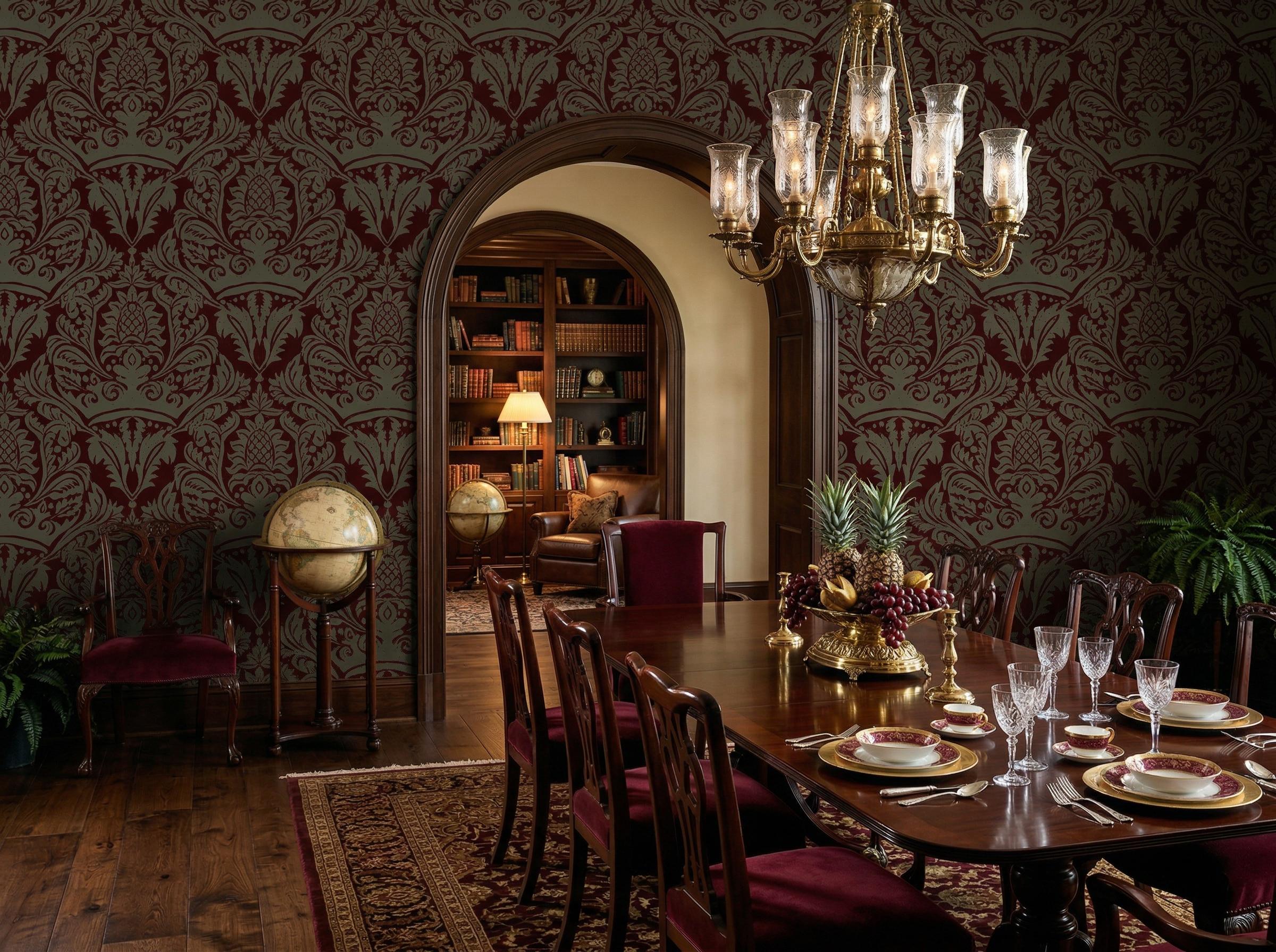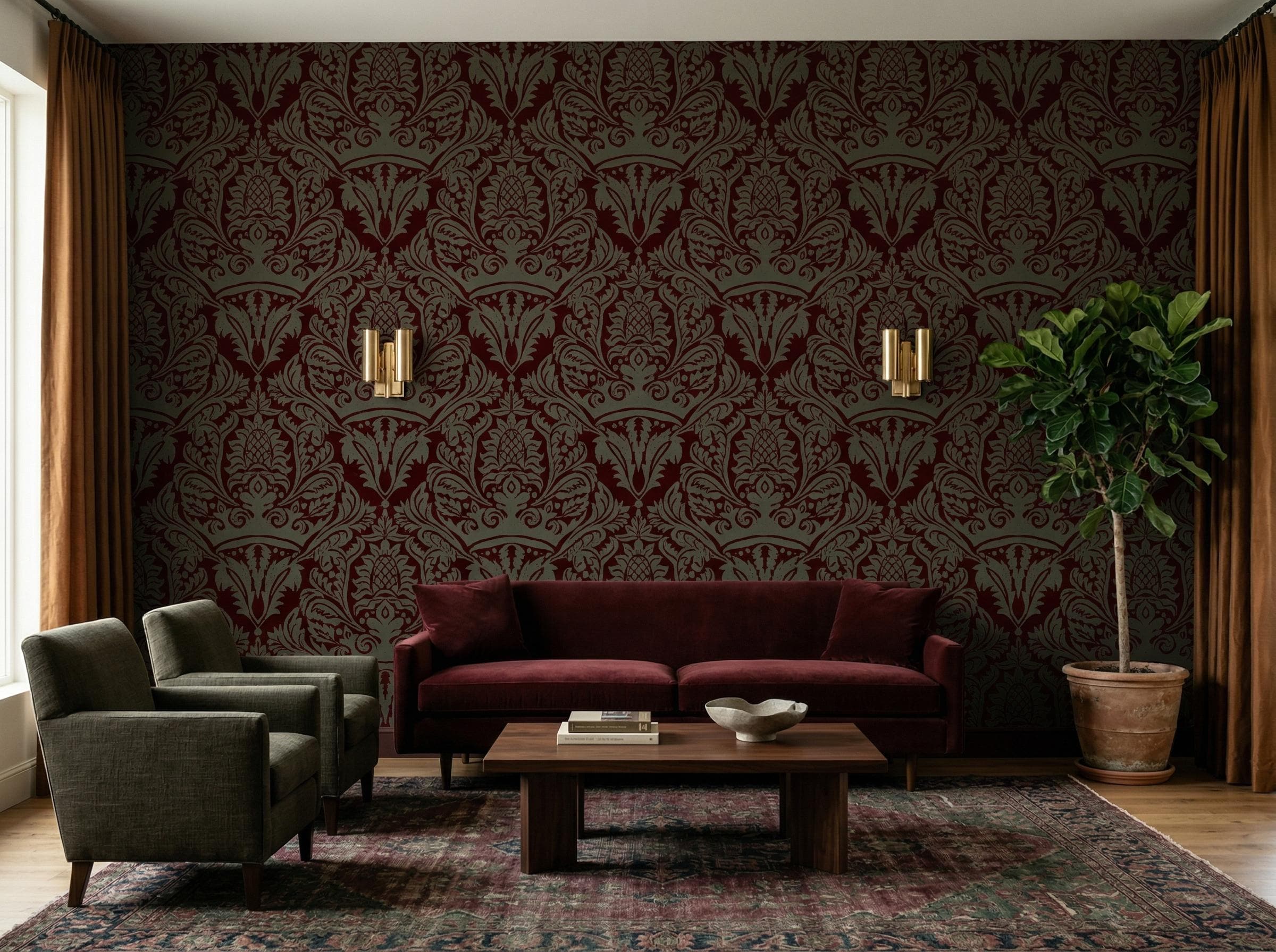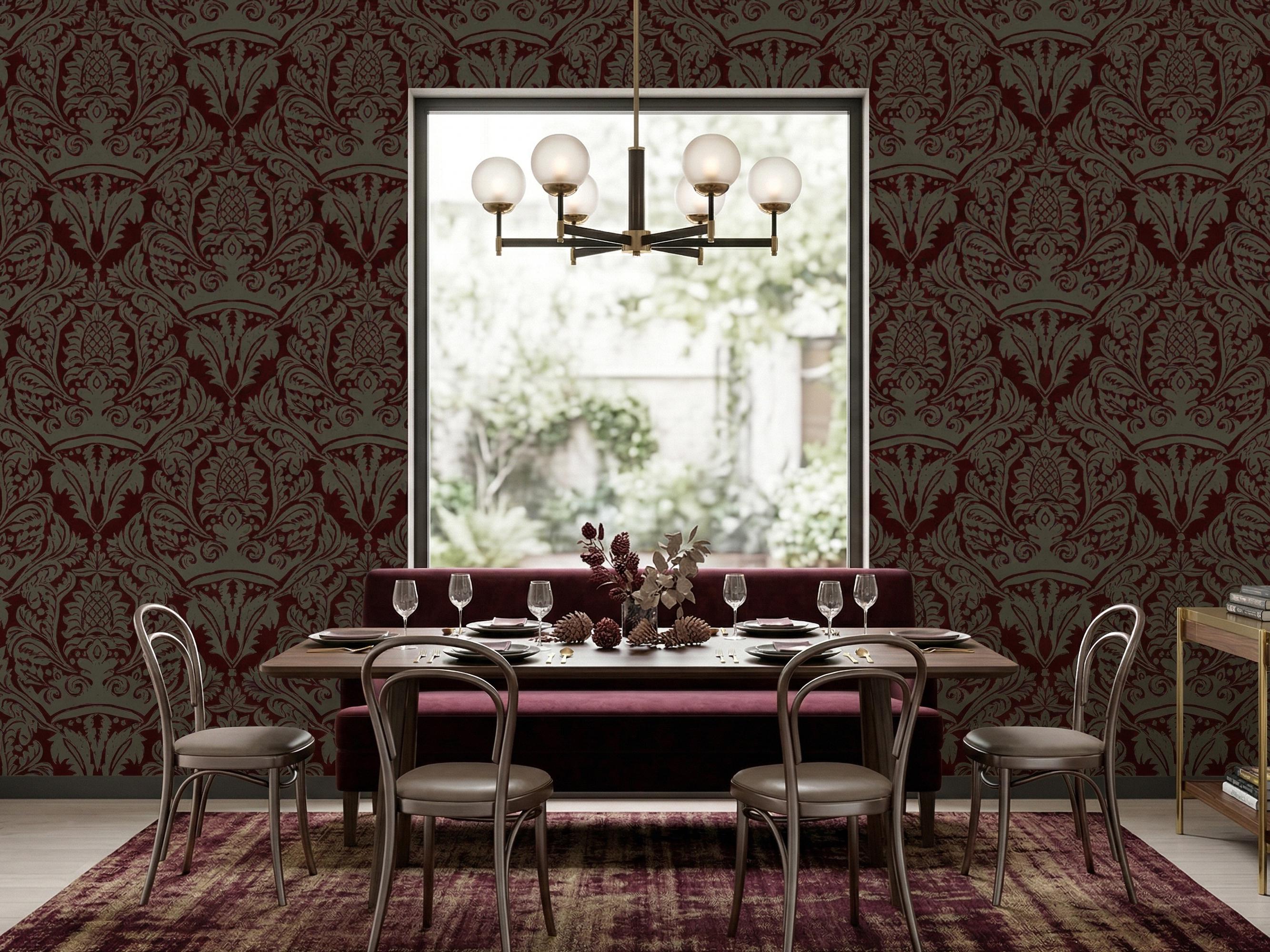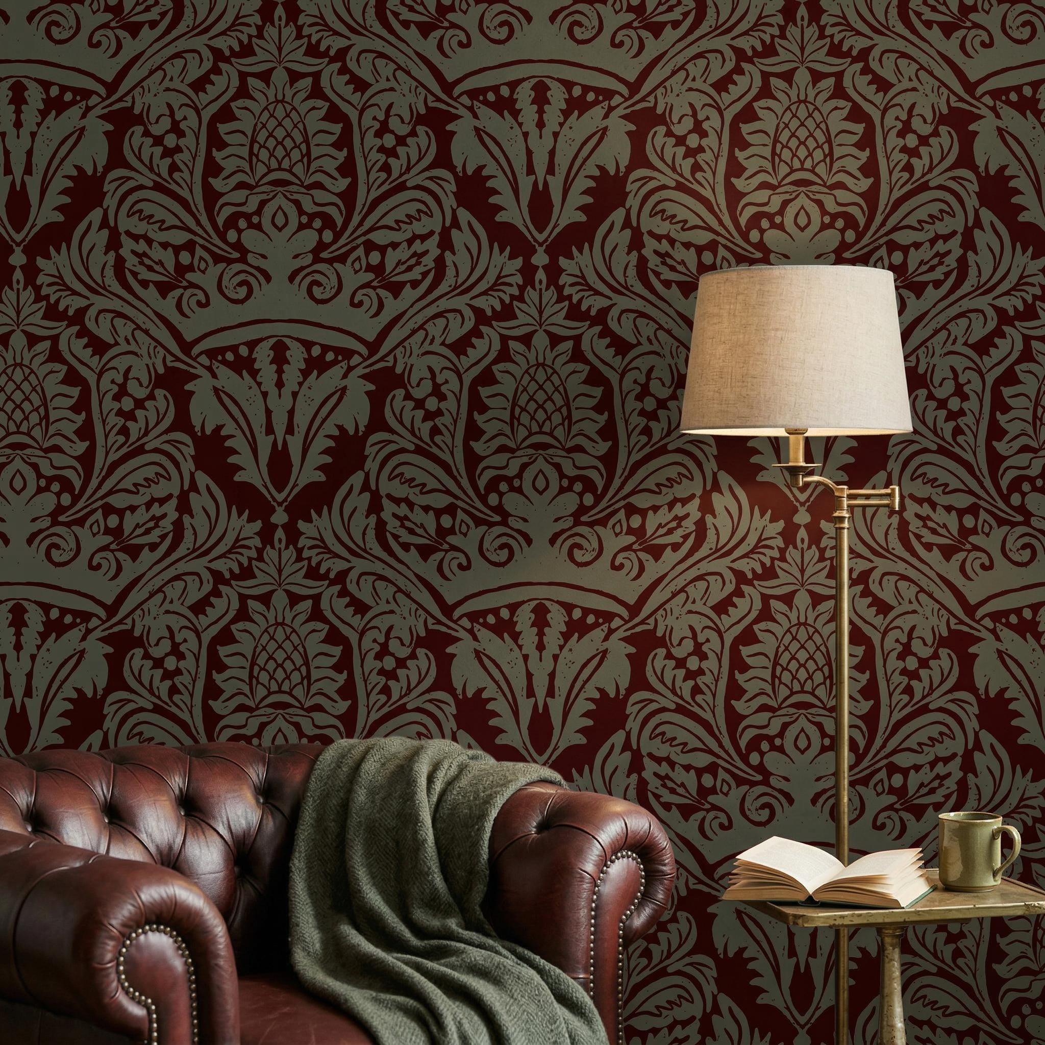 Elevate your interior with this luxurious vintage damask wallpaper in rich burgundy red tones. Featuring an intricate floral pattern inspired by classic Victorian design, this wallpaper brings timeless elegance and sophistication to any room.