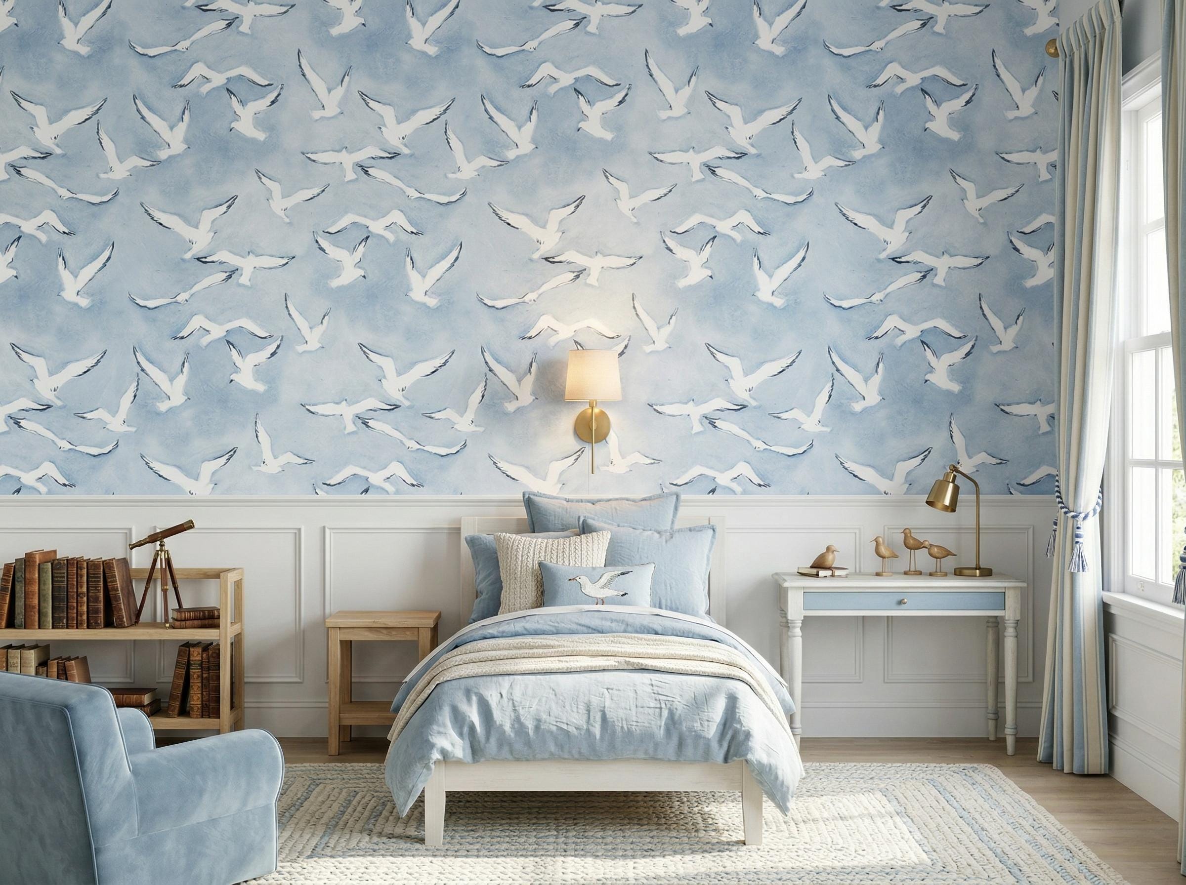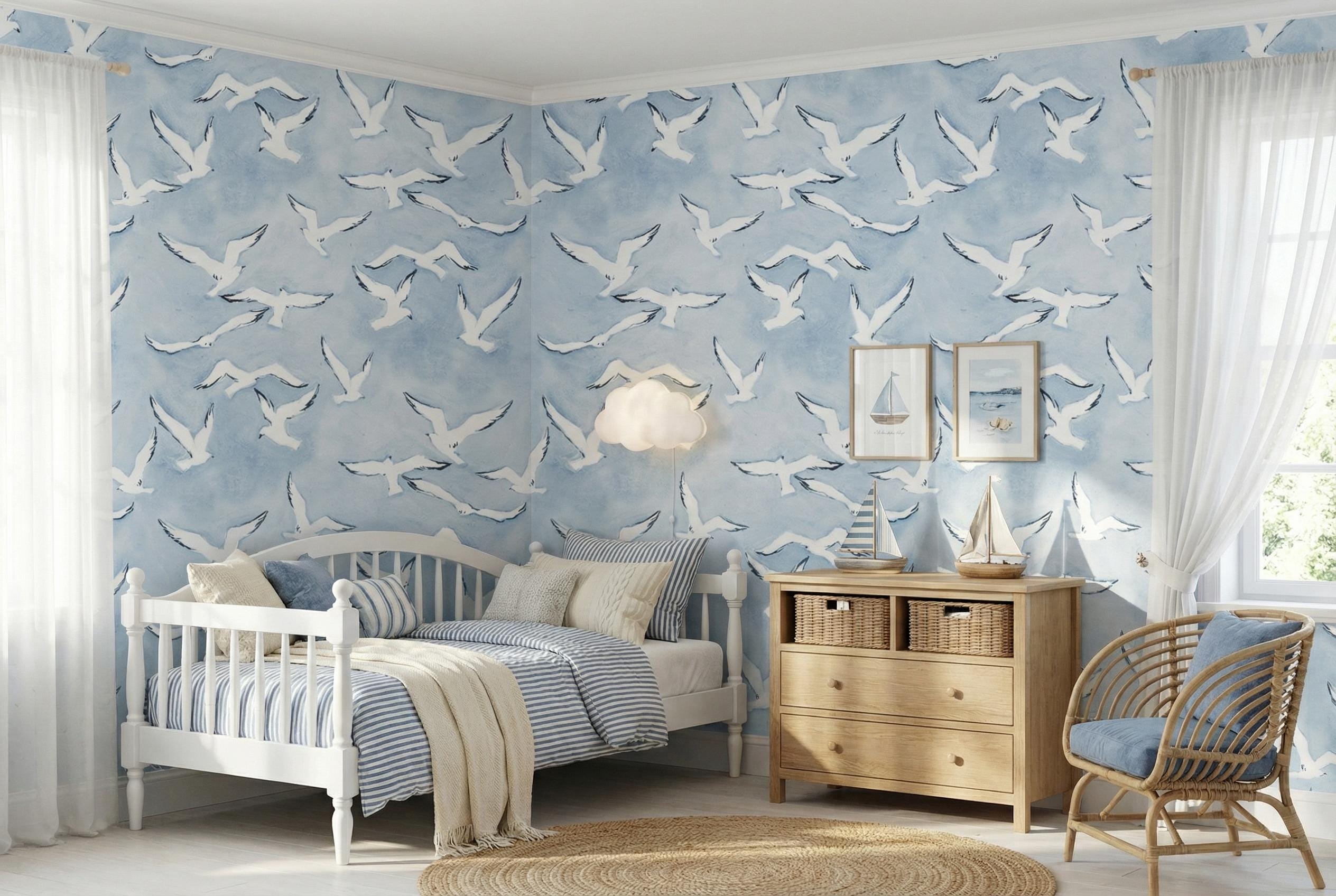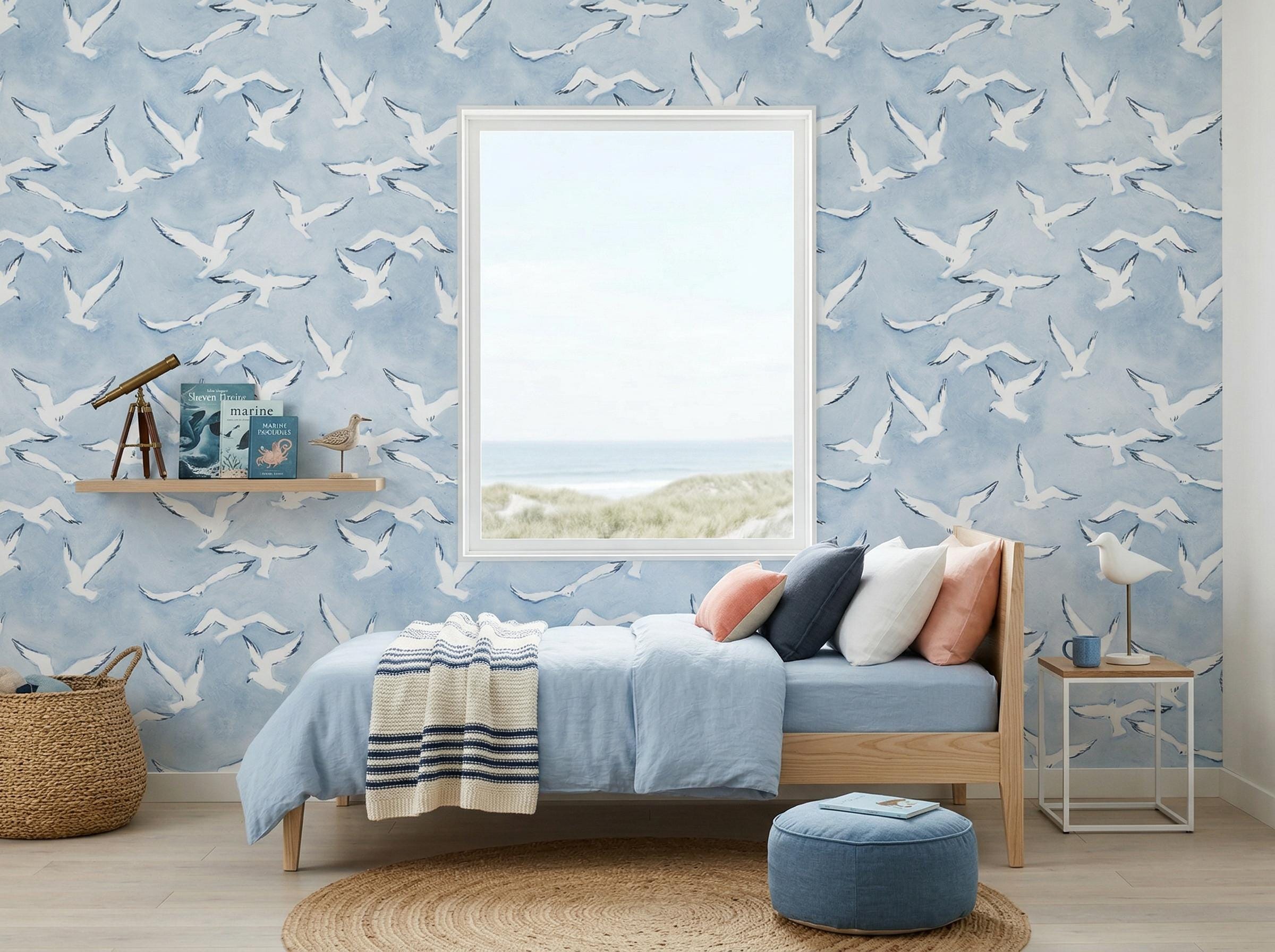 Create a calming coastal atmosphere with this blue bird wallpaper featuring elegant flying seagulls over a soft sky background. Perfect for beach house interiors, nurseries, or serene bedroom designs.