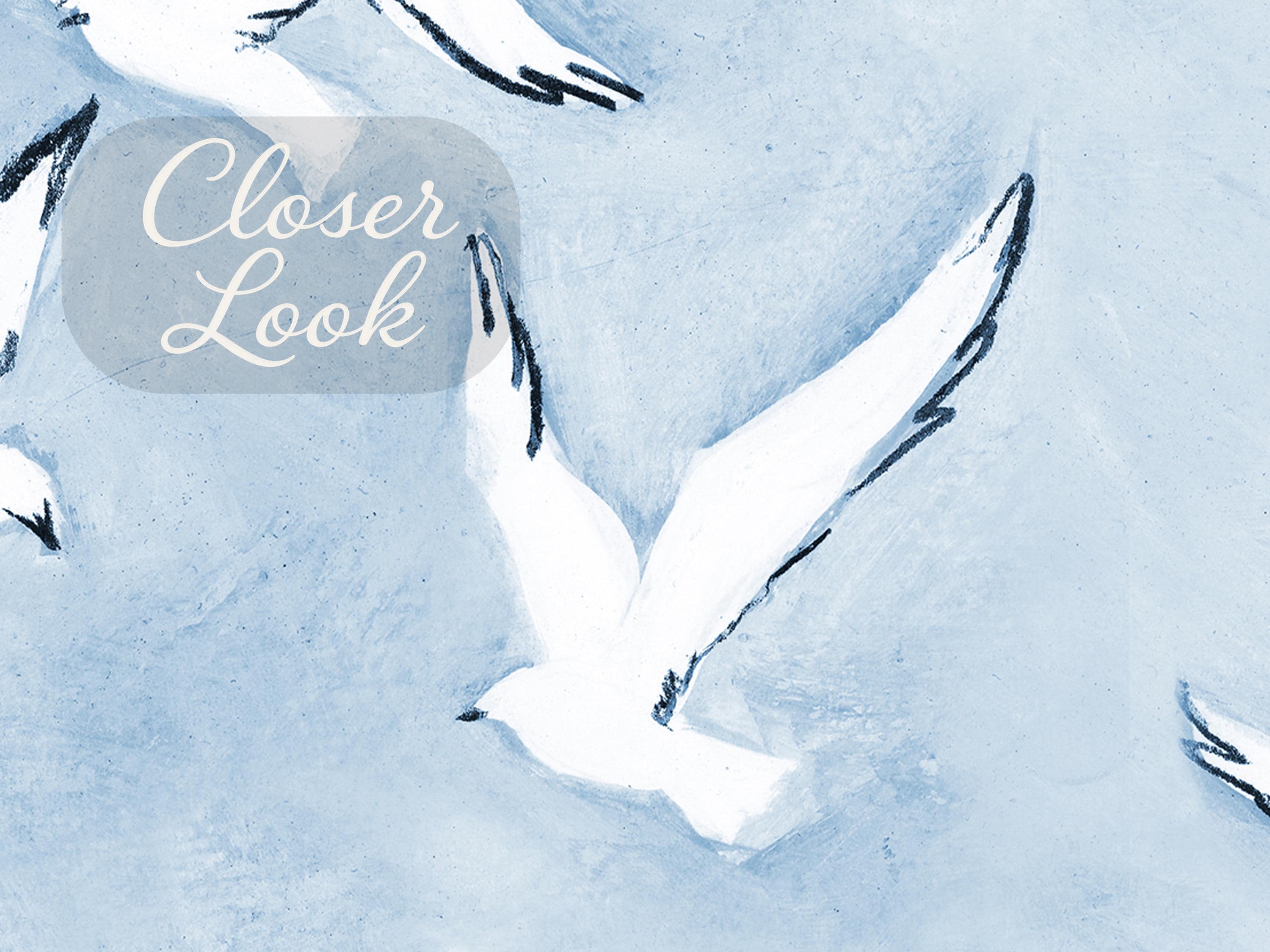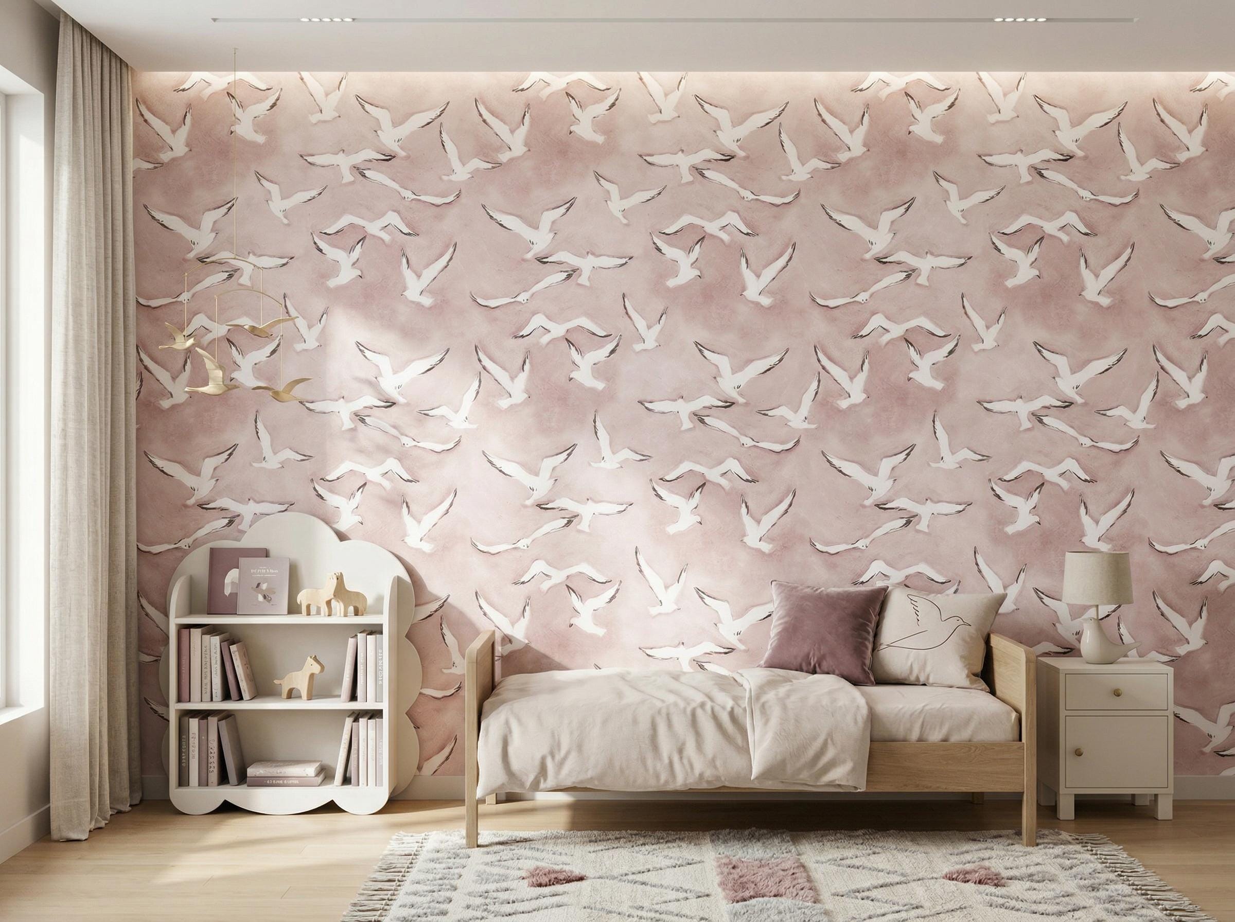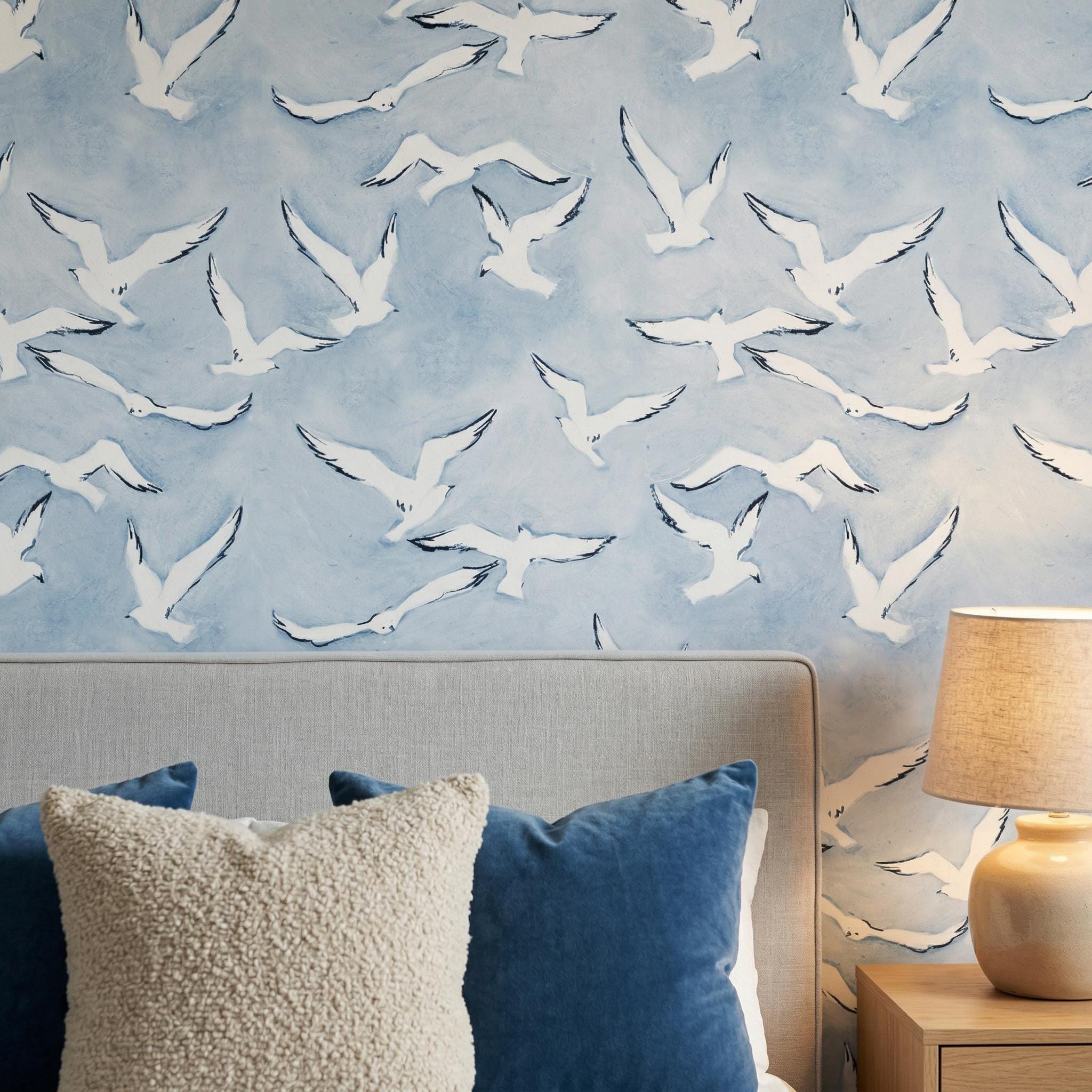 Create a calming coastal atmosphere with this blue bird wallpaper featuring elegant flying seagulls over a soft sky background. Perfect for beach house interiors, nurseries, or serene bedroom designs.