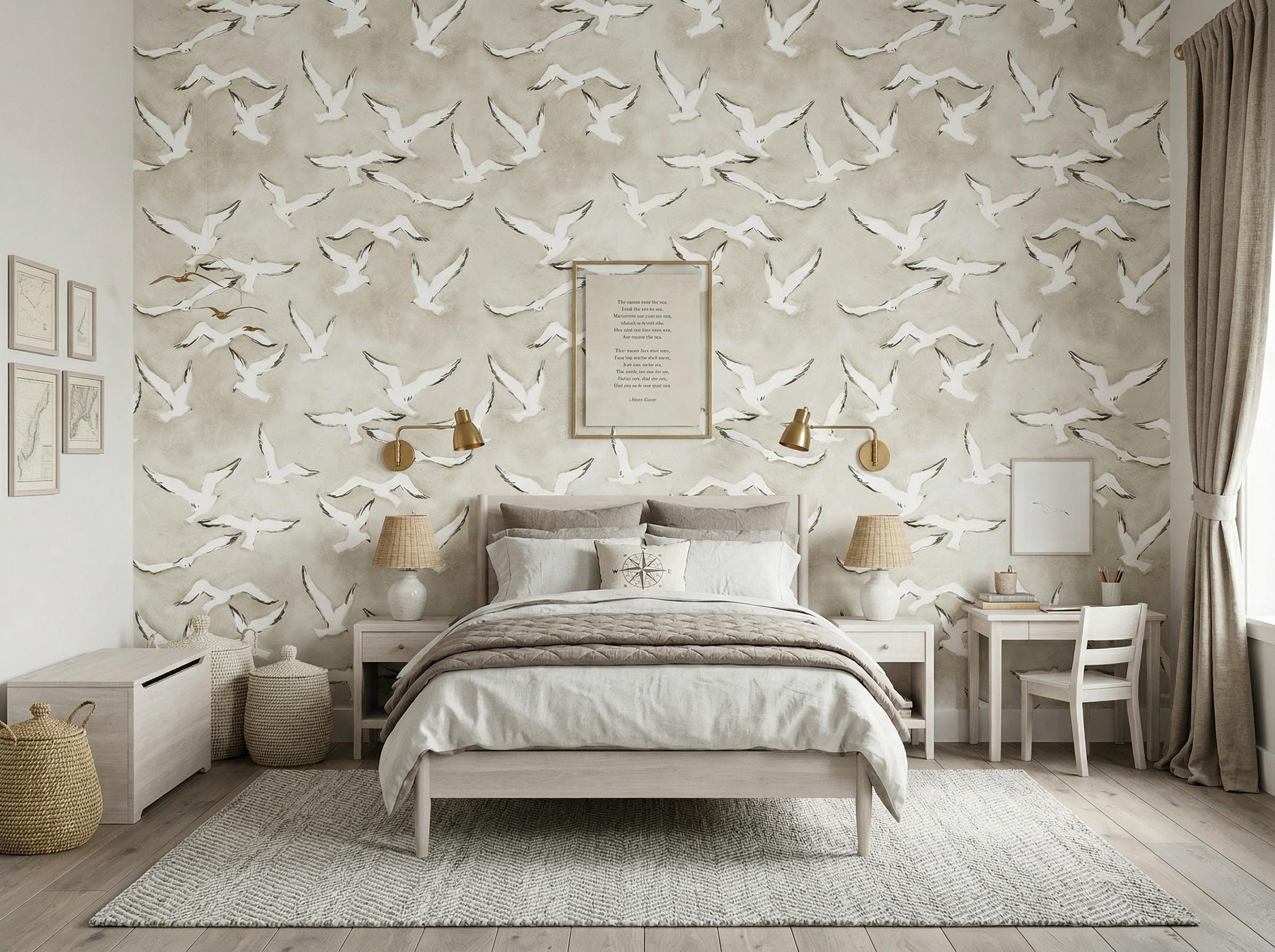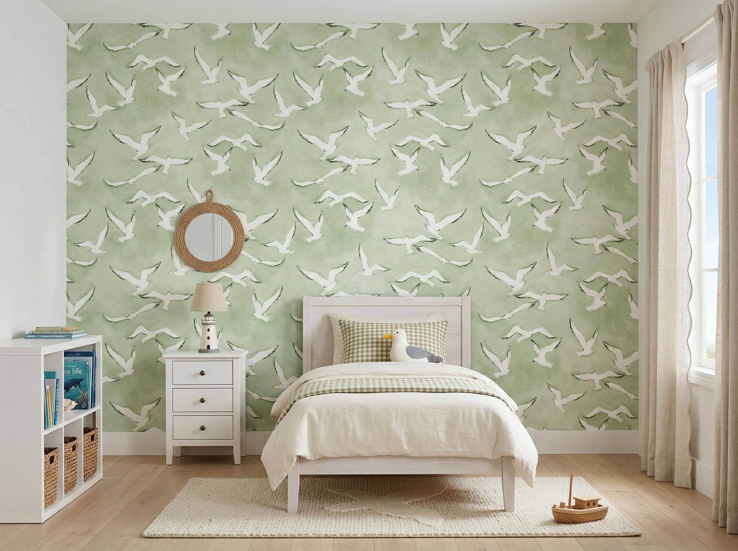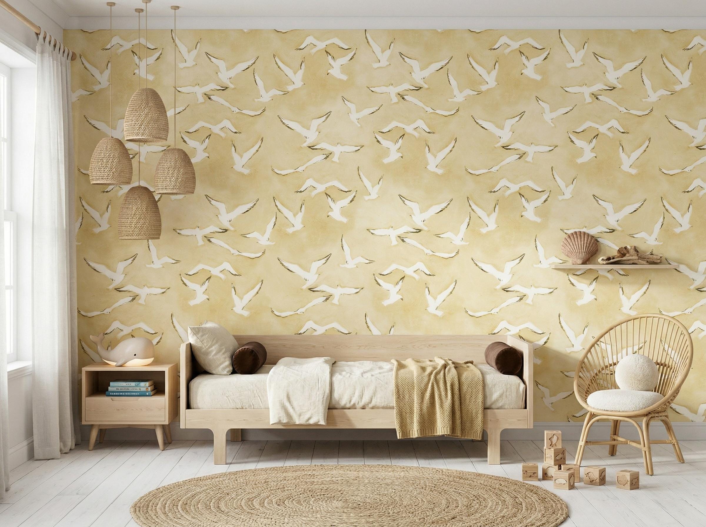 Watercolor Seagull Wallpaper - Kids Nursery Coastal Beach House Wall Mural - (Peel and Stick / Traditional)