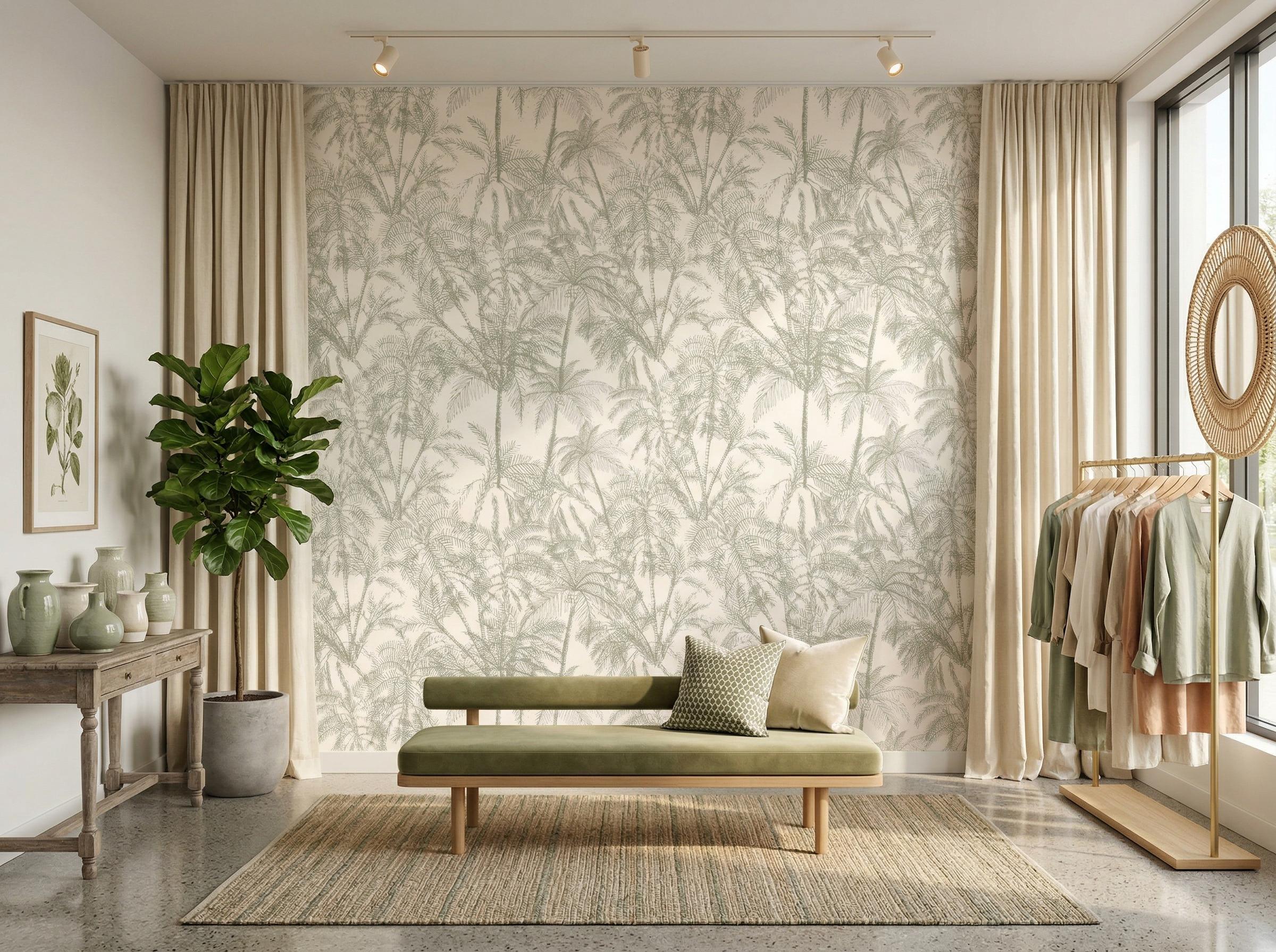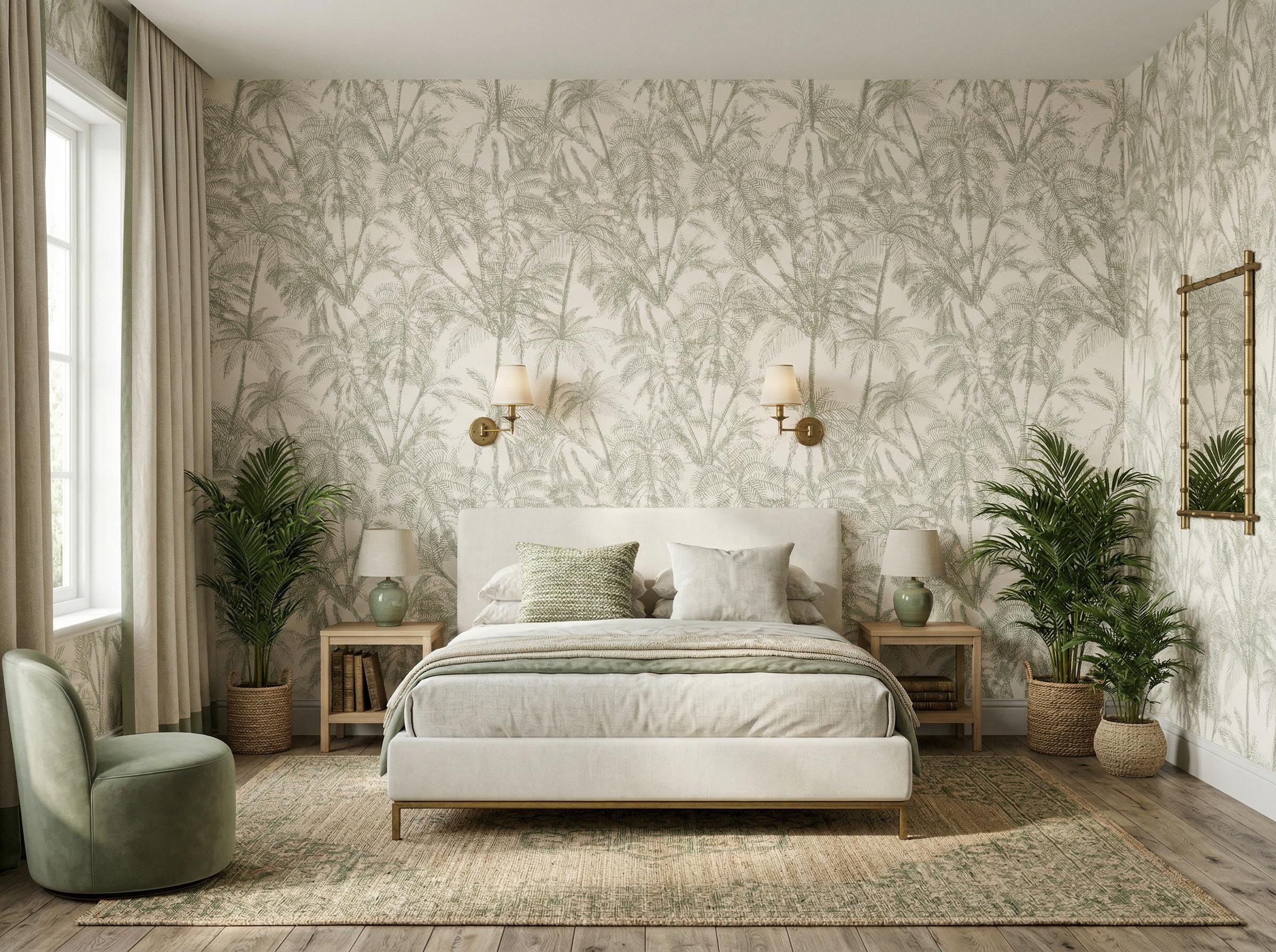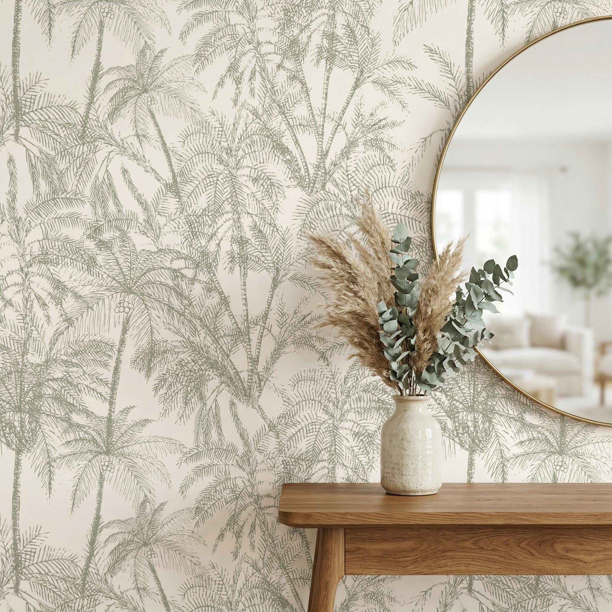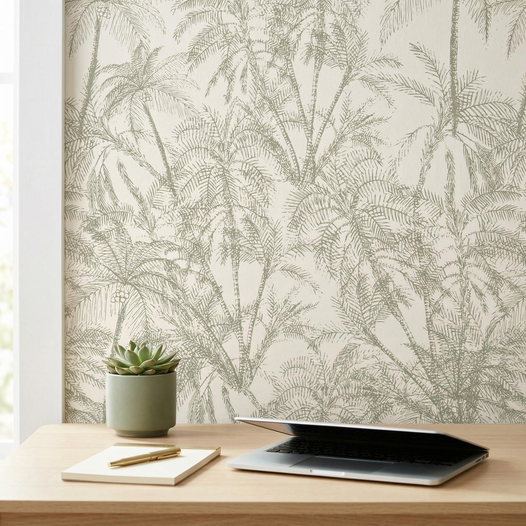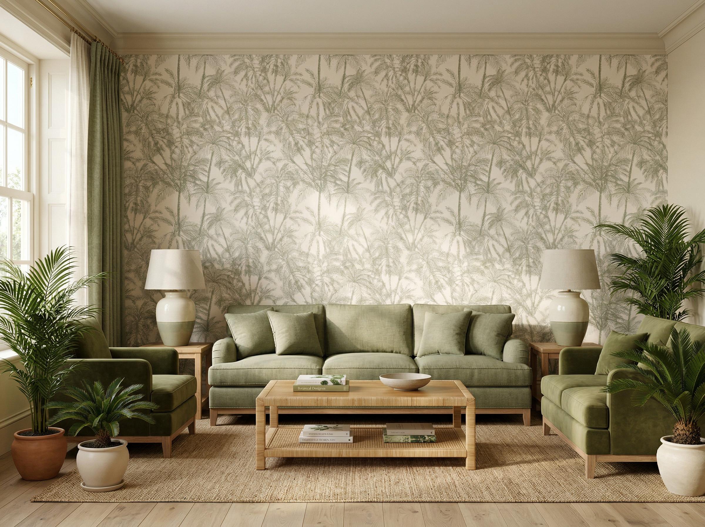 Create a calm, breezy atmosphere with this neutral palm tree wallpaper featuring soft green botanical illustrations on a warm beige background. Designed for modern coastal, boho, and minimalist interiors, this tropical pattern brings subtle nature-inspired elegance into any space.