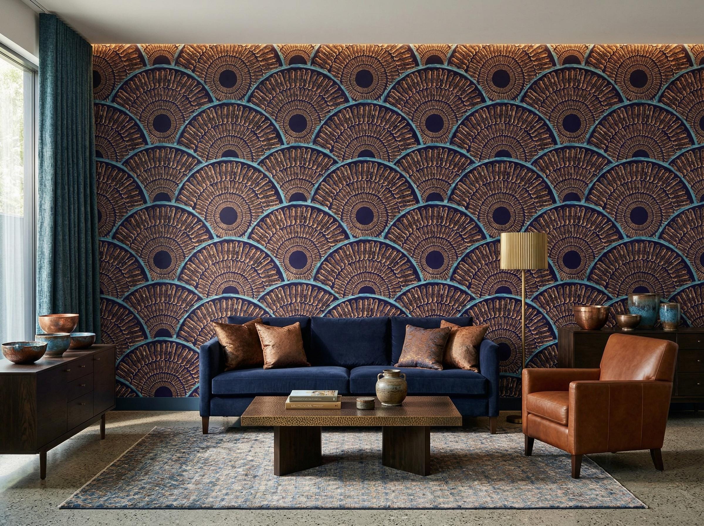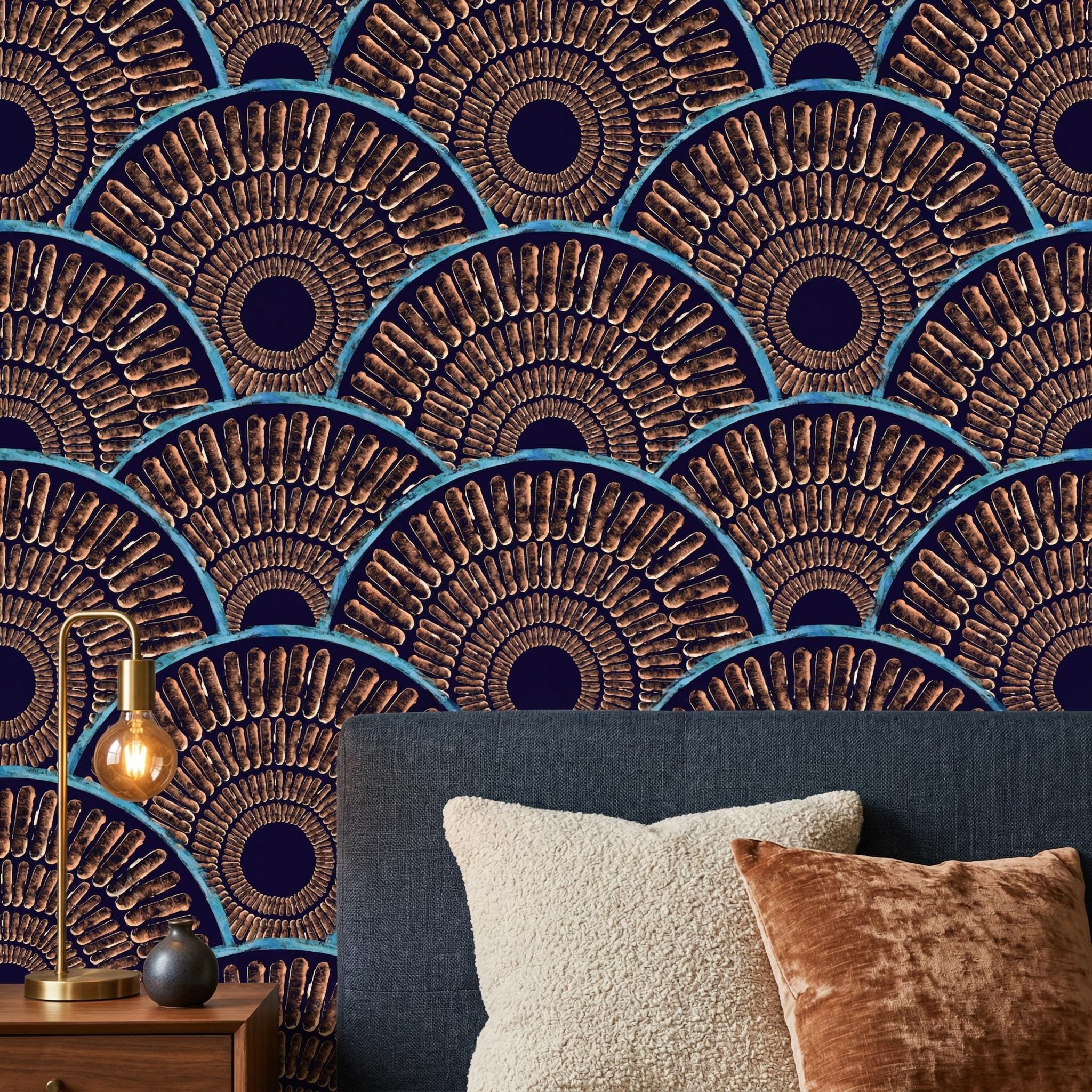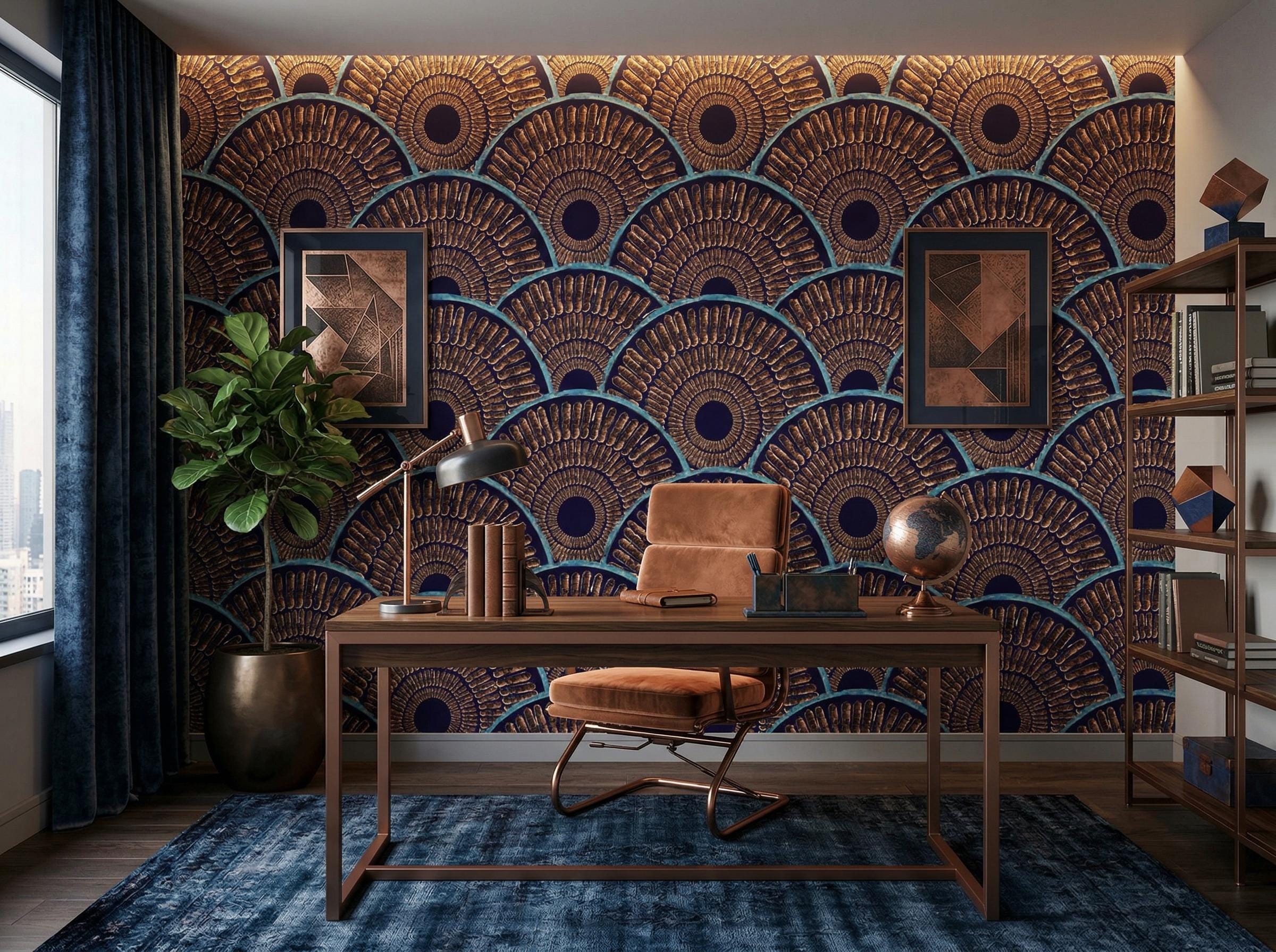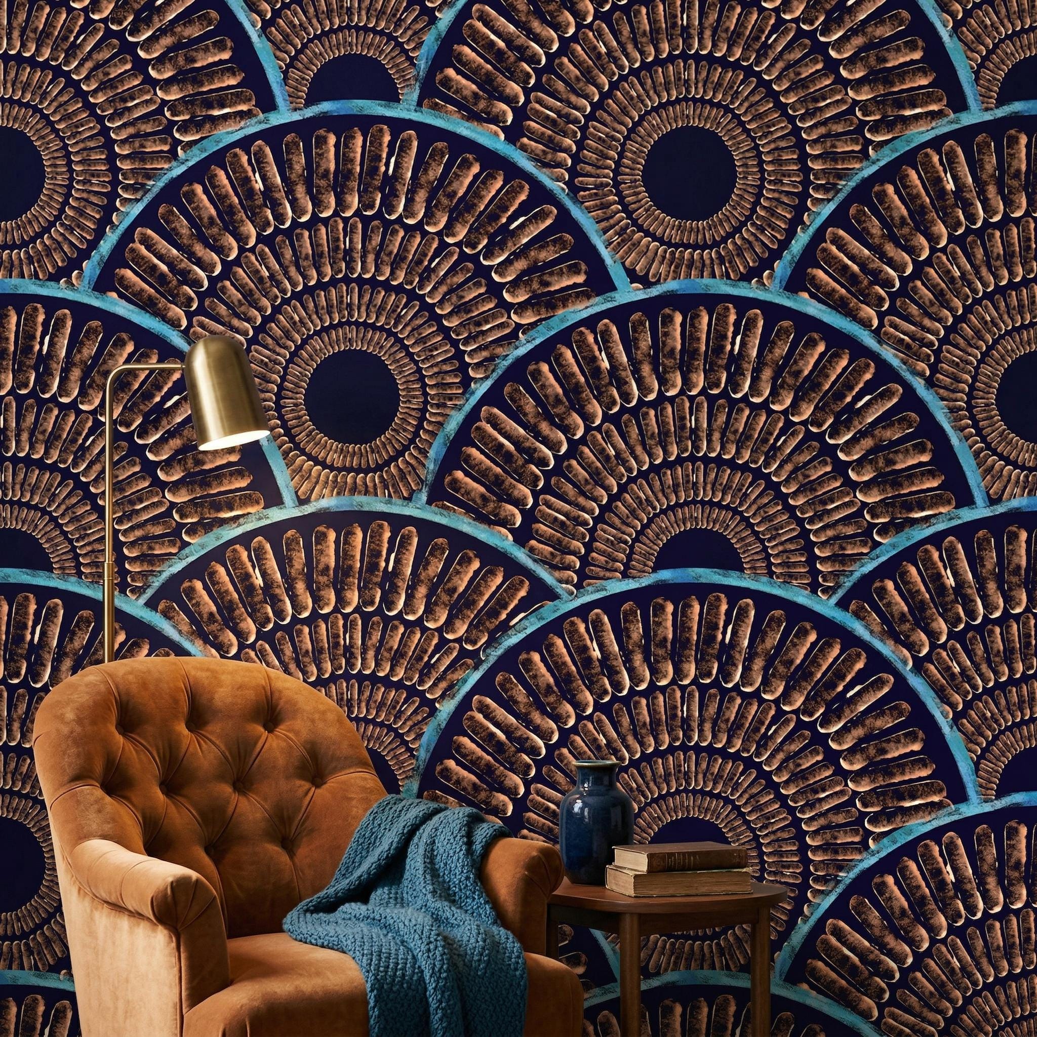 Transform your space with this stunning Art Deco gold fan wallpaper featuring bold geometric patterns in rich navy blue and metallic tones. Inspired by vintage glamour and luxury interiors, this design adds depth, texture, and sophistication to any modern or classic space.