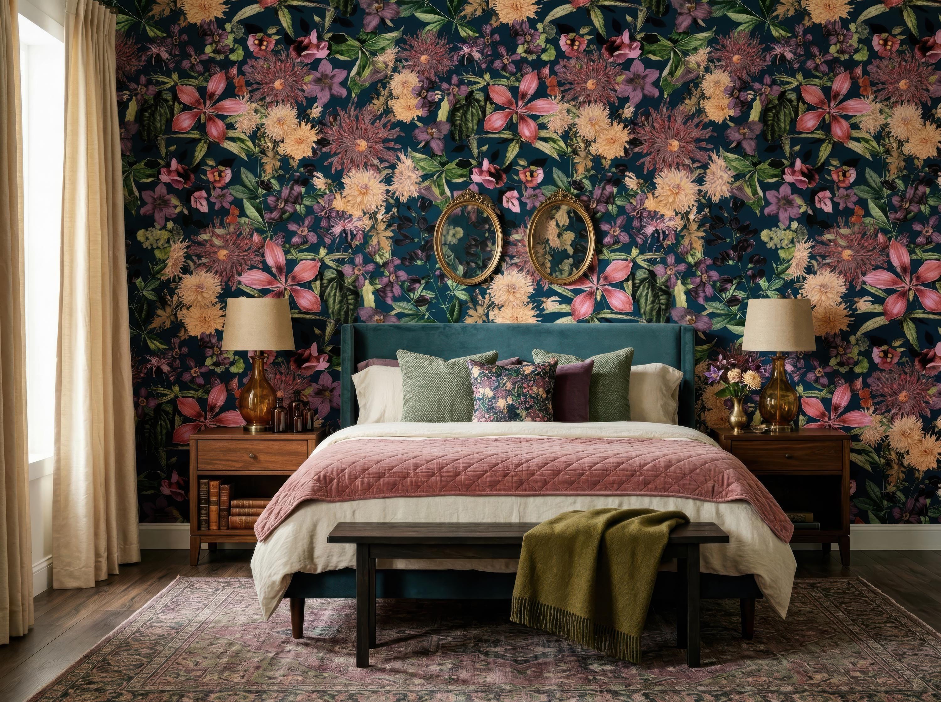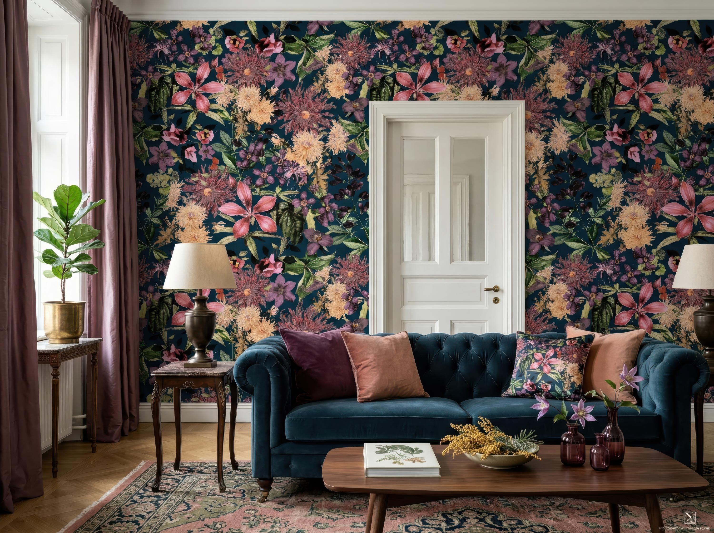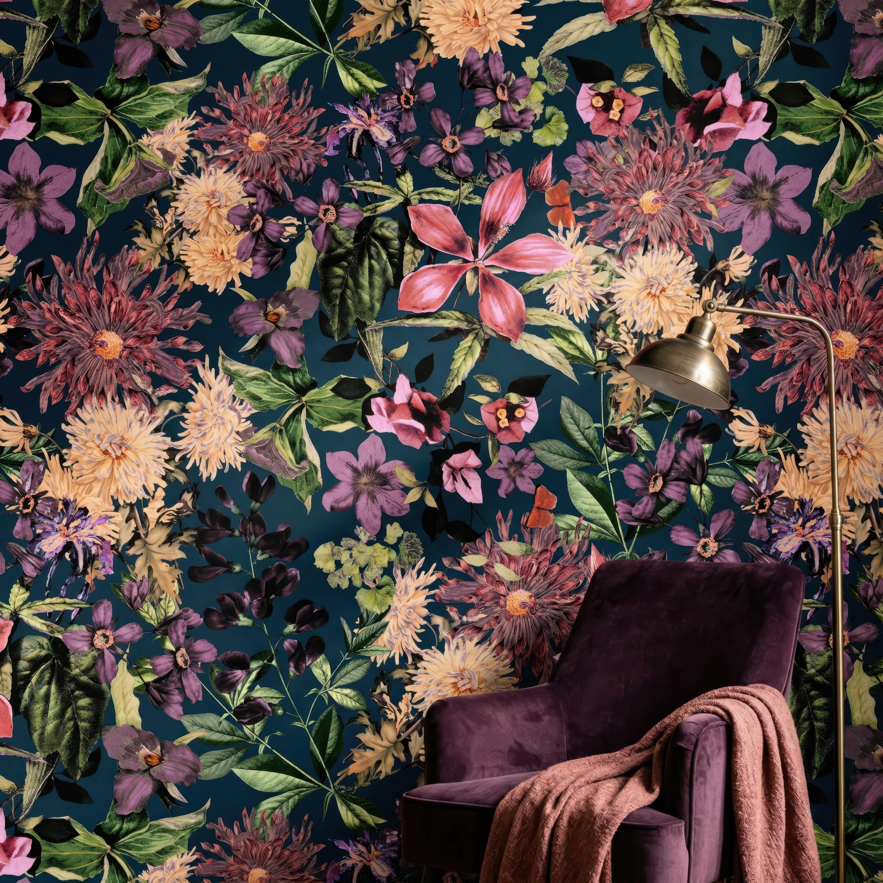 Make a bold statement with this dark floral wallpaper featuring richly detailed blooms set against a deep teal background. Perfect for maximalist interiors and vintage-inspired spaces, this dramatic botanical pattern adds depth, elegance, and artistic flair to any room.