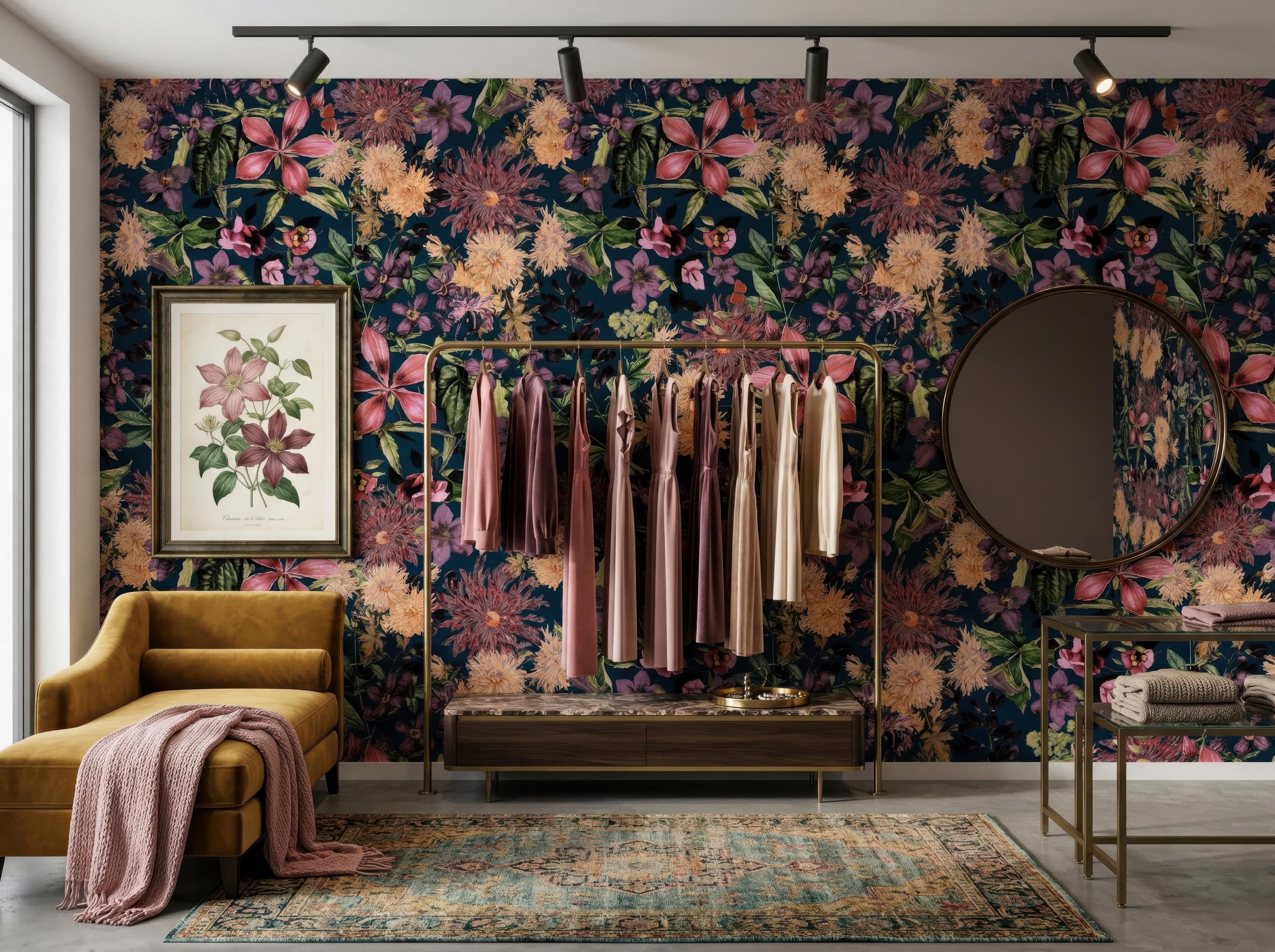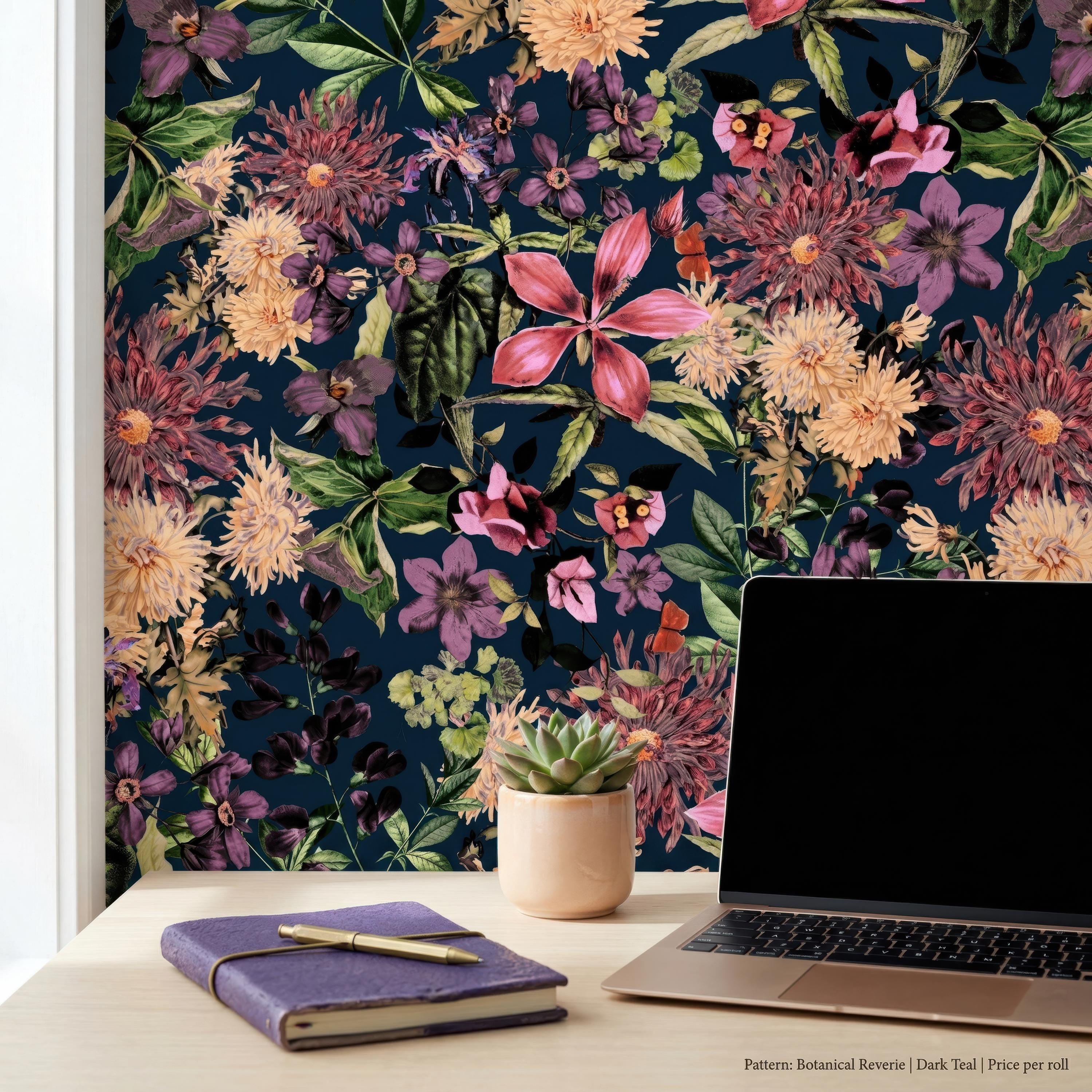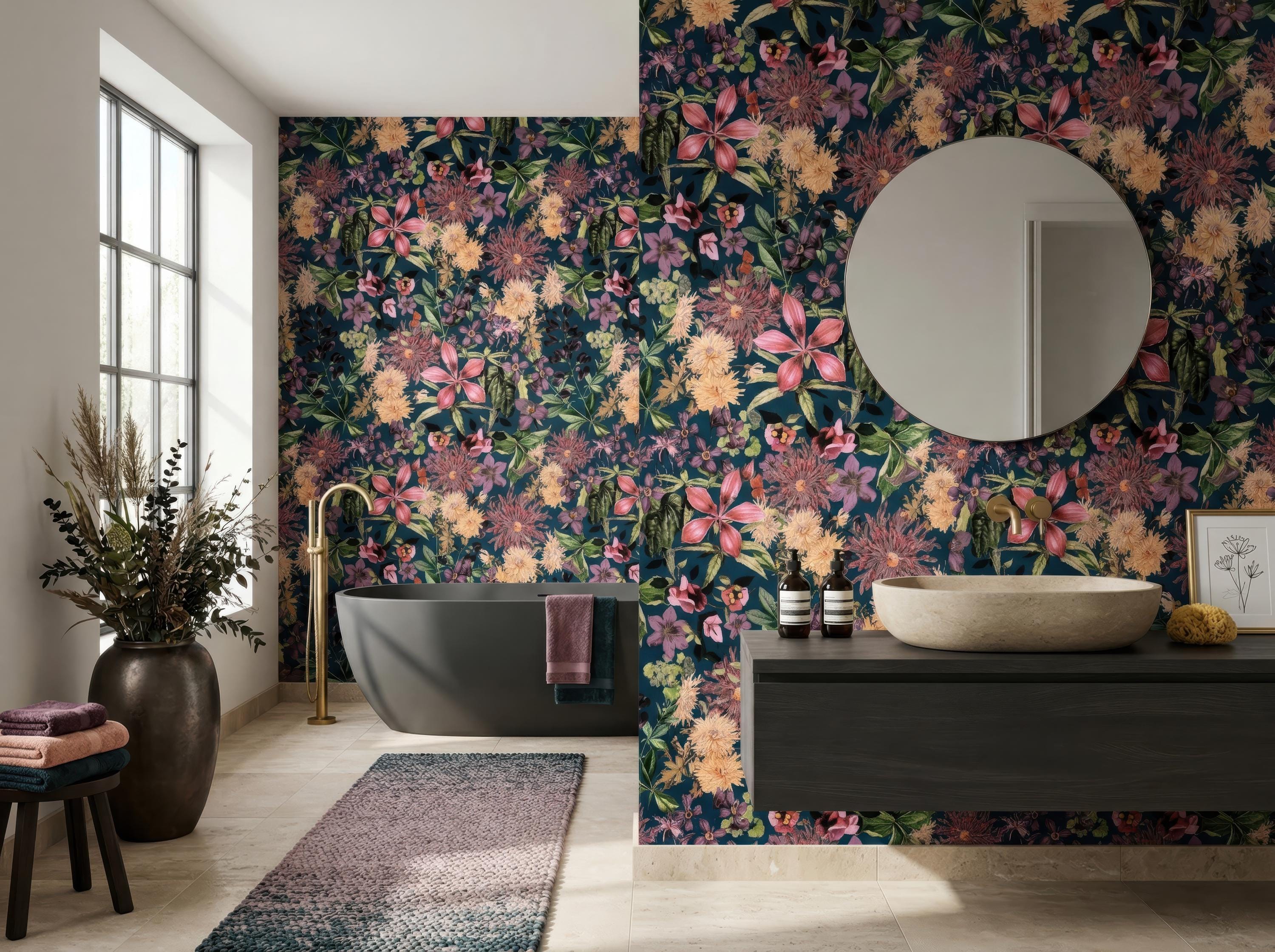 Make a bold statement with this dark floral wallpaper featuring richly detailed blooms set against a deep teal background. Perfect for maximalist interiors and vintage-inspired spaces, this dramatic botanical pattern adds depth, elegance, and artistic flair to any room.