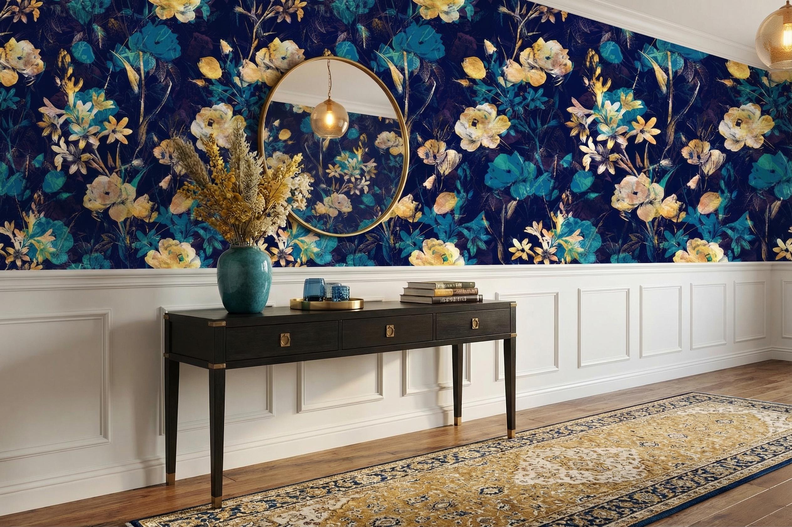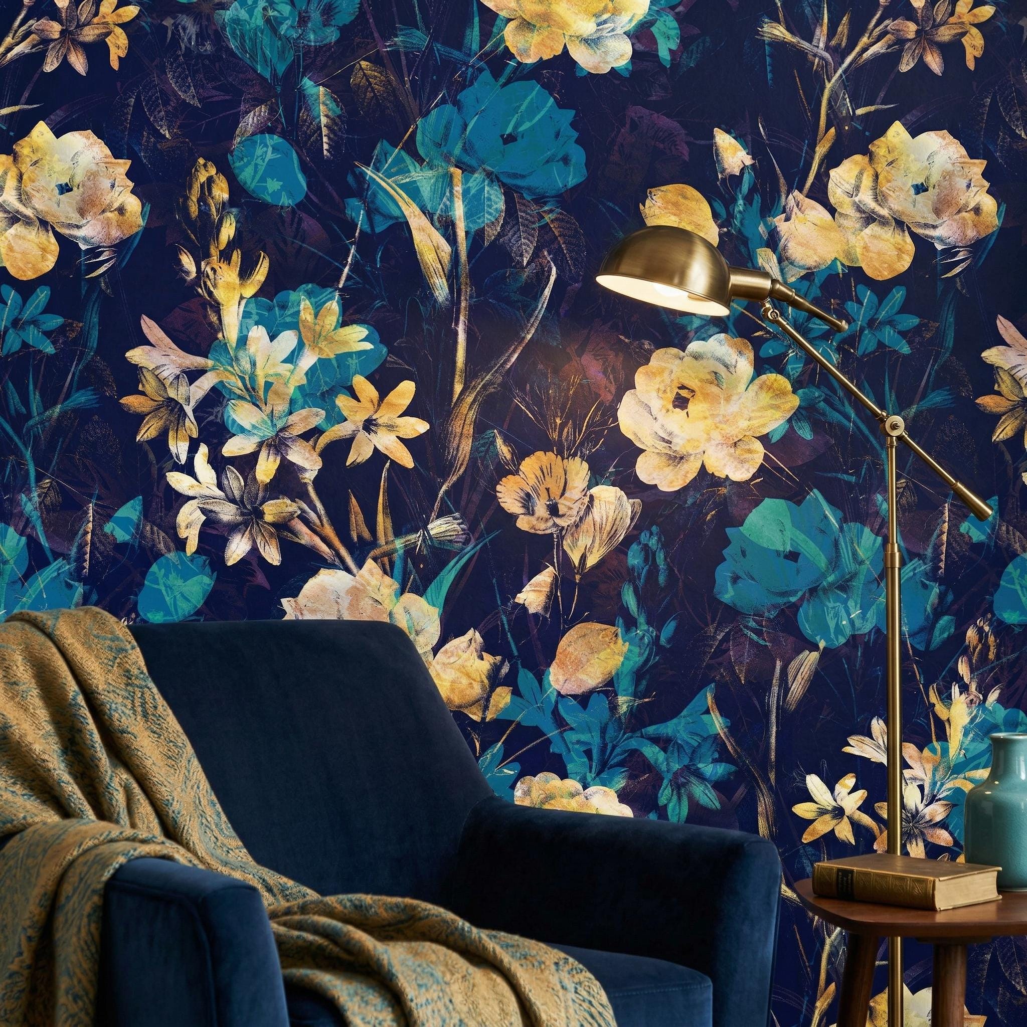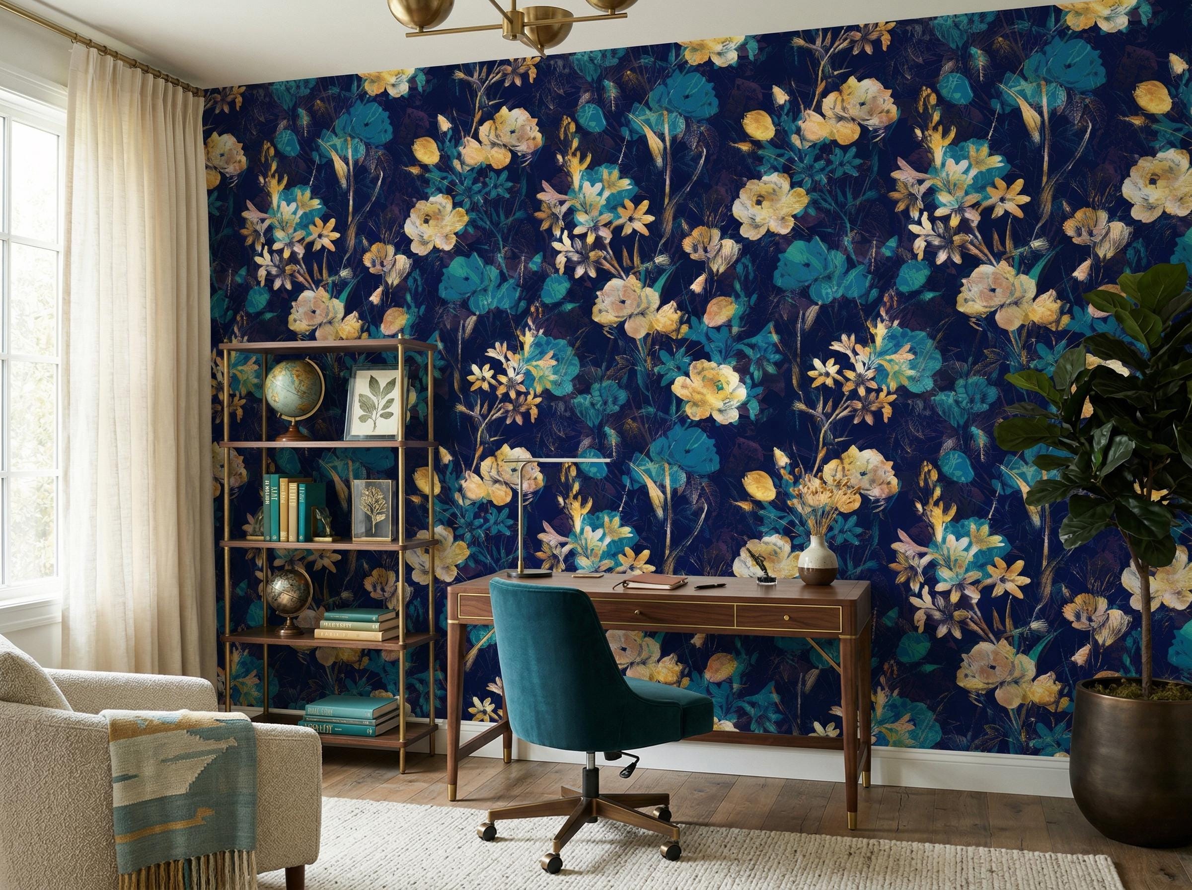 Add depth and elegance to your interiors with this teal and gold floral wallpaper featuring rich botanical details on a dark blue background. This sophisticated design blends vintage charm with modern luxury, making it perfect for statement walls and refined spaces.