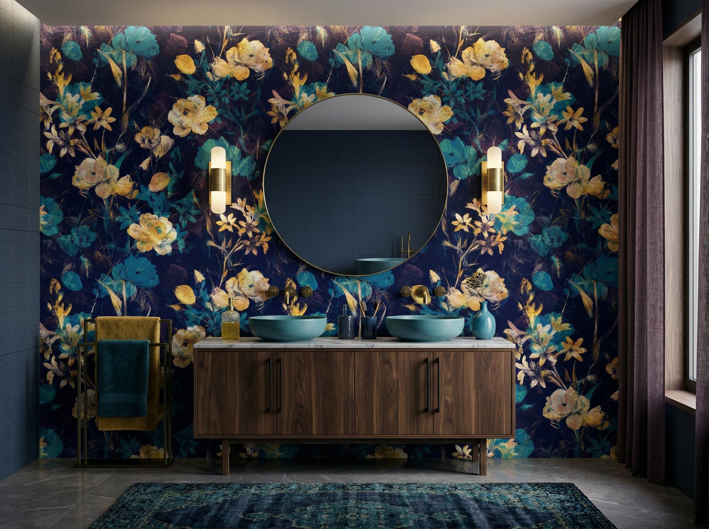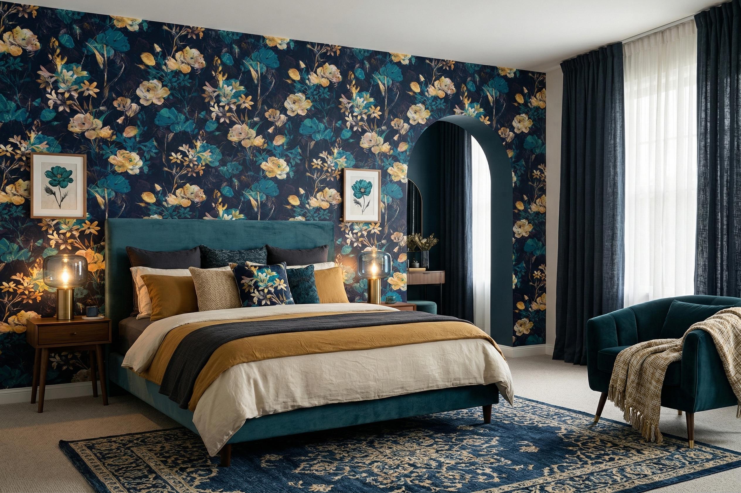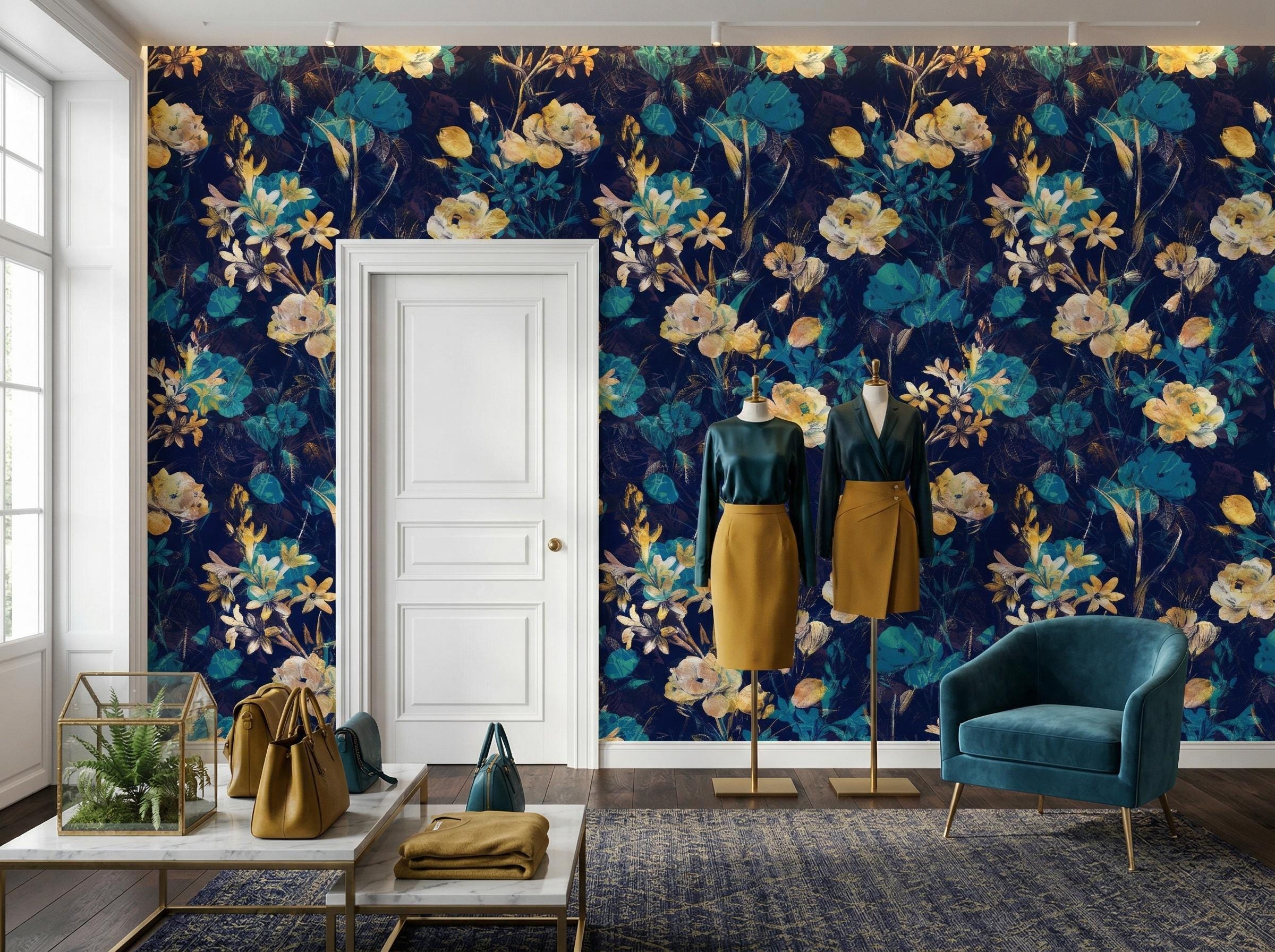 Add depth and elegance to your interiors with this teal and gold floral wallpaper featuring rich botanical details on a dark blue background. This sophisticated design blends vintage charm with modern luxury, making it perfect for statement walls and refined spaces.
