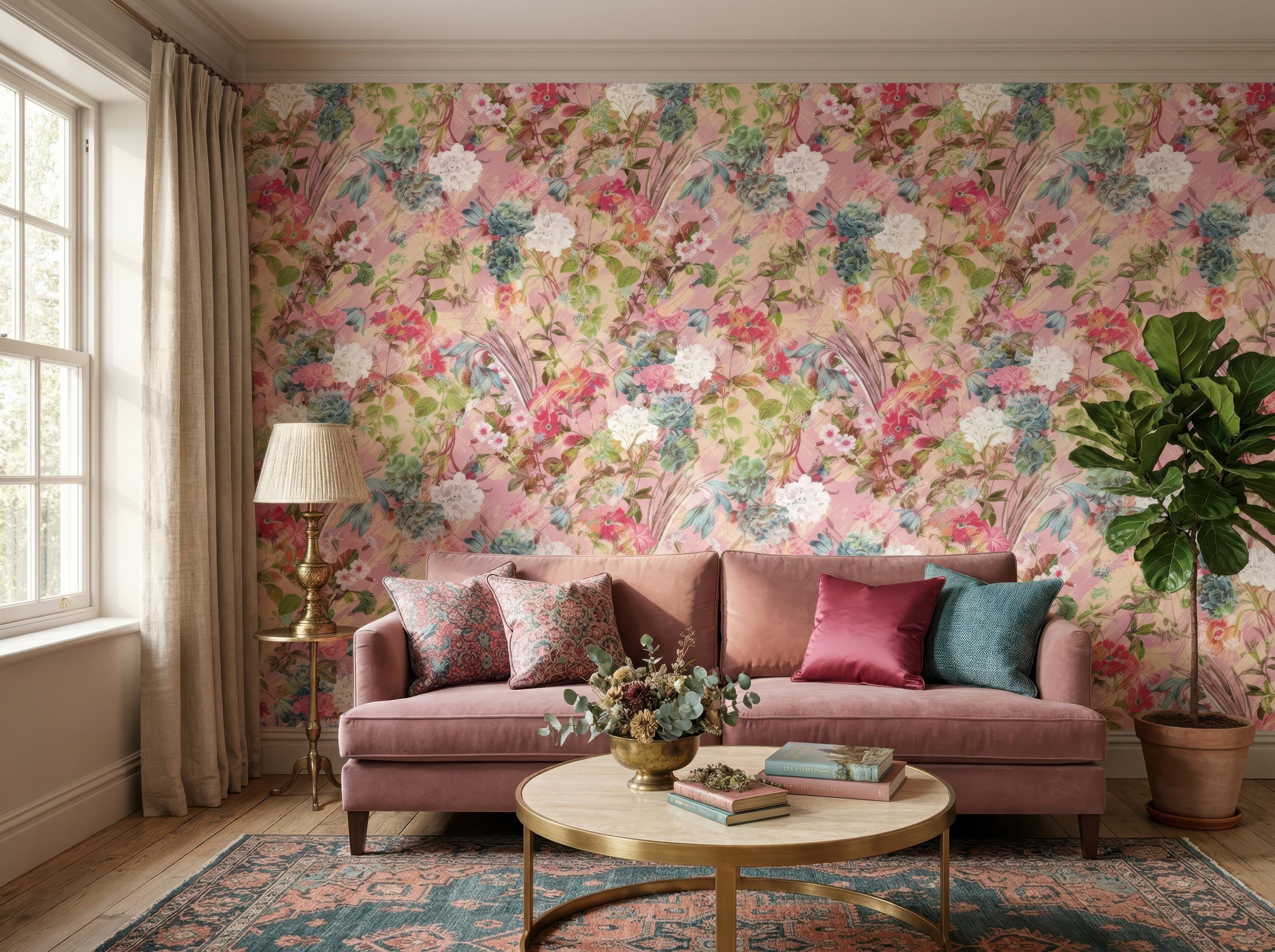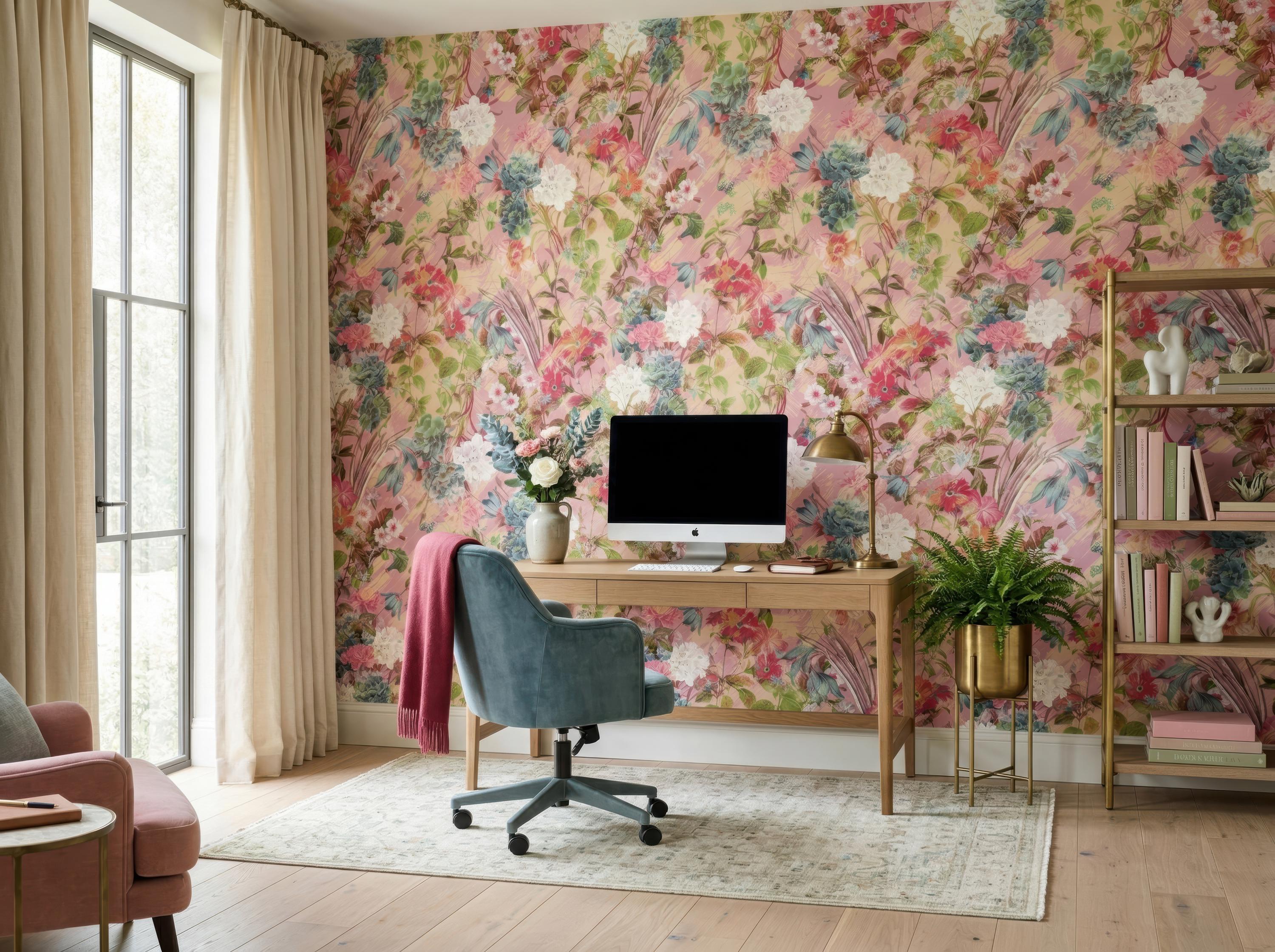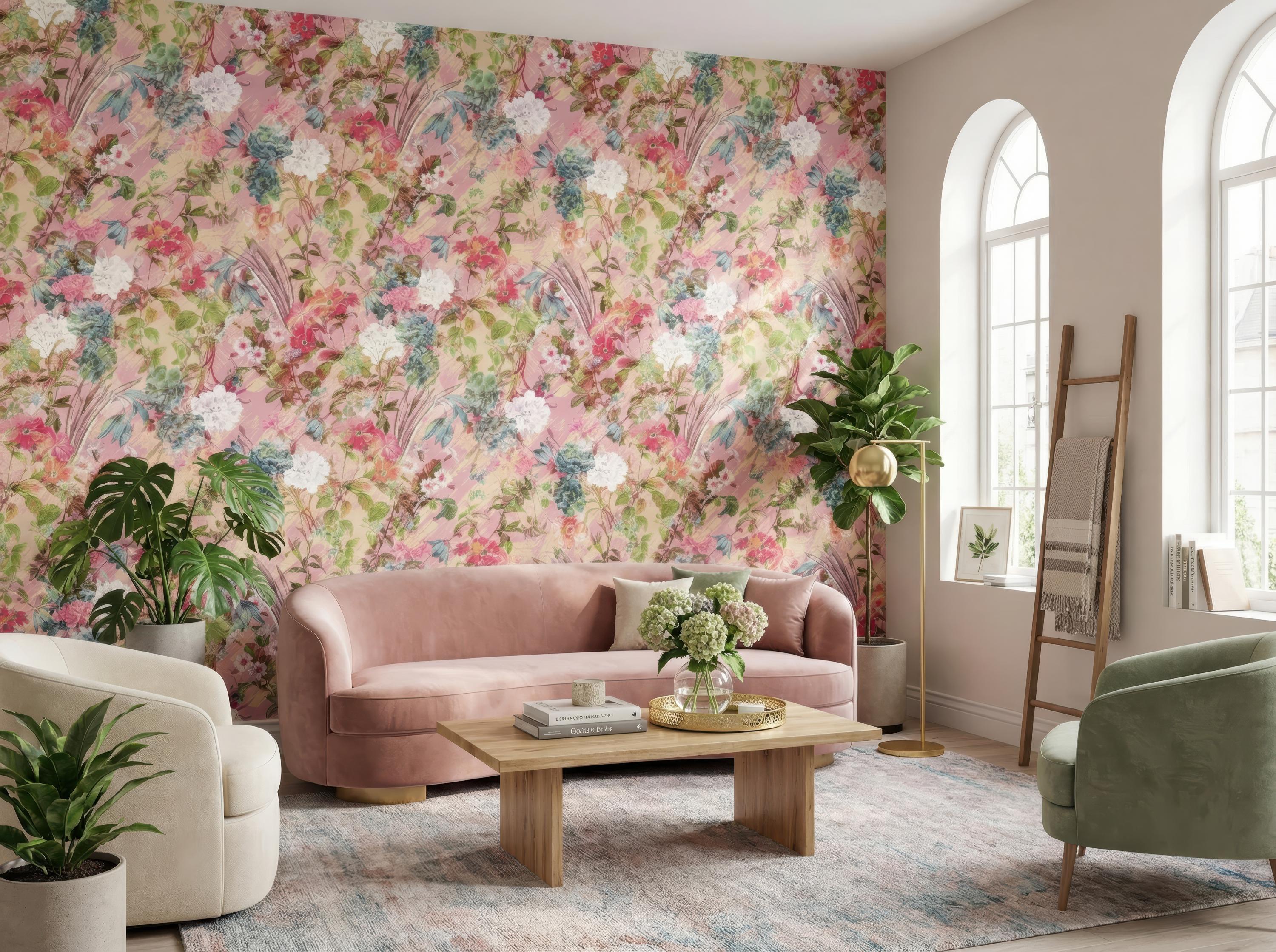 Bring a soft and romantic atmosphere to your space with this blush pink floral wallpaper featuring delicate botanical elements and painterly textures. Designed to create a light, elegant, and inviting ambiance, this wallpaper is perfect for feminine interiors and stylish statement walls.