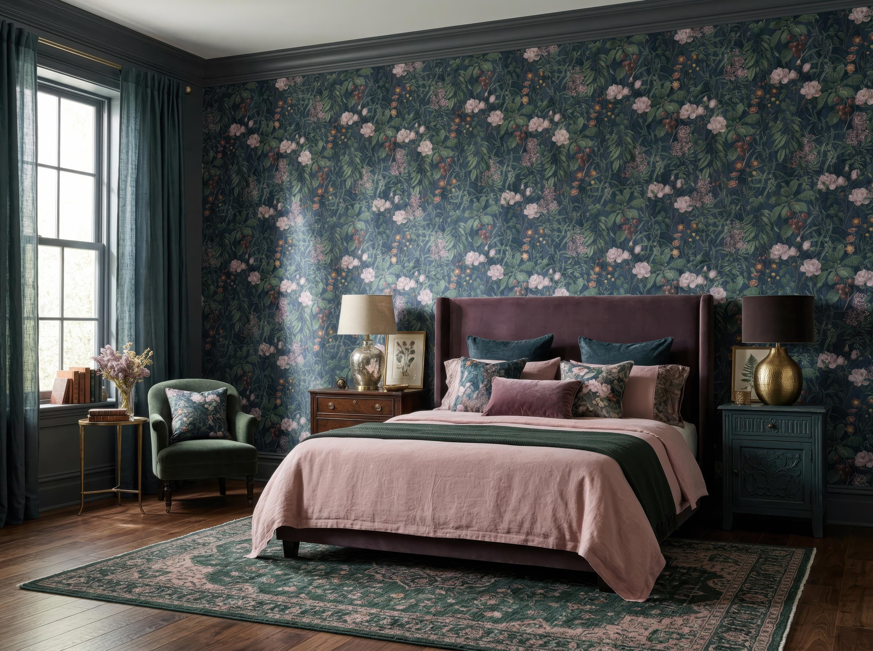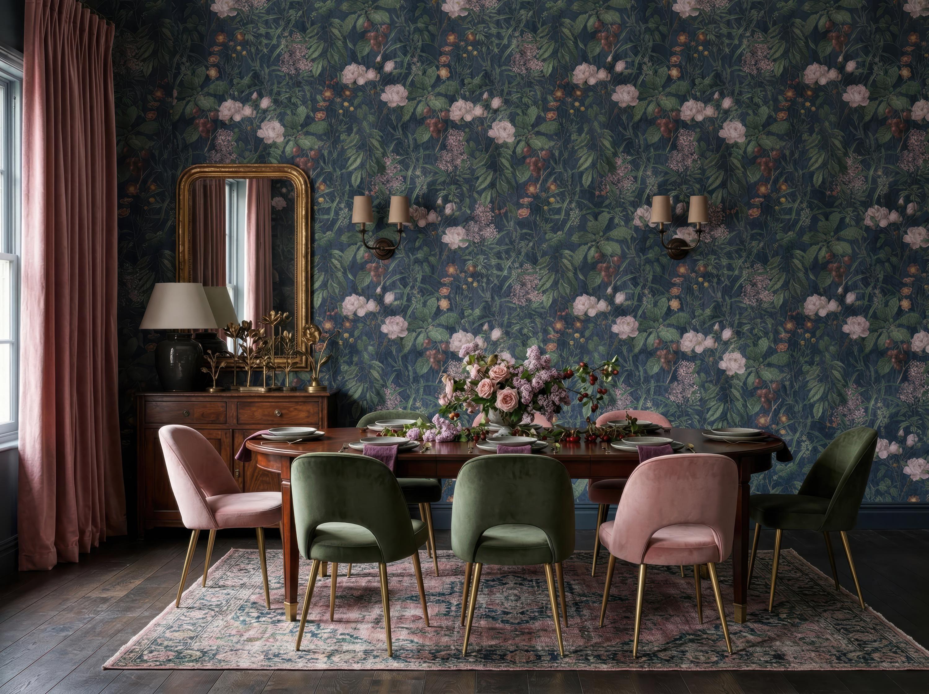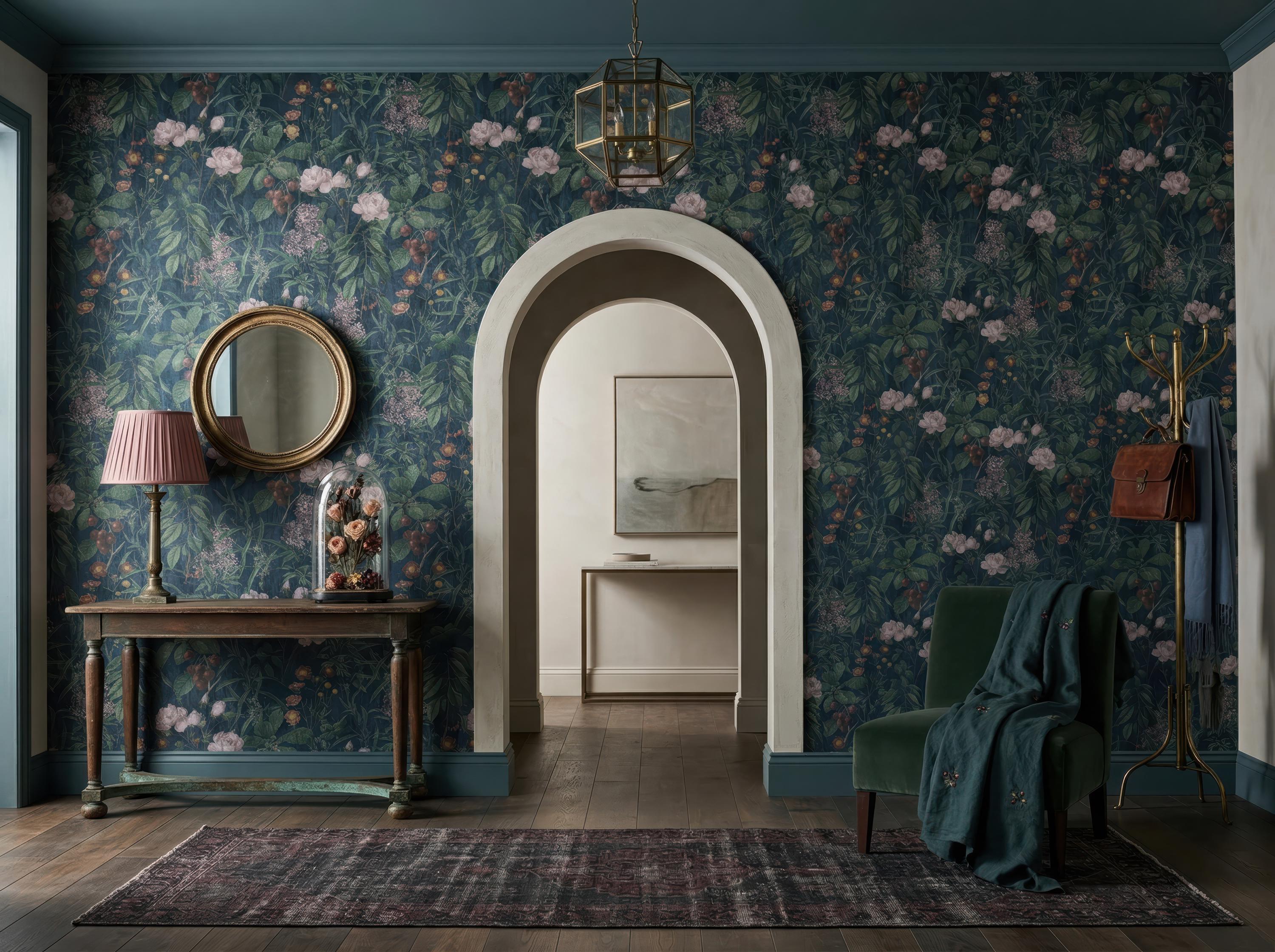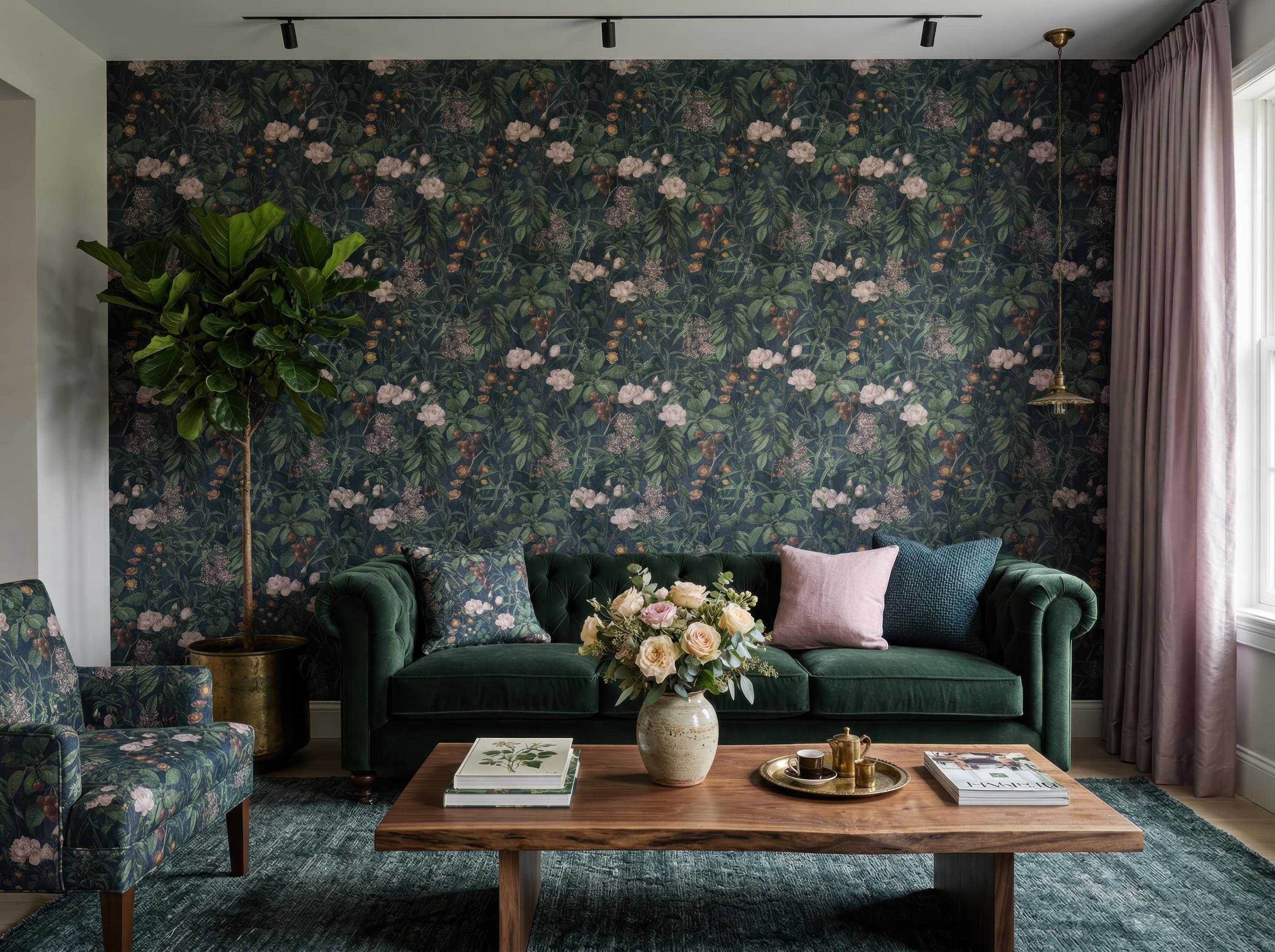 Transform your space with this luxurious dark botanical wallpaper featuring rich green foliage, soft blush florals, and an elegant vintage-inspired design. Perfect for creating a moody, sophisticated atmosphere, this floral wallpaper adds depth and timeless charm to any interior.