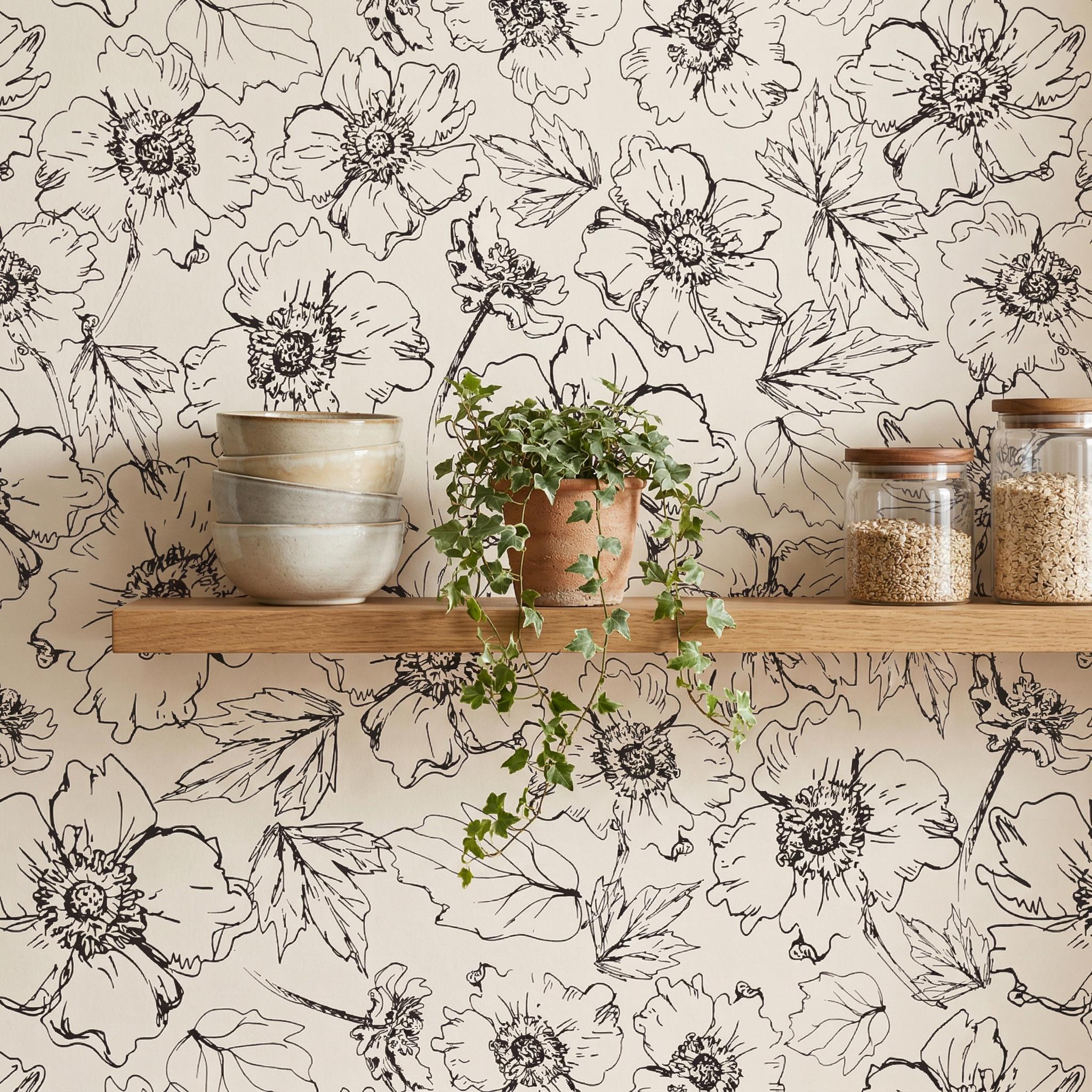 Black White Floral Wallpaper Japanese Anemone Sketch Design, Minimalist Botanical (Peel and Stick or Traditional)