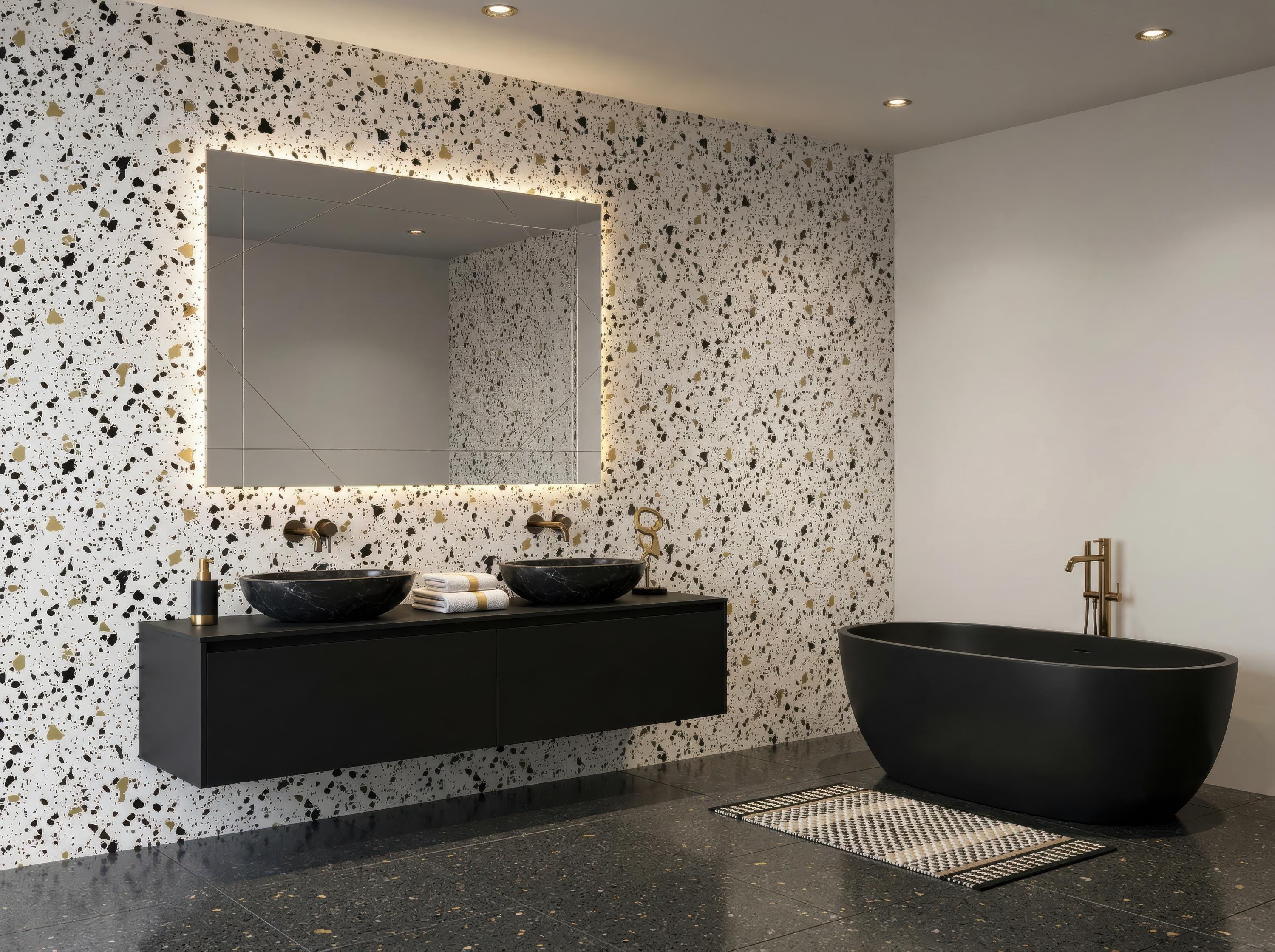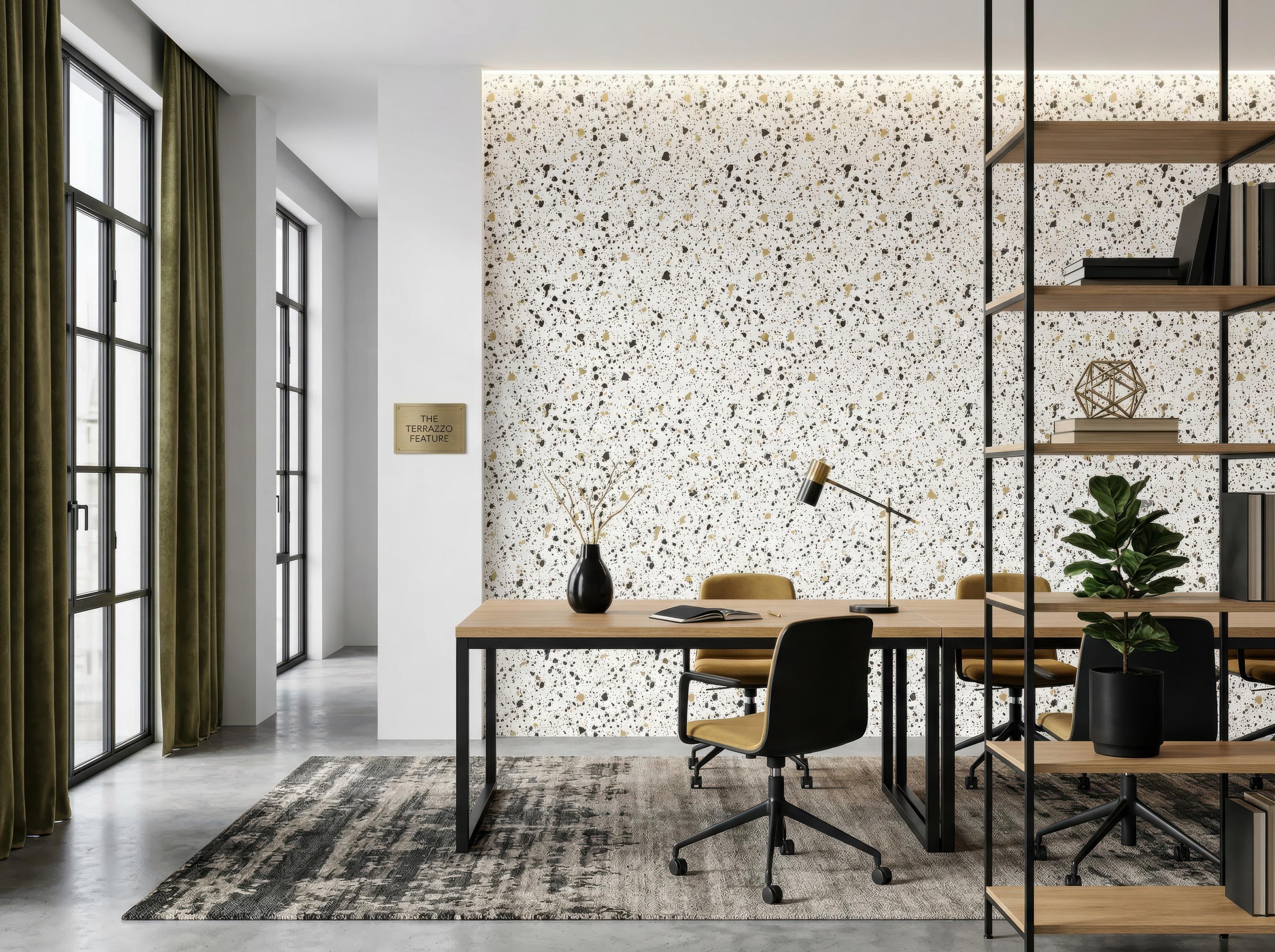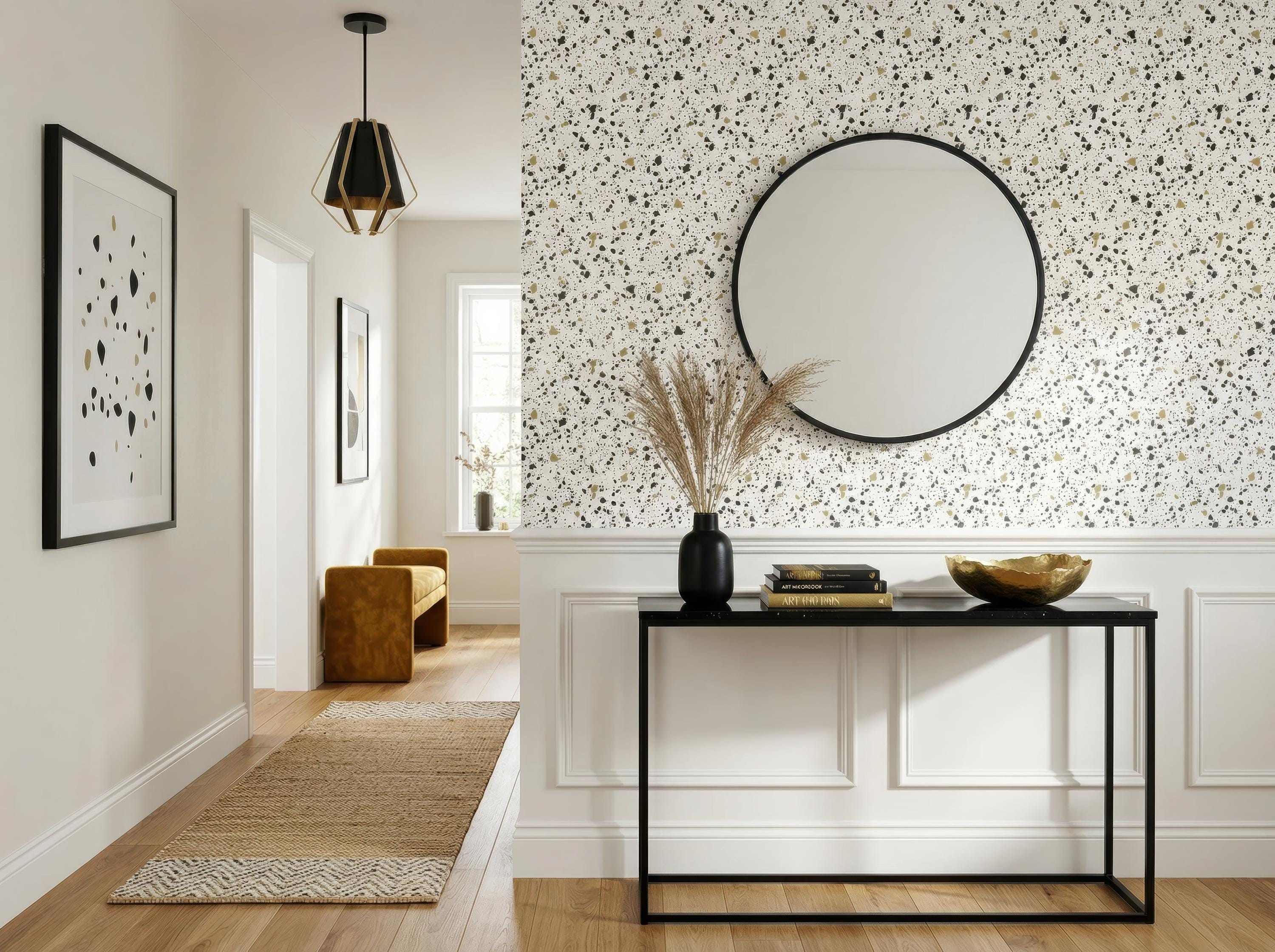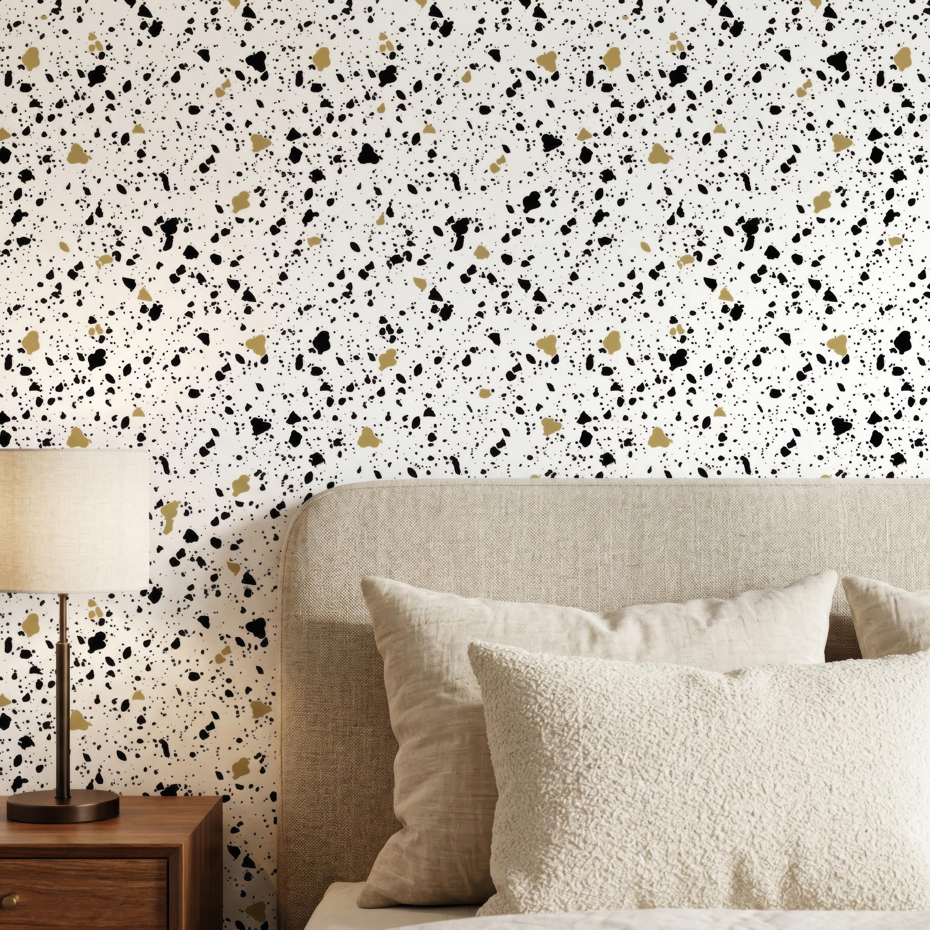 Upgrade your interior with this terrazzo wallpaper featuring a stylish speckled pattern in neutral tones with black and gold accents available in 4 different color . Perfect for modern, minimalist, and Scandinavian-inspired spaces.