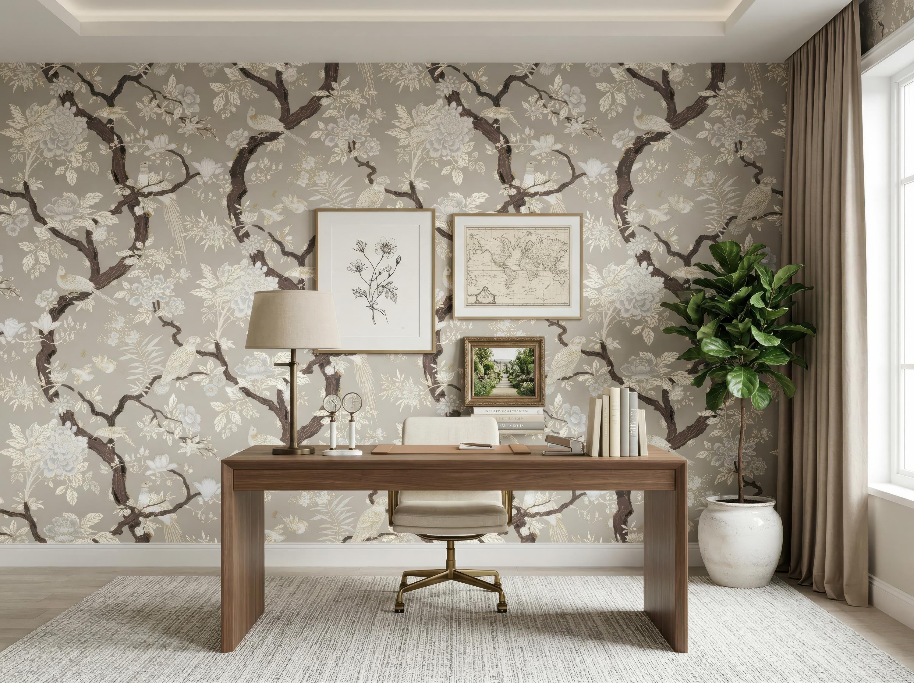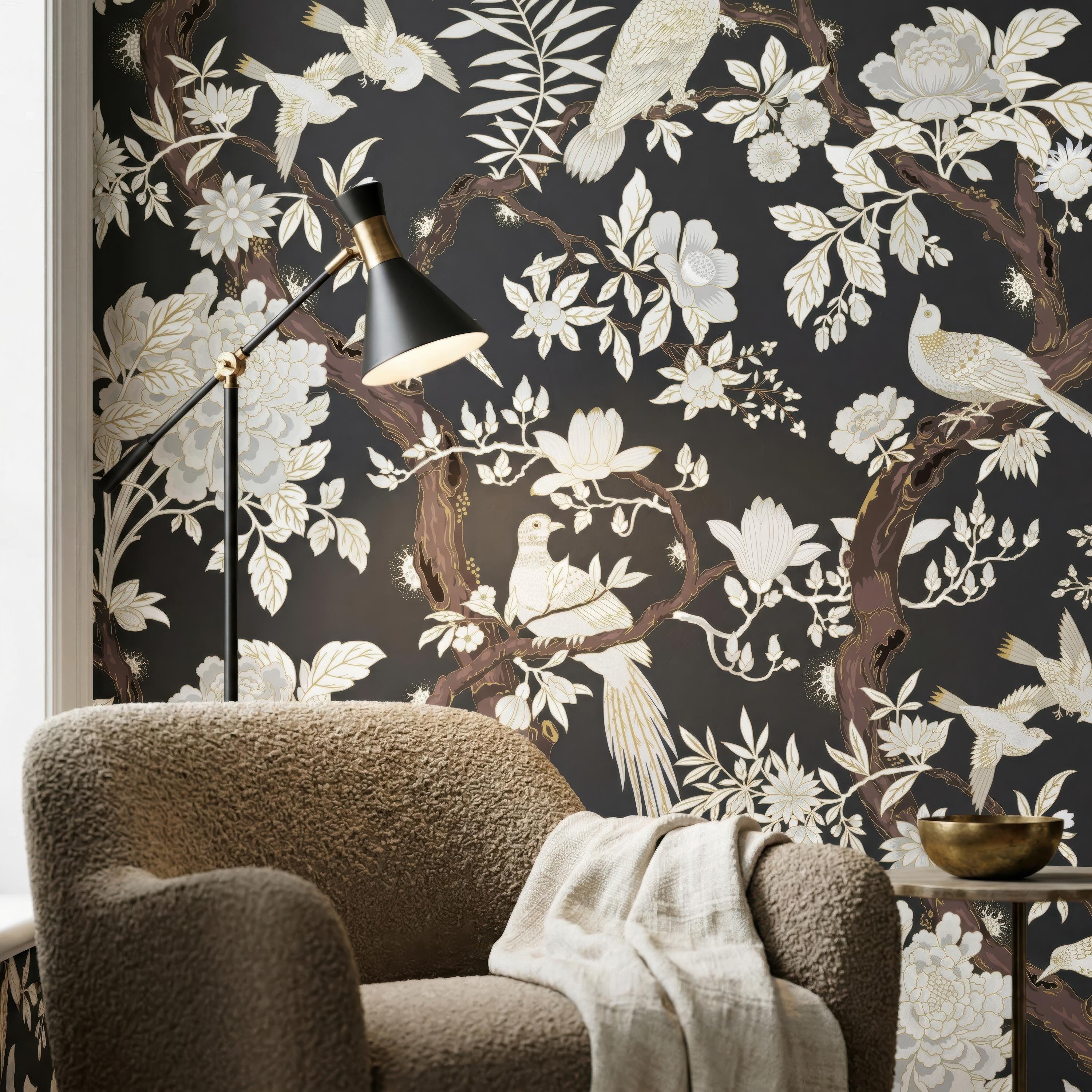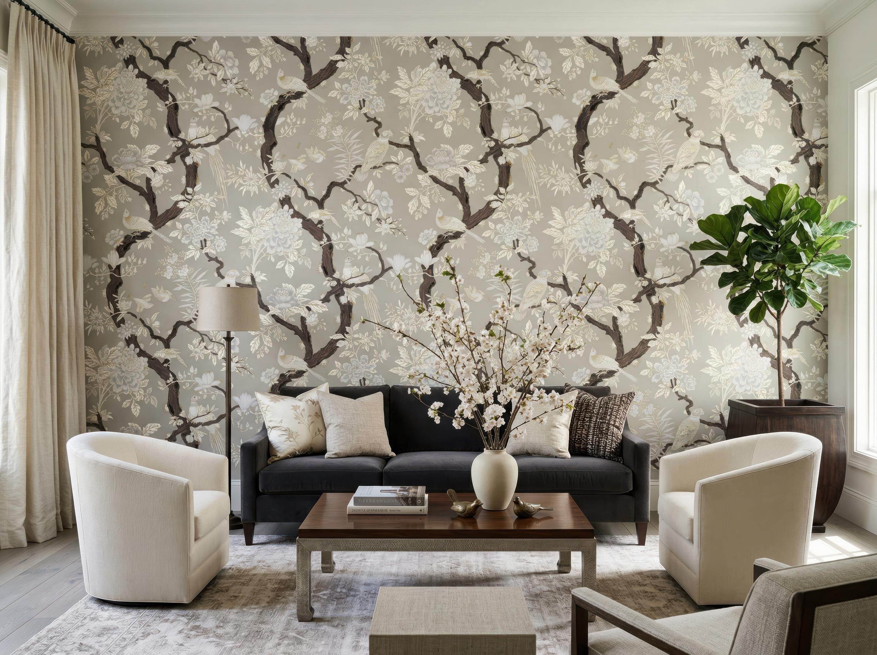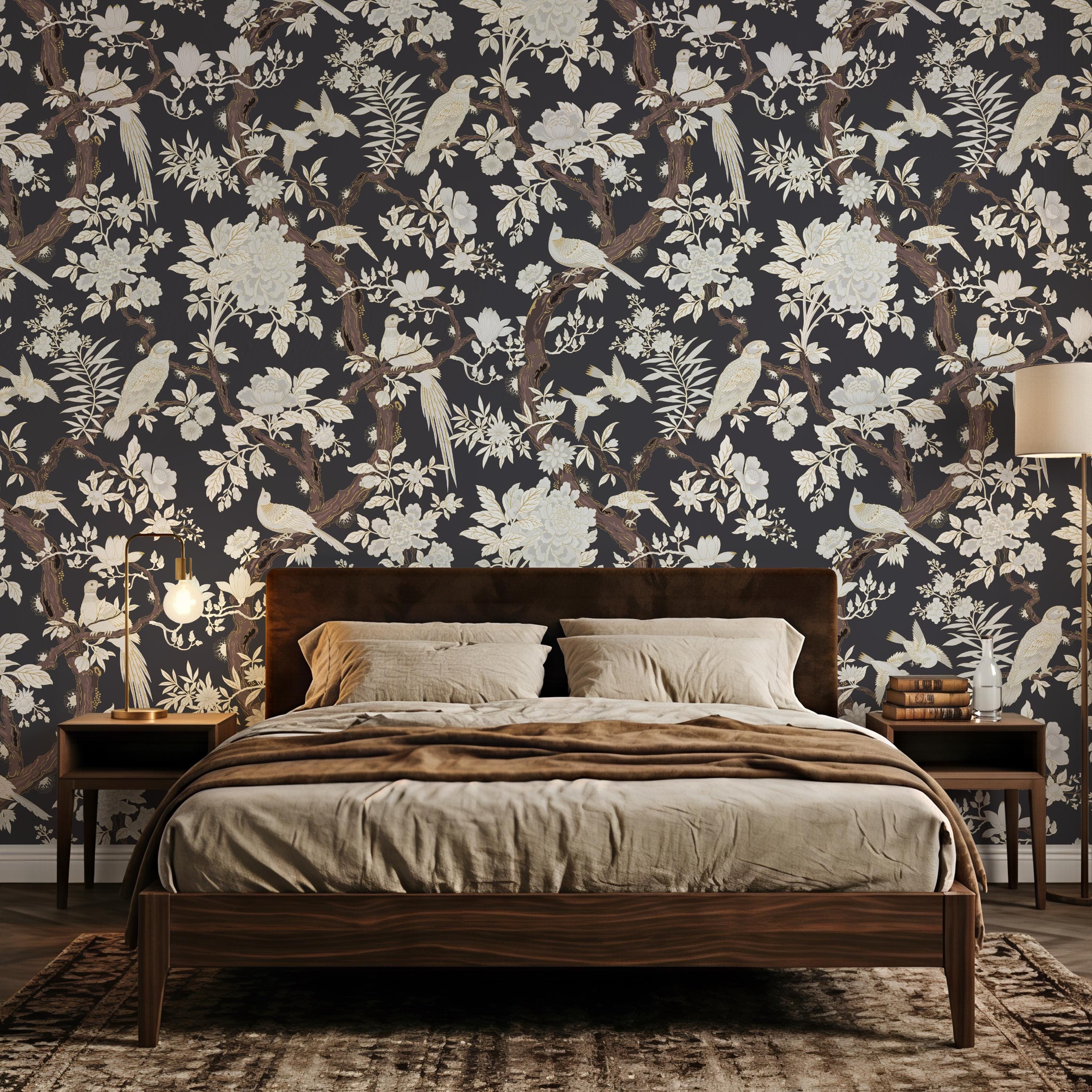 Elegant chinoiserie bird and floral wallpaper featuring detailed branches on a dark or soft neutral background. Available as peel and stick removable wallpaper or traditional non-woven for a refined finish. Perfect for moody bathrooms, bedrooms, and sophisticated luxury interiors. Available in 5 versatile background color options.