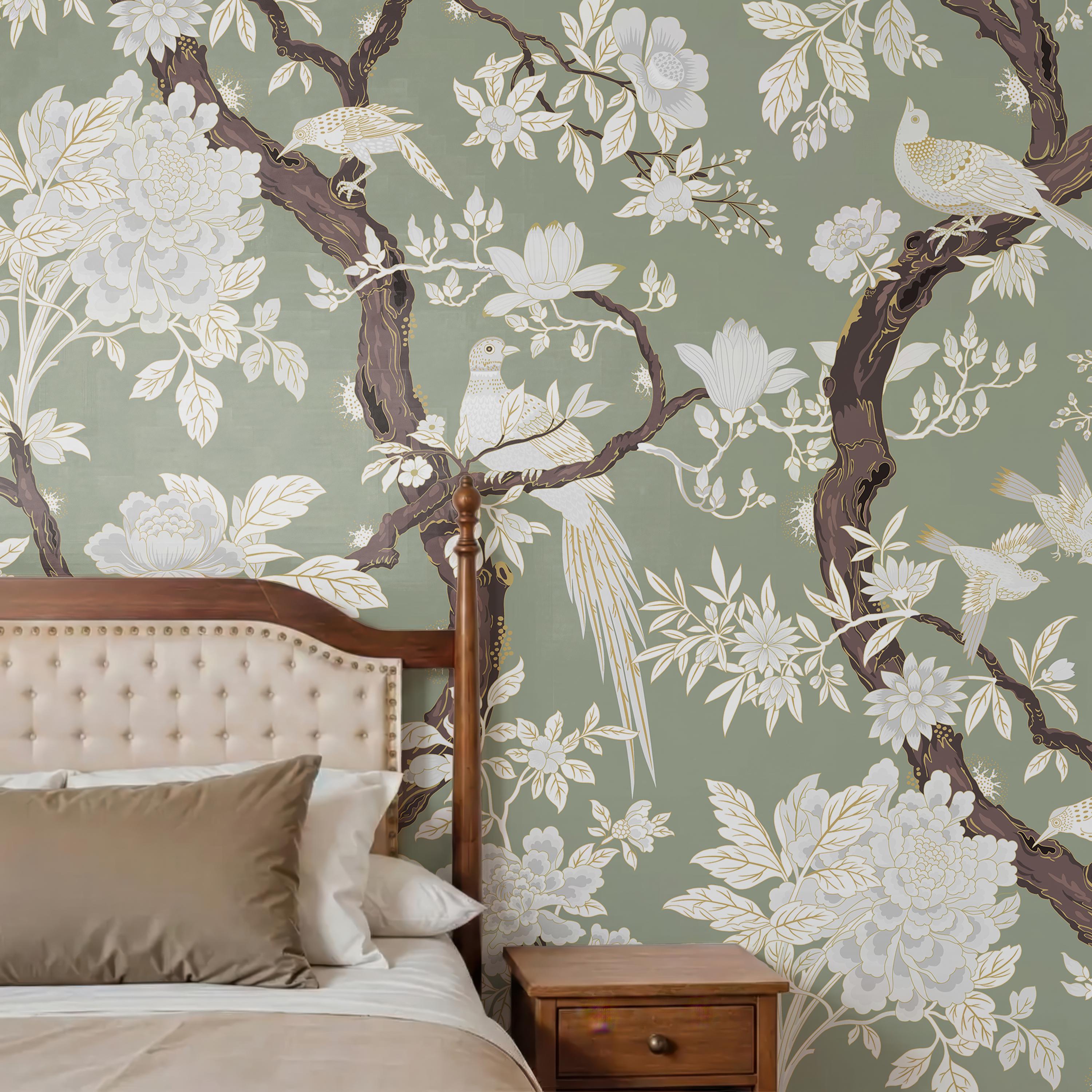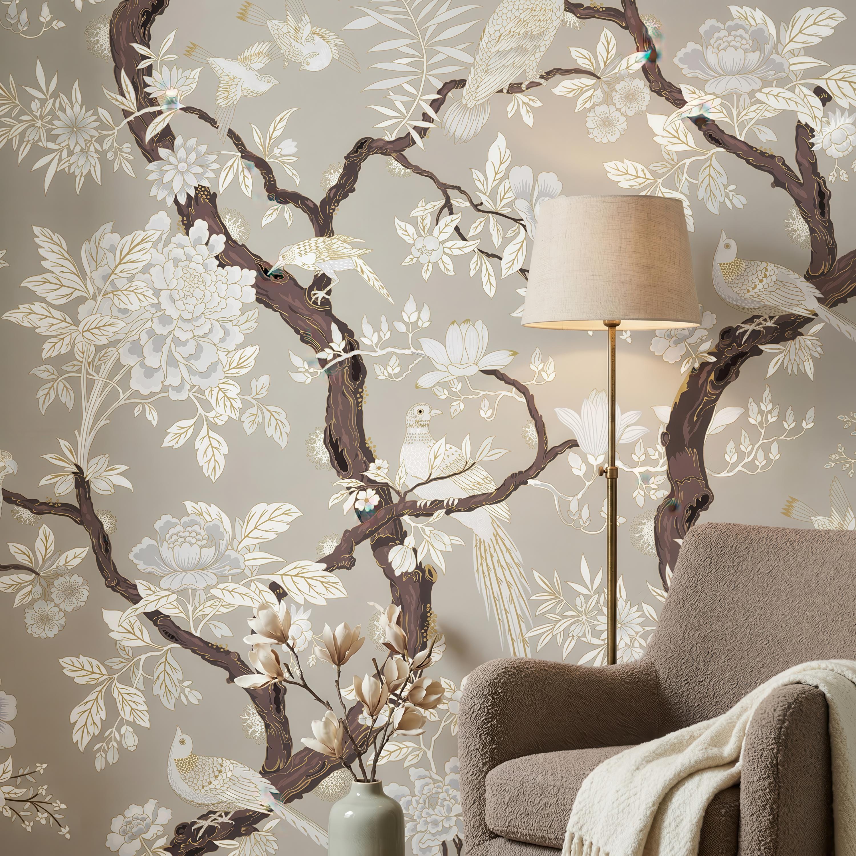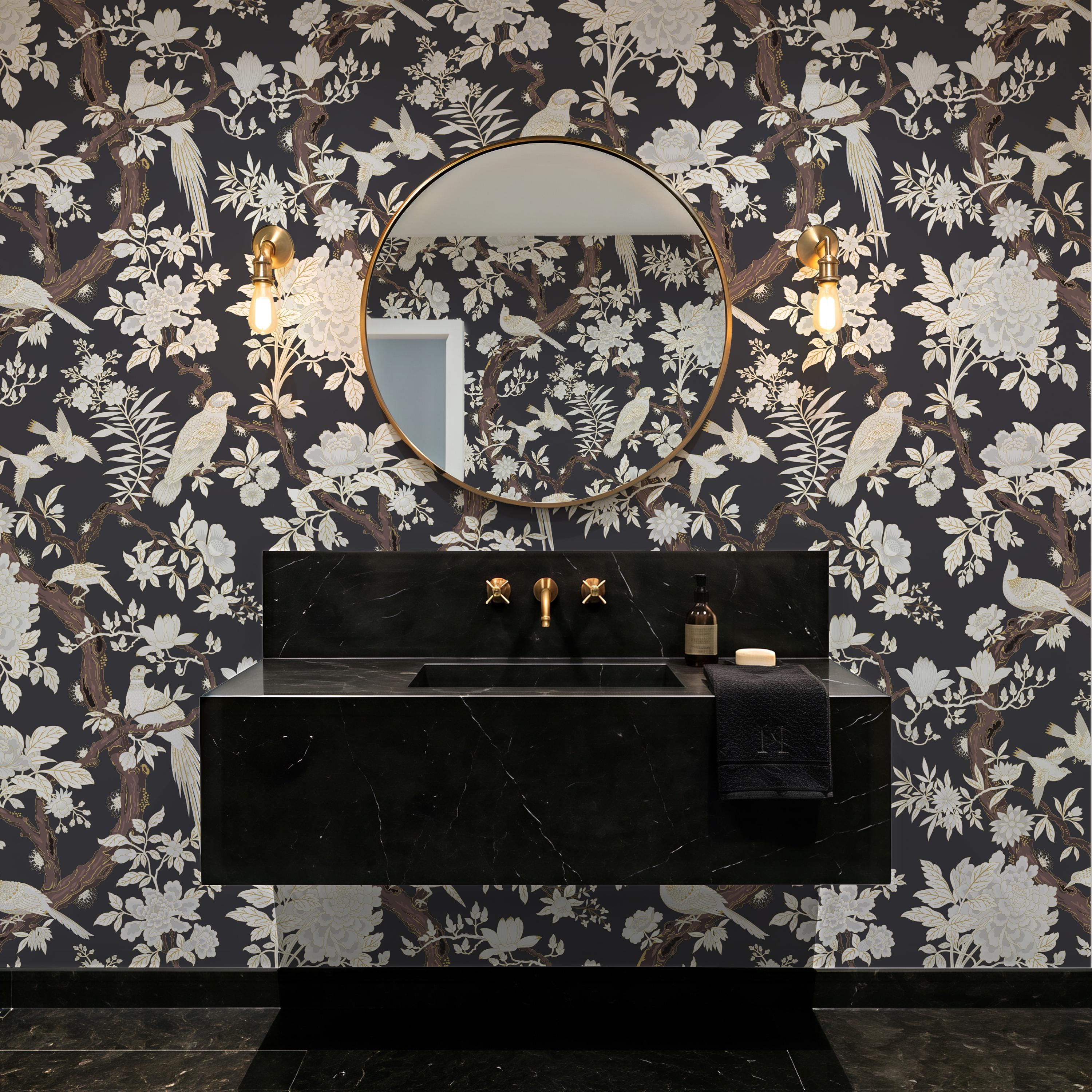 Elegant chinoiserie bird and floral wallpaper featuring detailed branches on a dark or soft neutral background. Available as peel and stick removable wallpaper or traditional non-woven for a refined finish. Perfect for moody bathrooms, bedrooms, and sophisticated luxury interiors. Available in 5 versatile background color options.