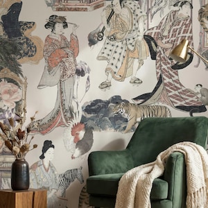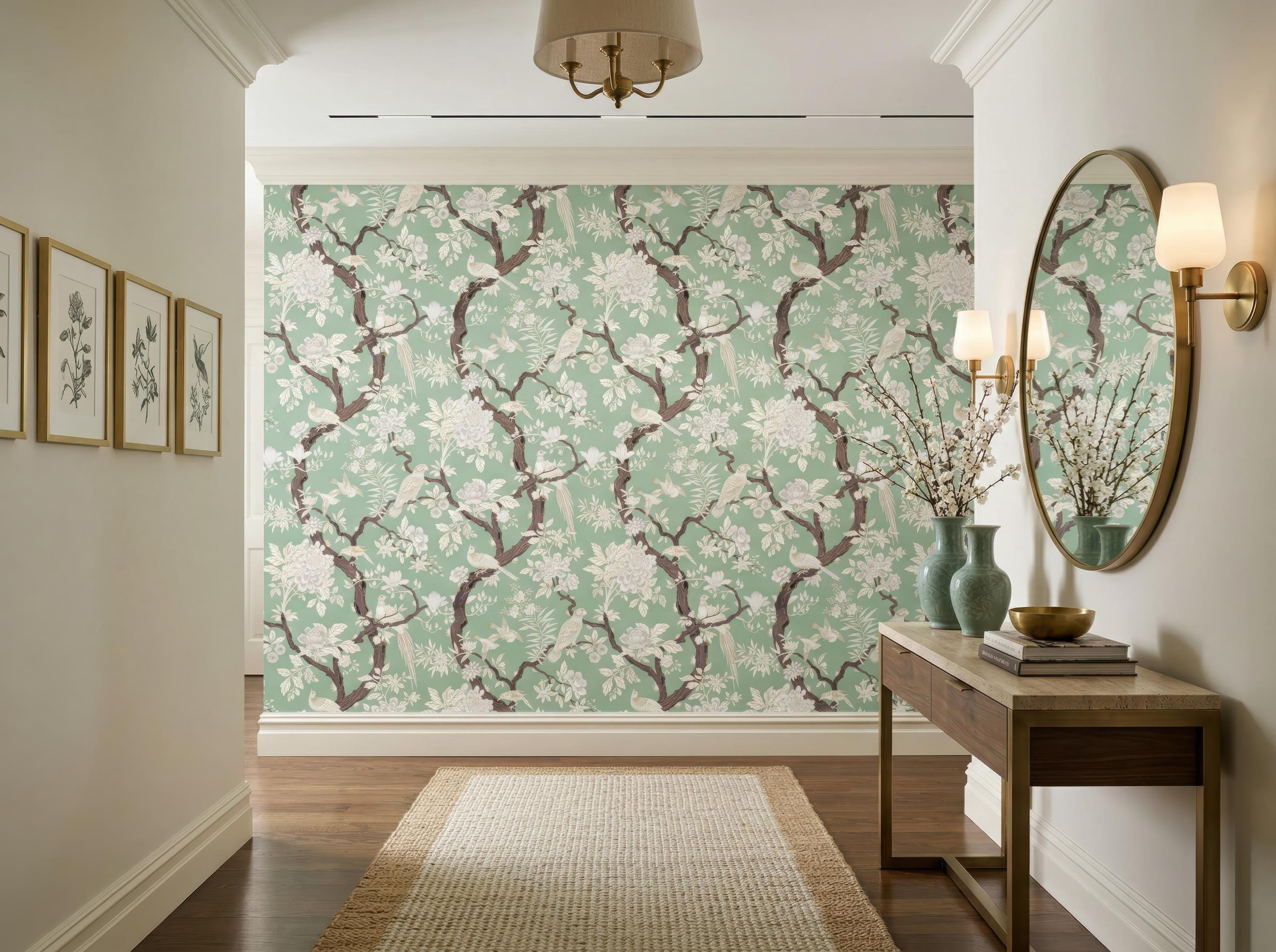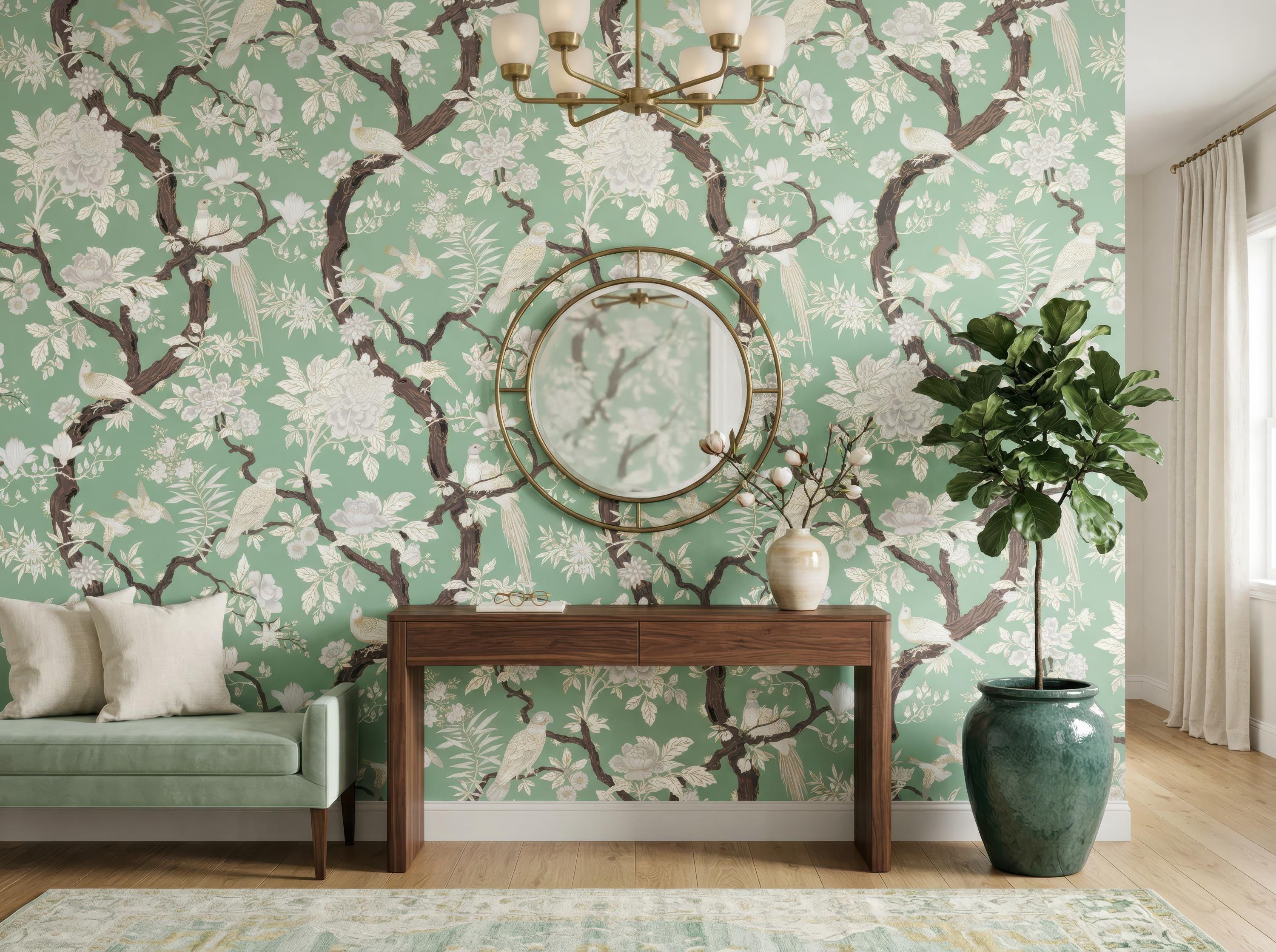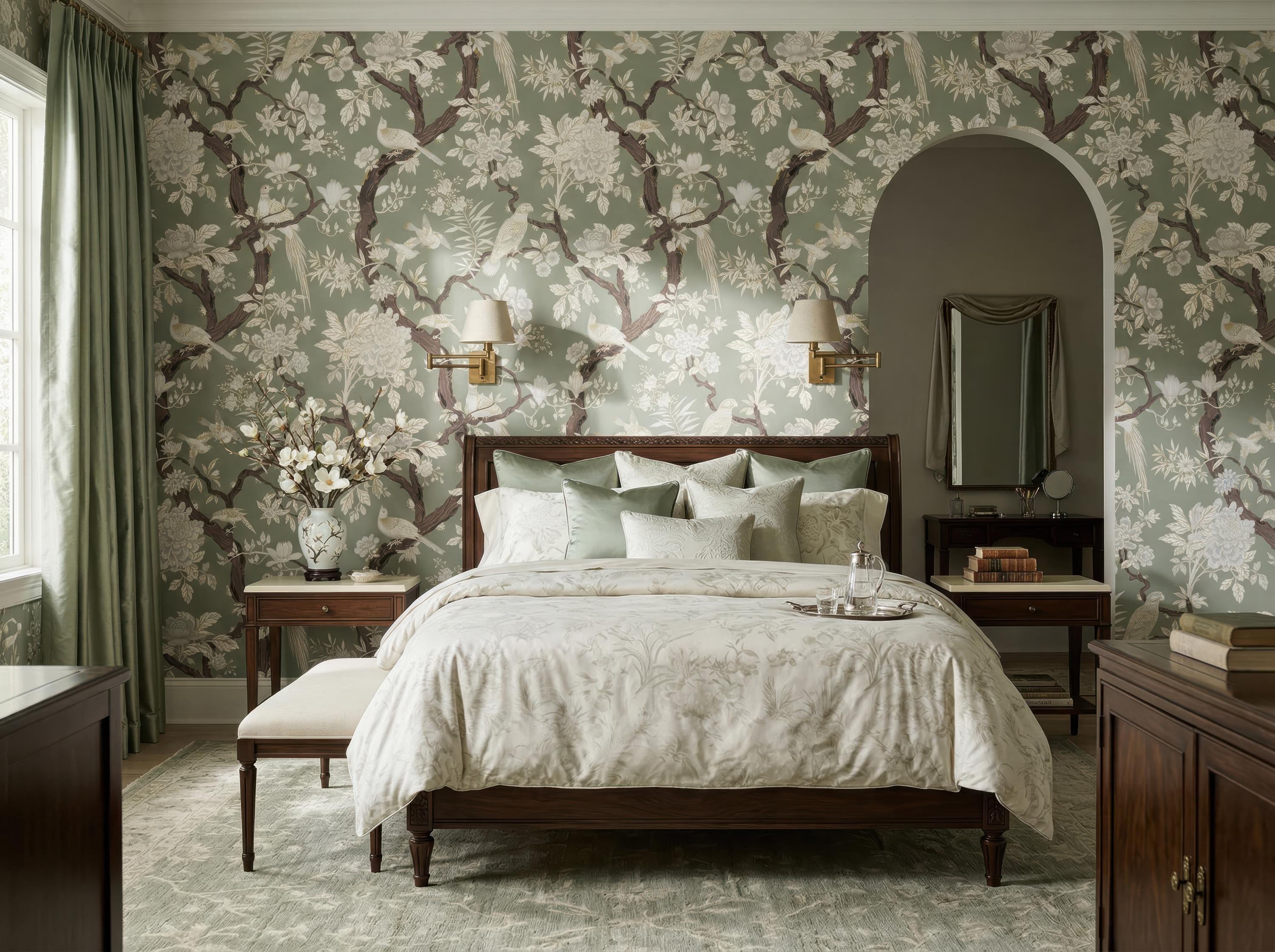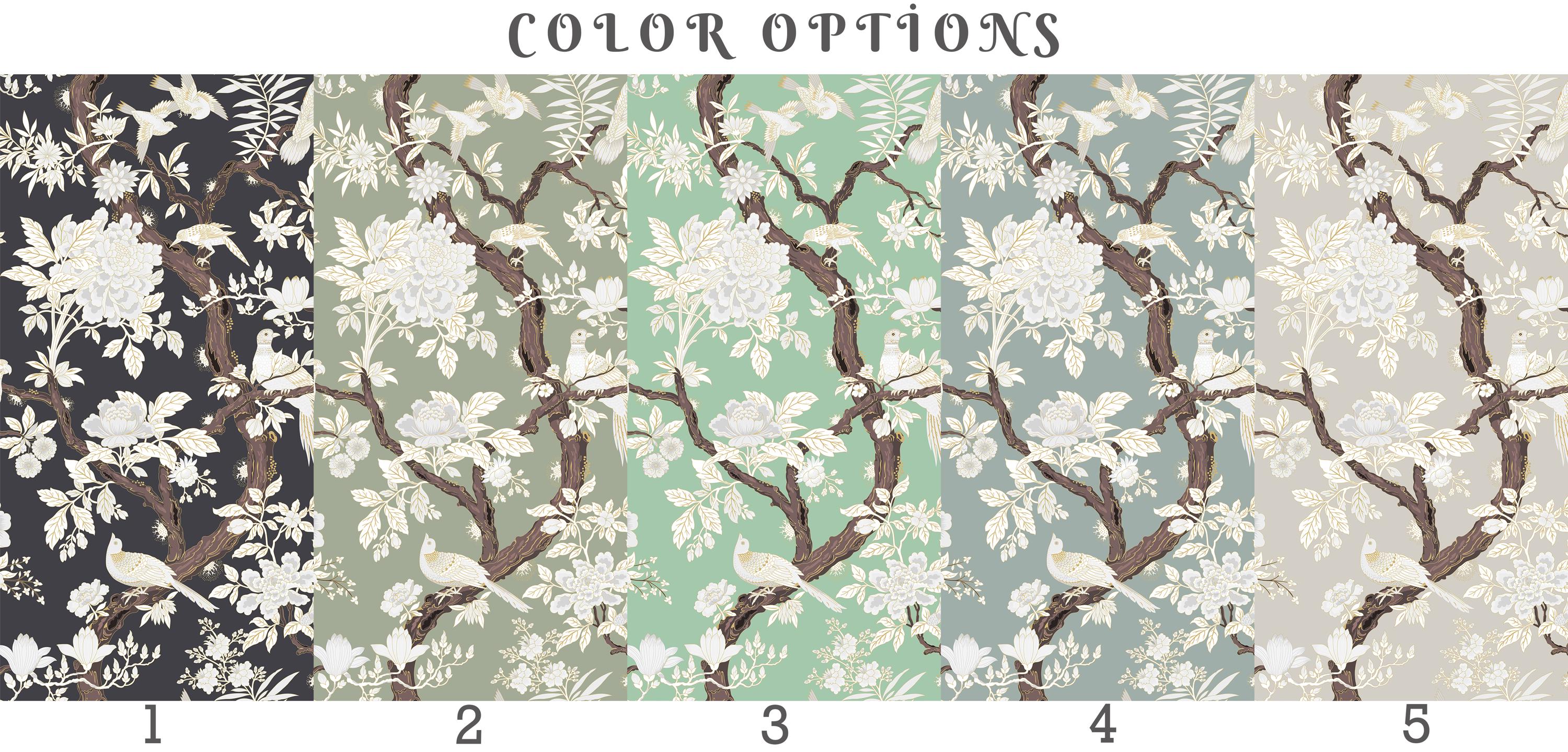 Elegant chinoiserie bird and floral wallpaper featuring detailed branches on a dark or soft neutral background. Available as peel and stick removable wallpaper or traditional non-woven for a refined finish. Perfect for moody bathrooms, bedrooms, and sophisticated luxury interiors. Available in 5 versatile background color options.