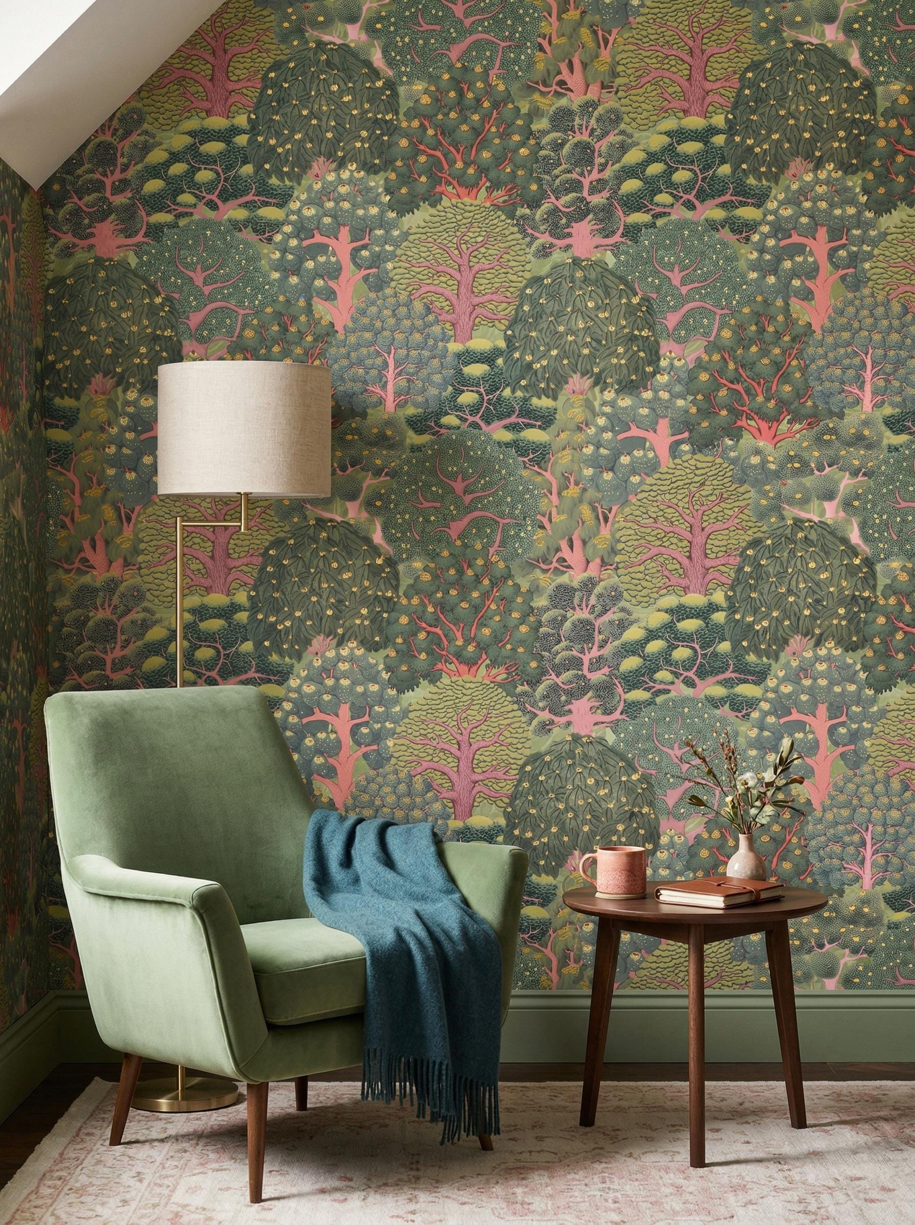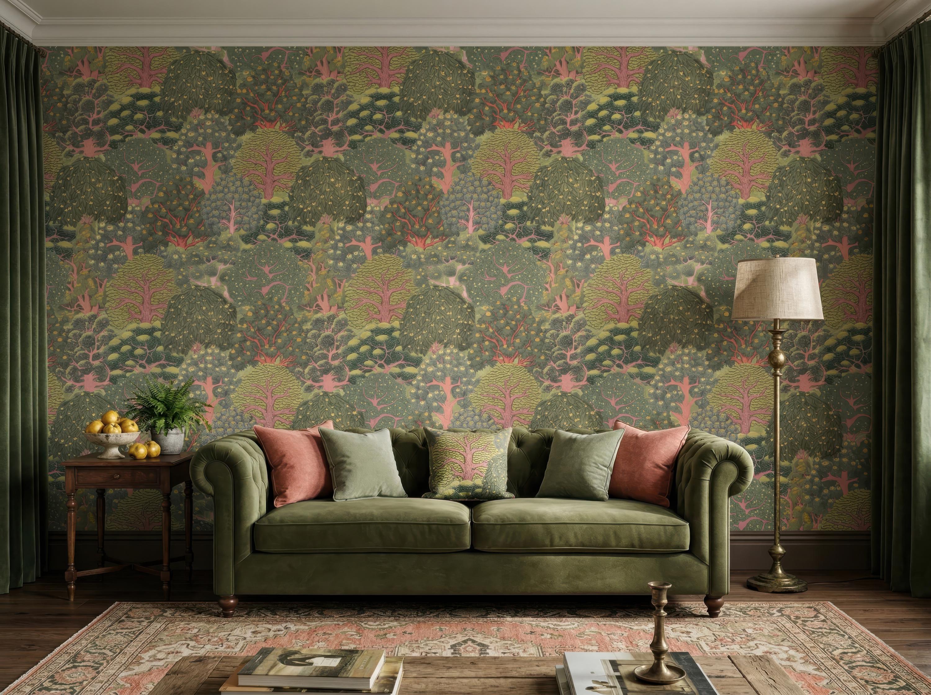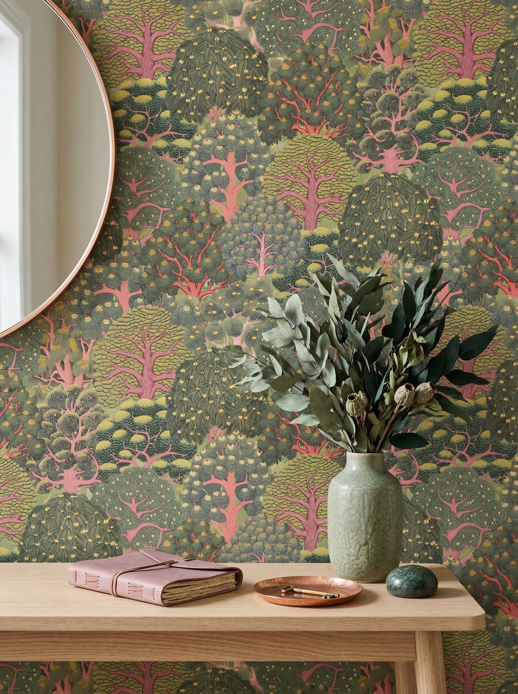 Transform your space into an enchanted orchard. This whimsical forest wallpaper features a lush canopy of stylized trees in soft sage, olive, and dusty rose. Whether you are looking for an easy DIY project with our Peel and Stick (Self-Adhesive) option or the timeless finish of our Traditional (Paste-the-Wall) paper, this design brings a sophisticated, vintage-inspired nature vibe to any room.