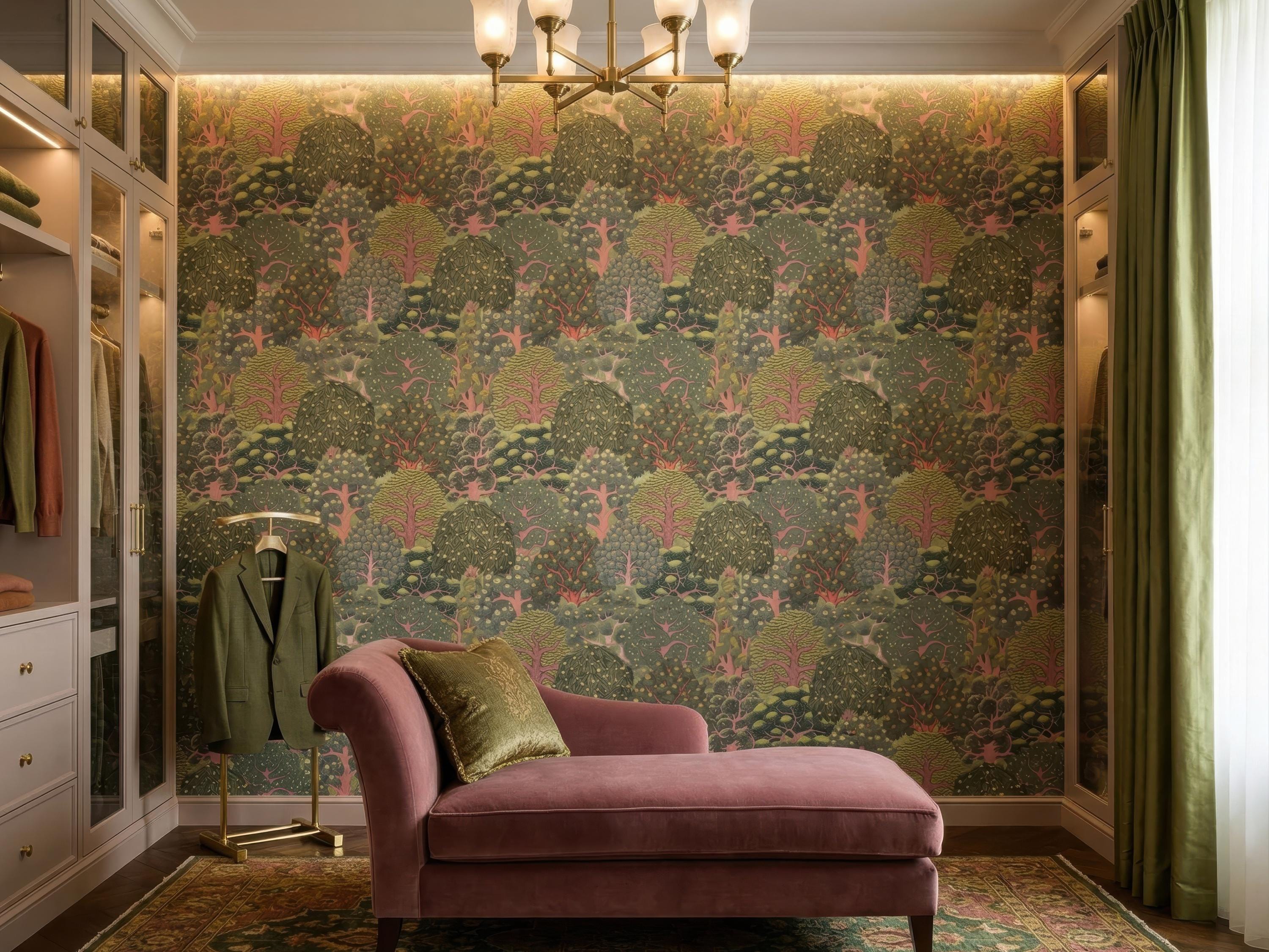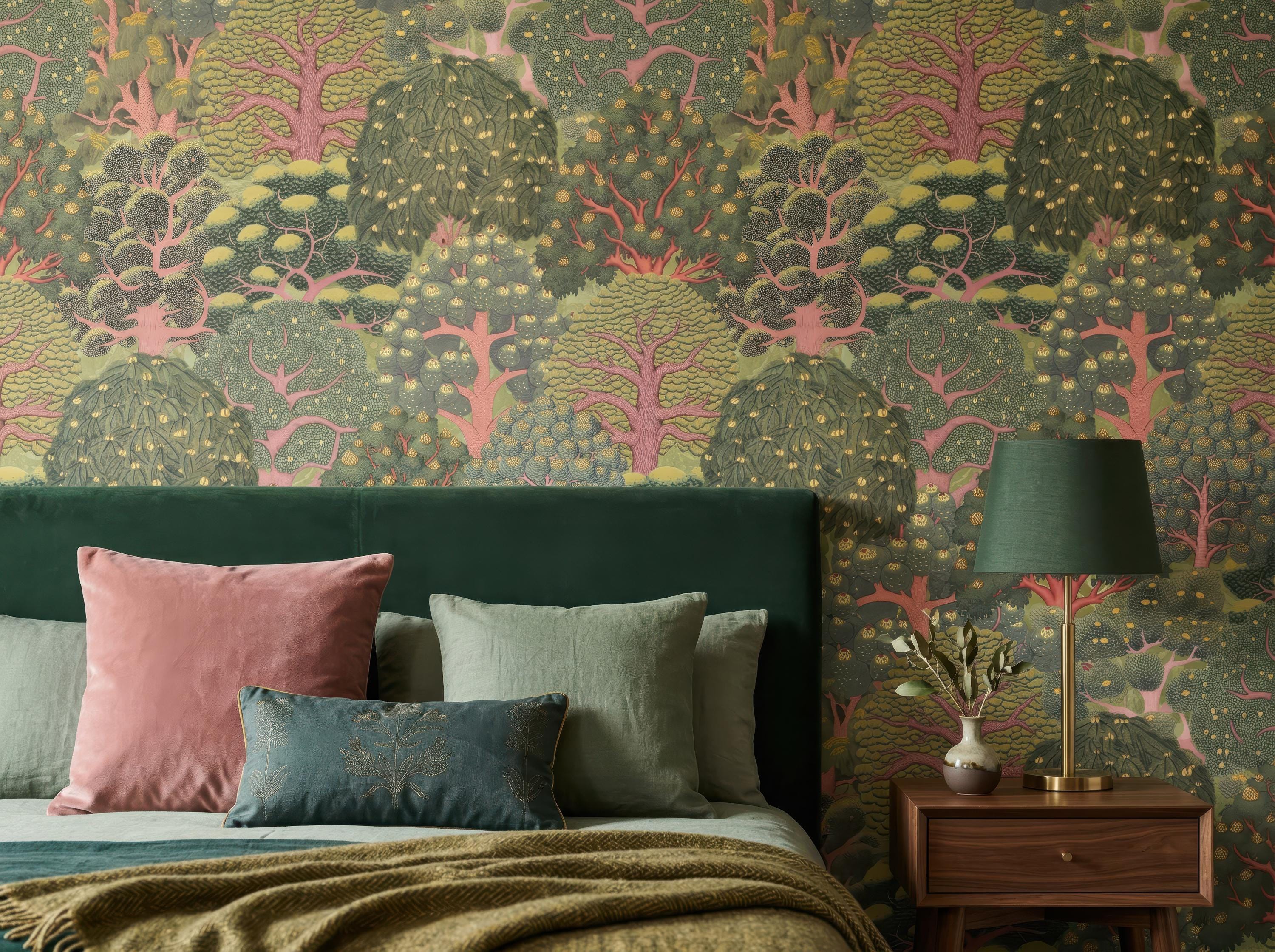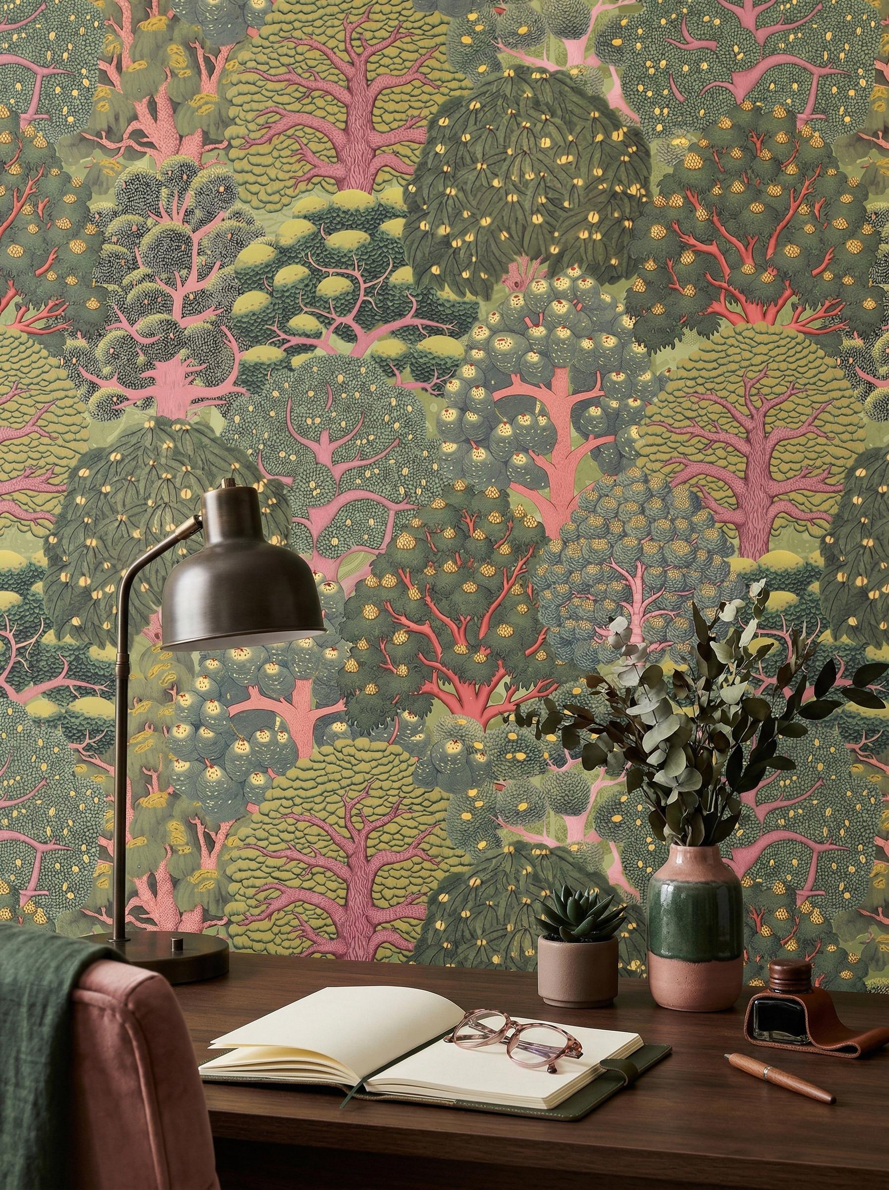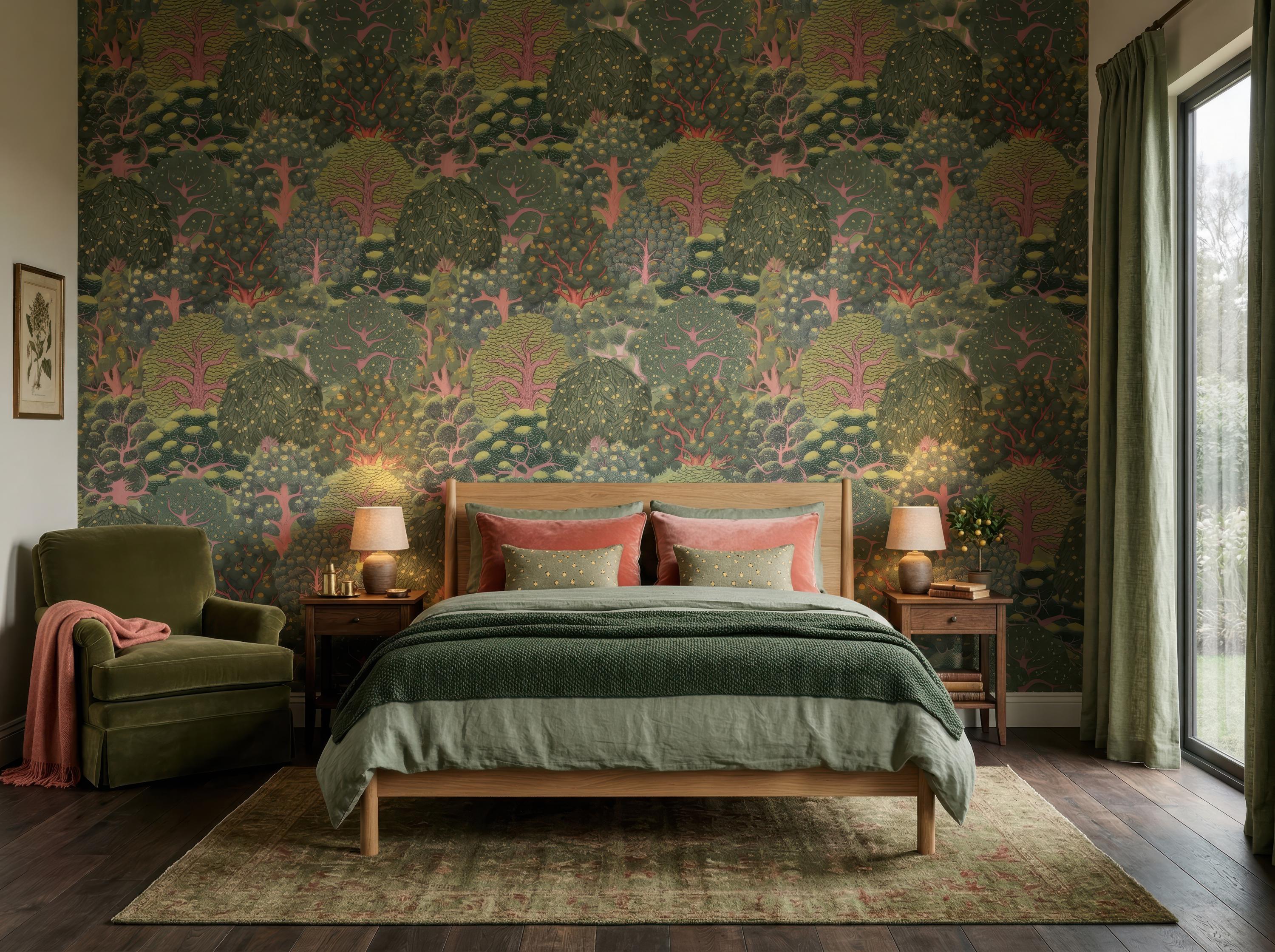 Transform your space into an enchanted orchard. This whimsical forest wallpaper features a lush canopy of stylized trees in soft sage, olive, and dusty rose. Whether you are looking for an easy DIY project with our Peel and Stick (Self-Adhesive) option or the timeless finish of our Traditional (Paste-the-Wall) paper, this design brings a sophisticated, vintage-inspired nature vibe to any room.