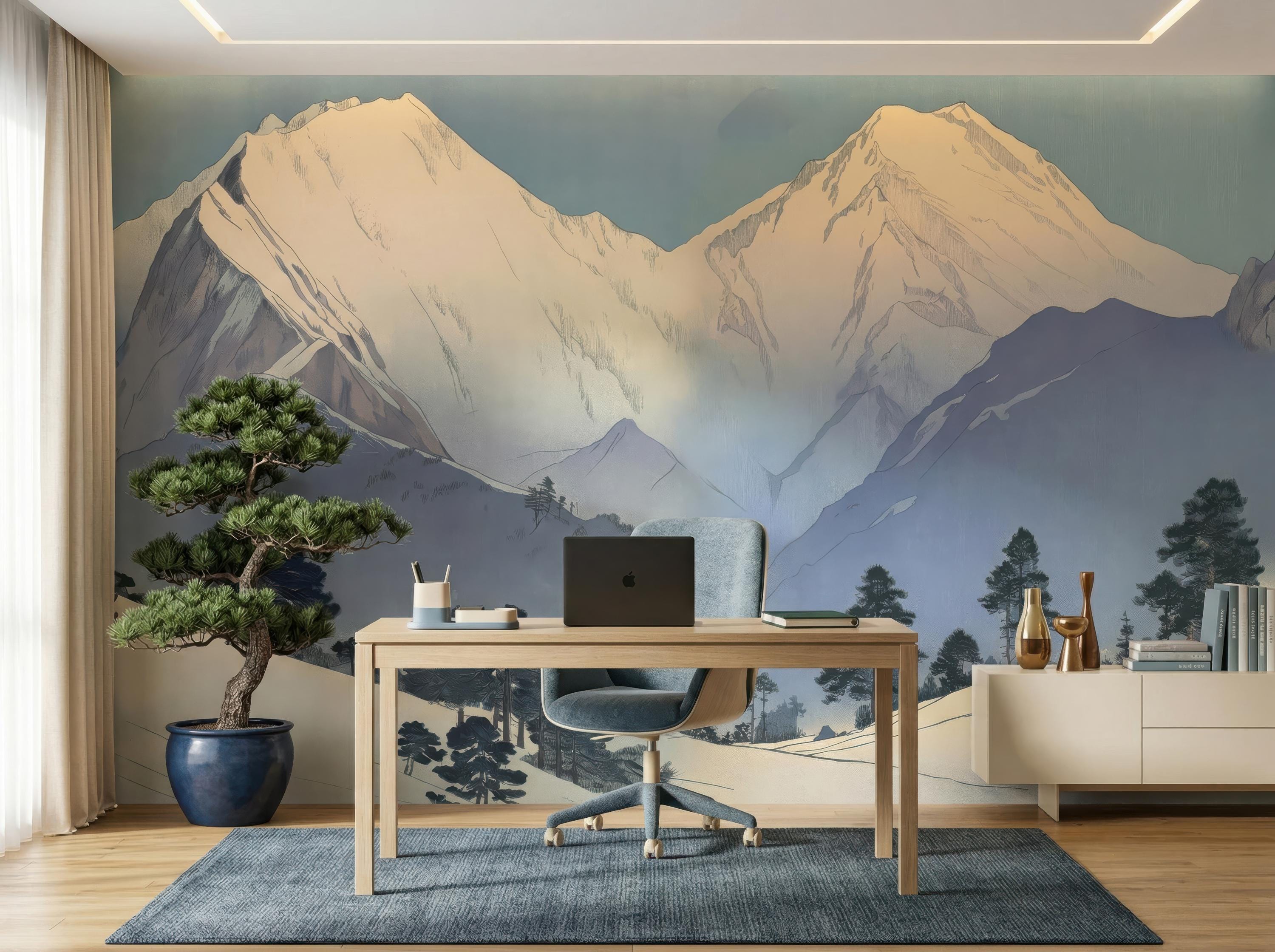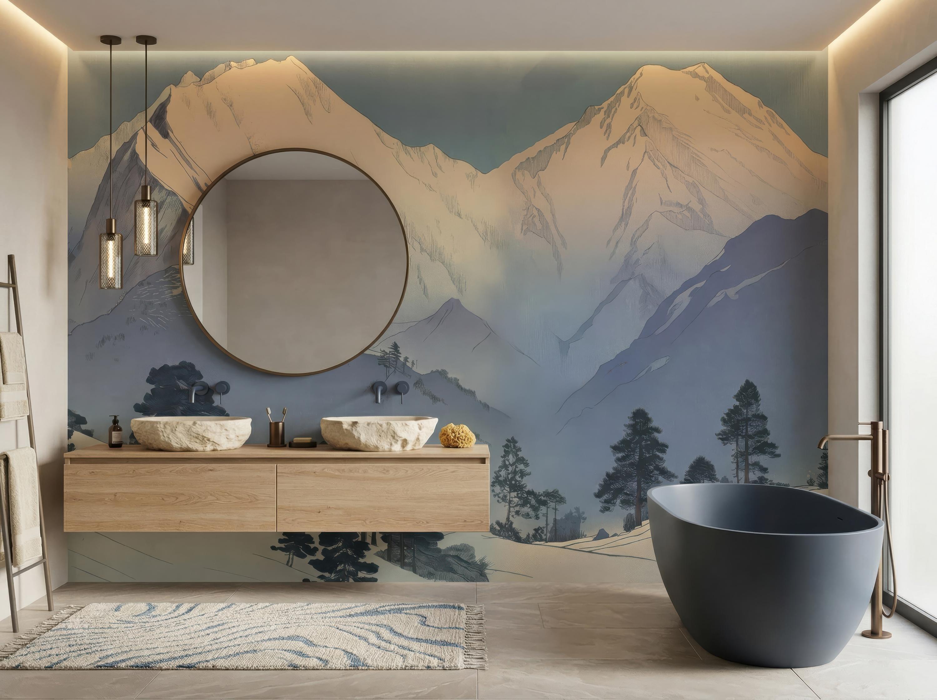 Japanese Mountain Mural, Zen Landscape Wallpaper - Removable Peel Stick or Traditional - Japandi Wabi Sabi Bedroom Living Room Wall Decor