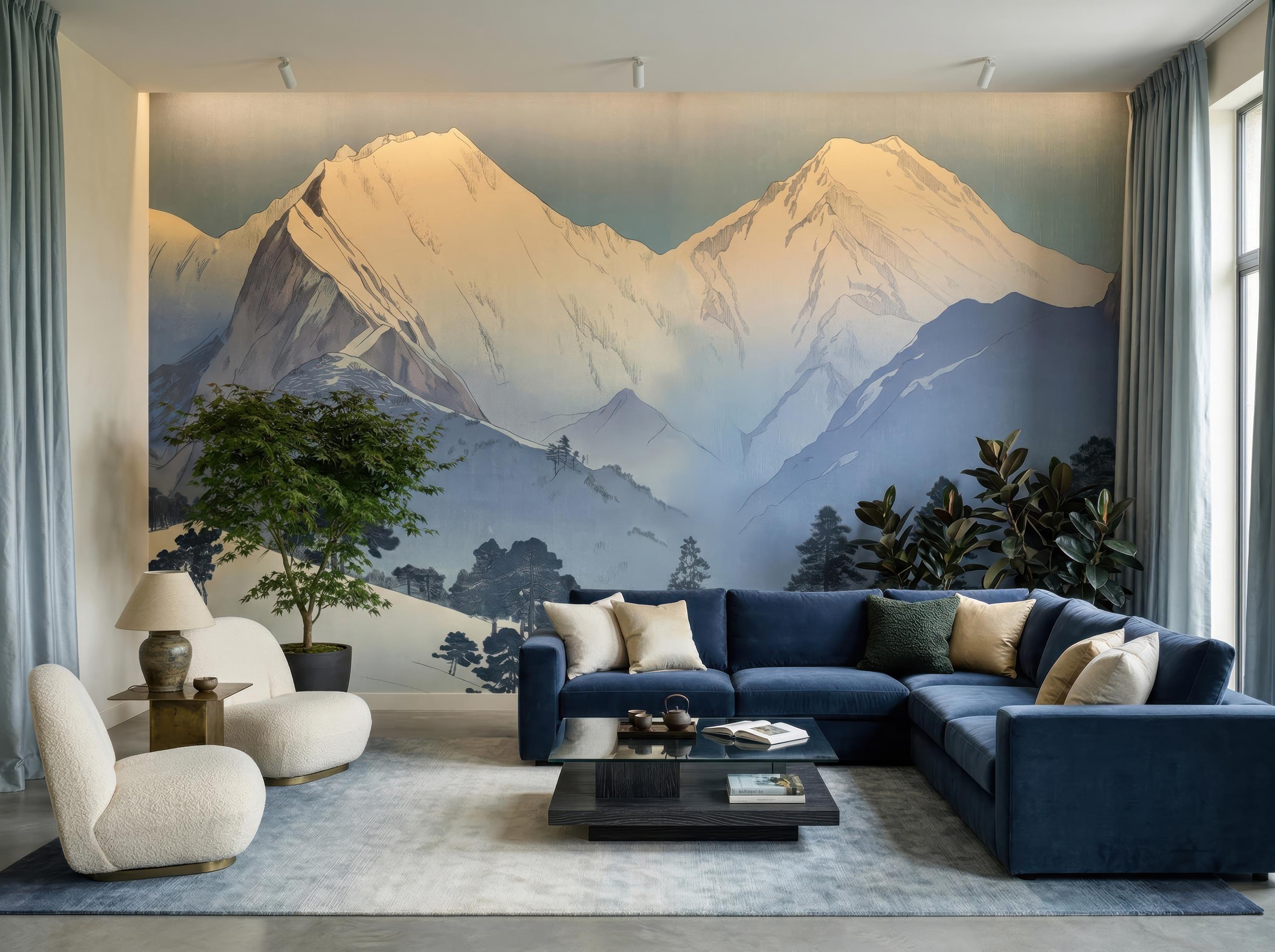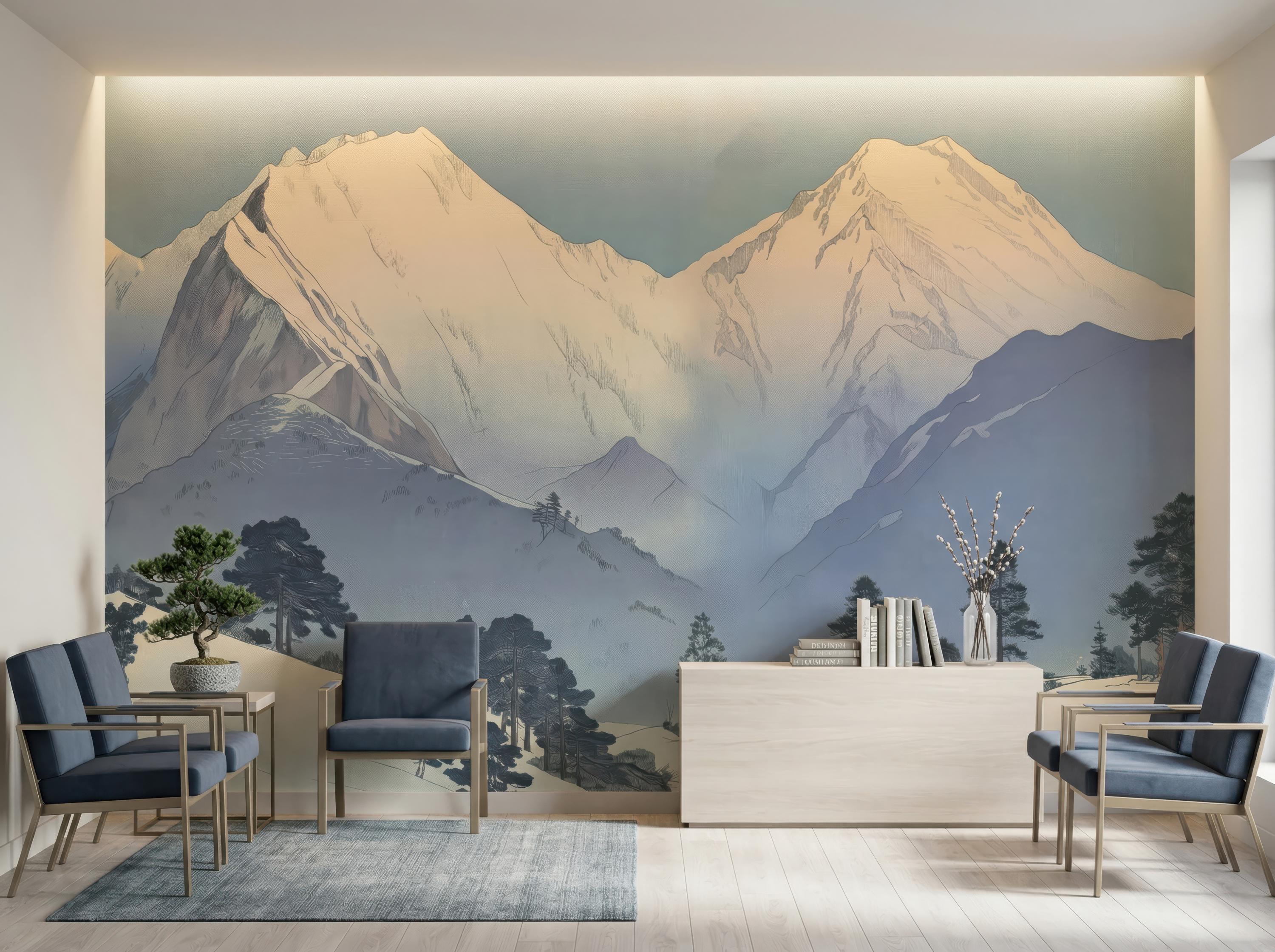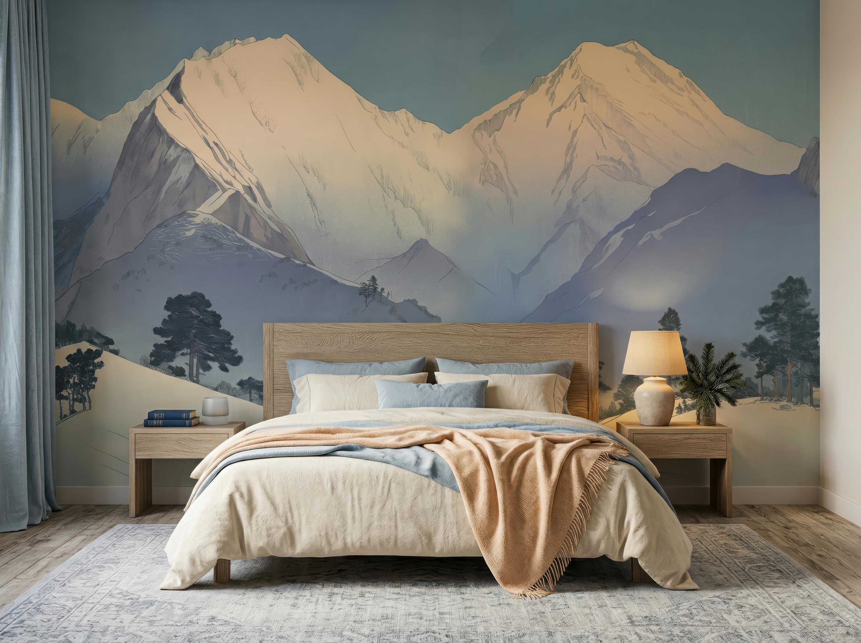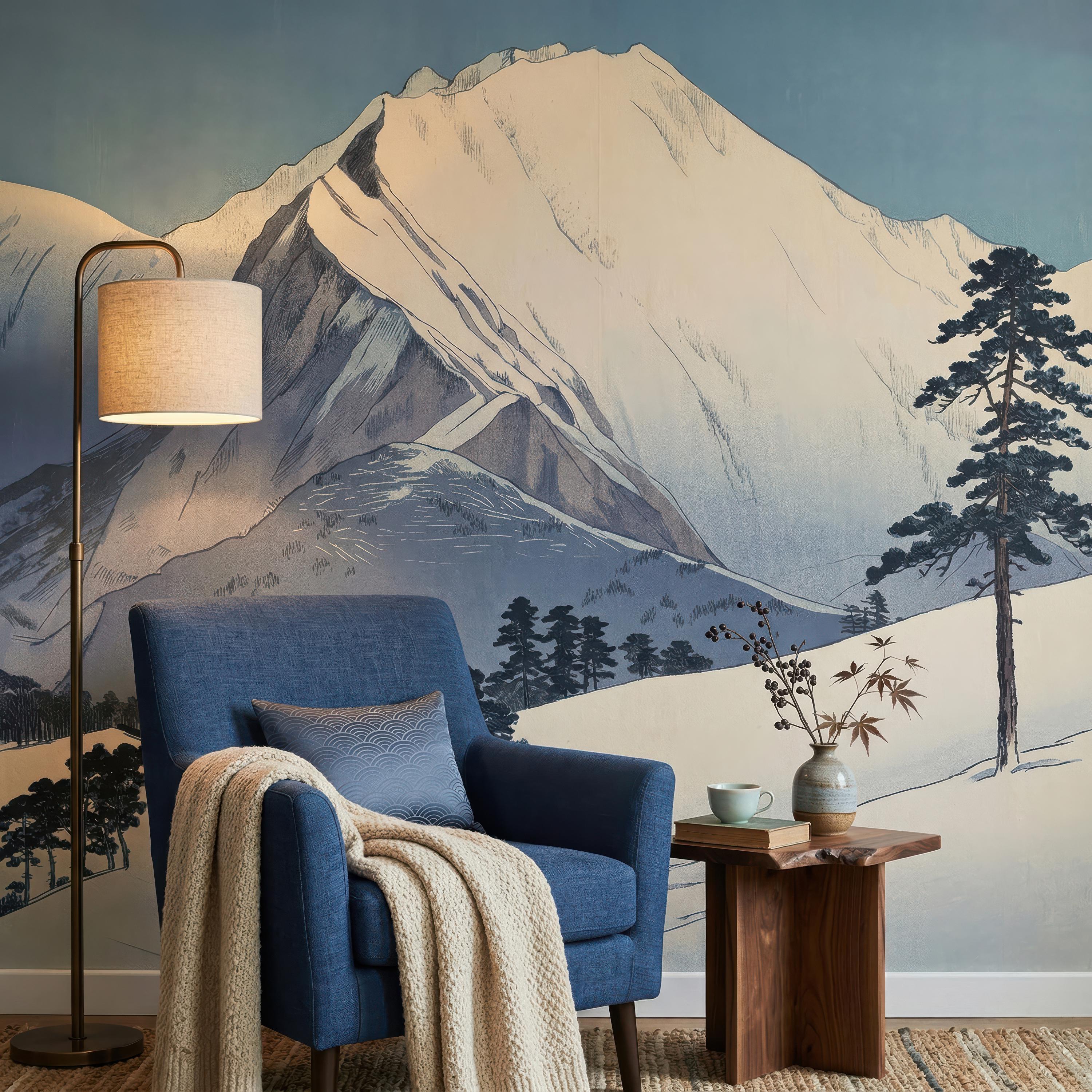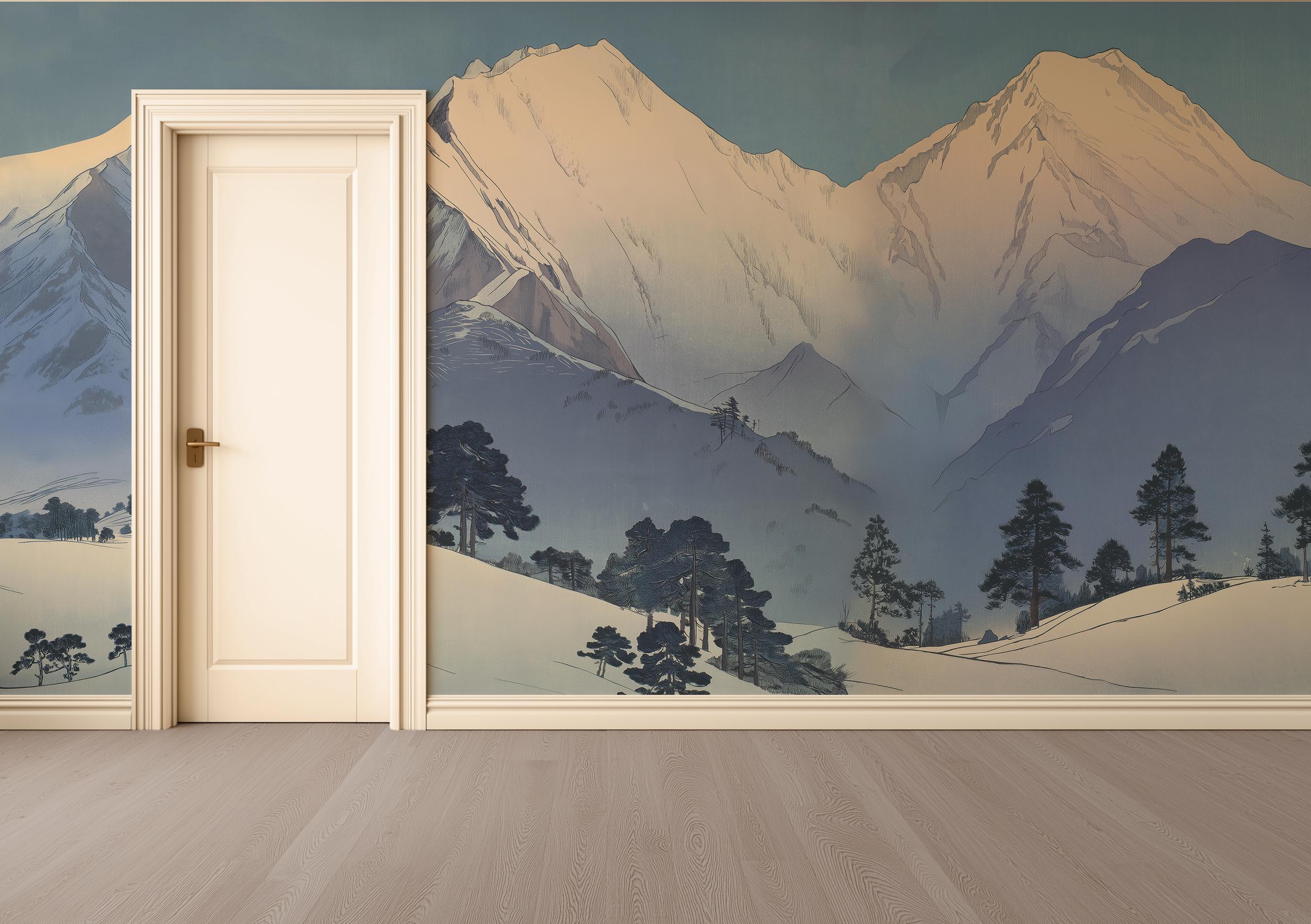 Transform your space with this serene snowy mountain wall mural, designed in a calming Scandinavian landscape style. Perfect for peel and stick or traditional wallpaper applications, this nature-inspired design brings peaceful, modern elegance into any room.