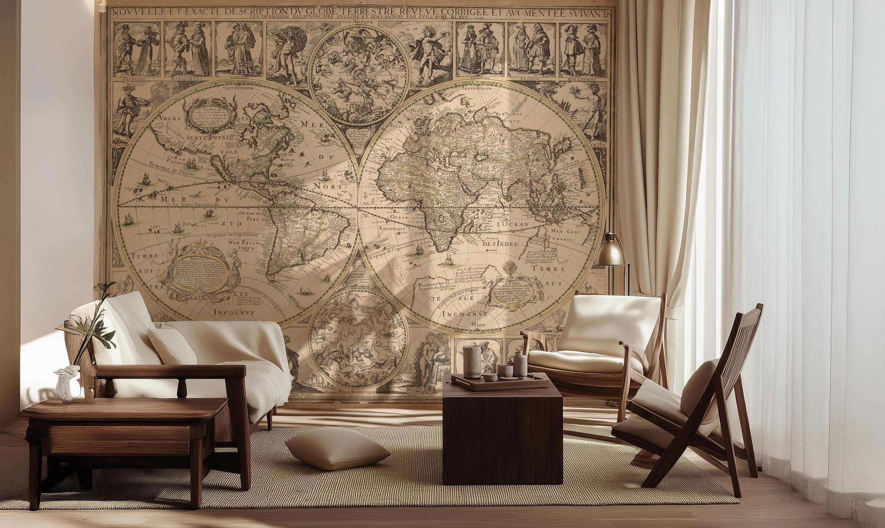 Vintage World Map Wall Mural, 17th Century Antique Globe Map Wallpaper, Large Home Office Study Decor , Peel and Stick & Traditional