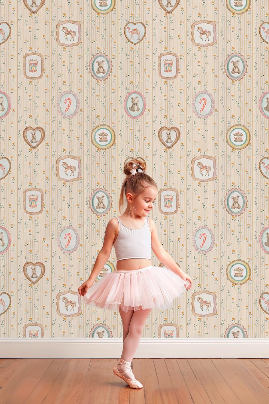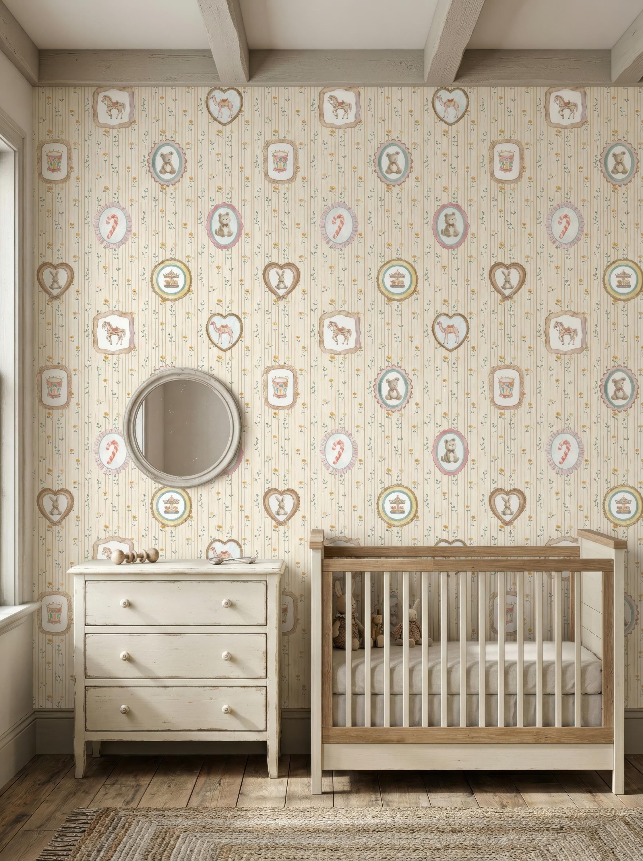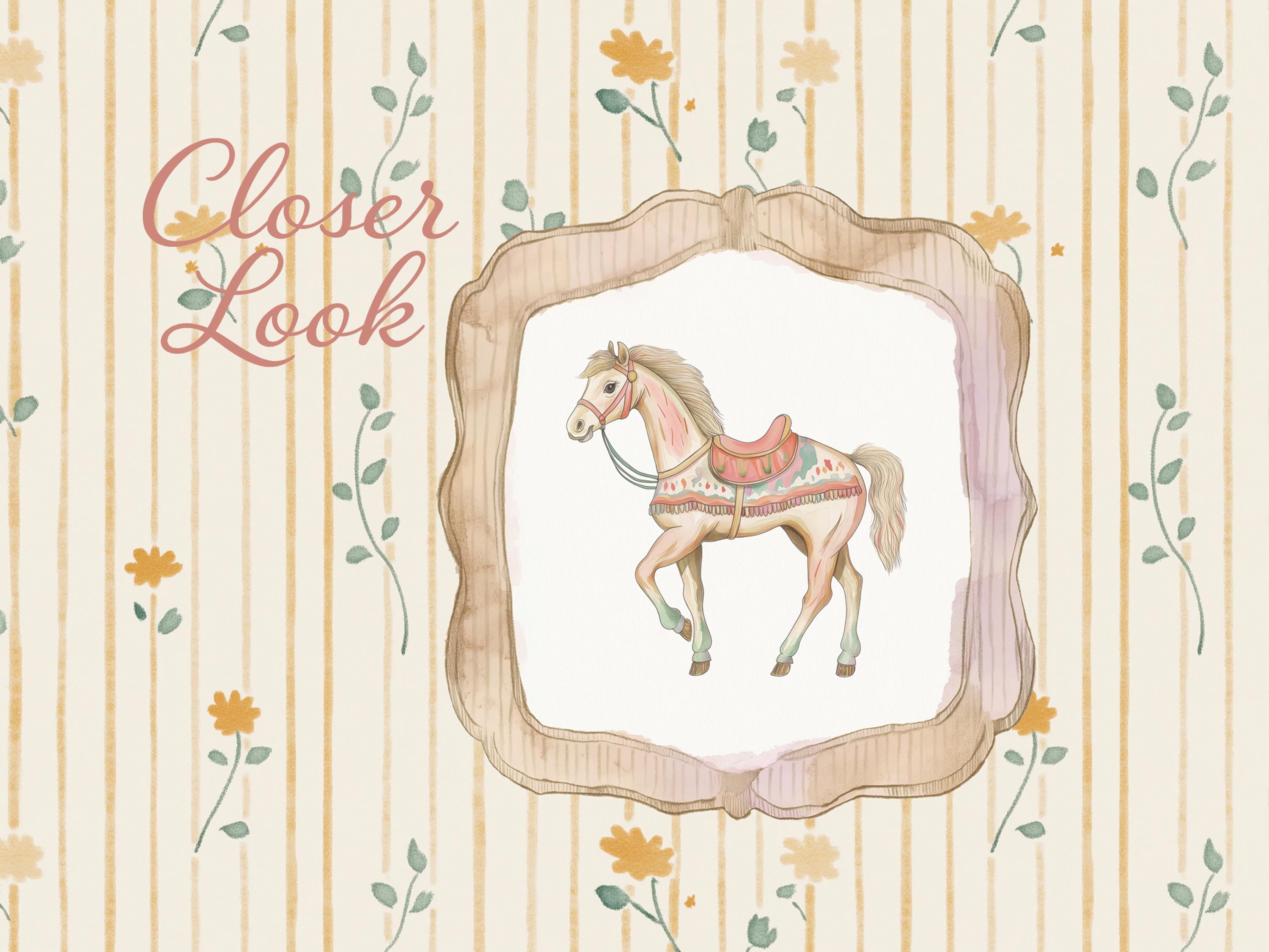 Create a warm and charming space with this vintage oquette nursery wallpaper featuring adorable teddy bears, carousel horses, and soft pastel accents. Perfect for baby rooms, toddler spaces, or storybook-inspired interiors, this timeless design blends classic elegance with cozy nursery vibes.