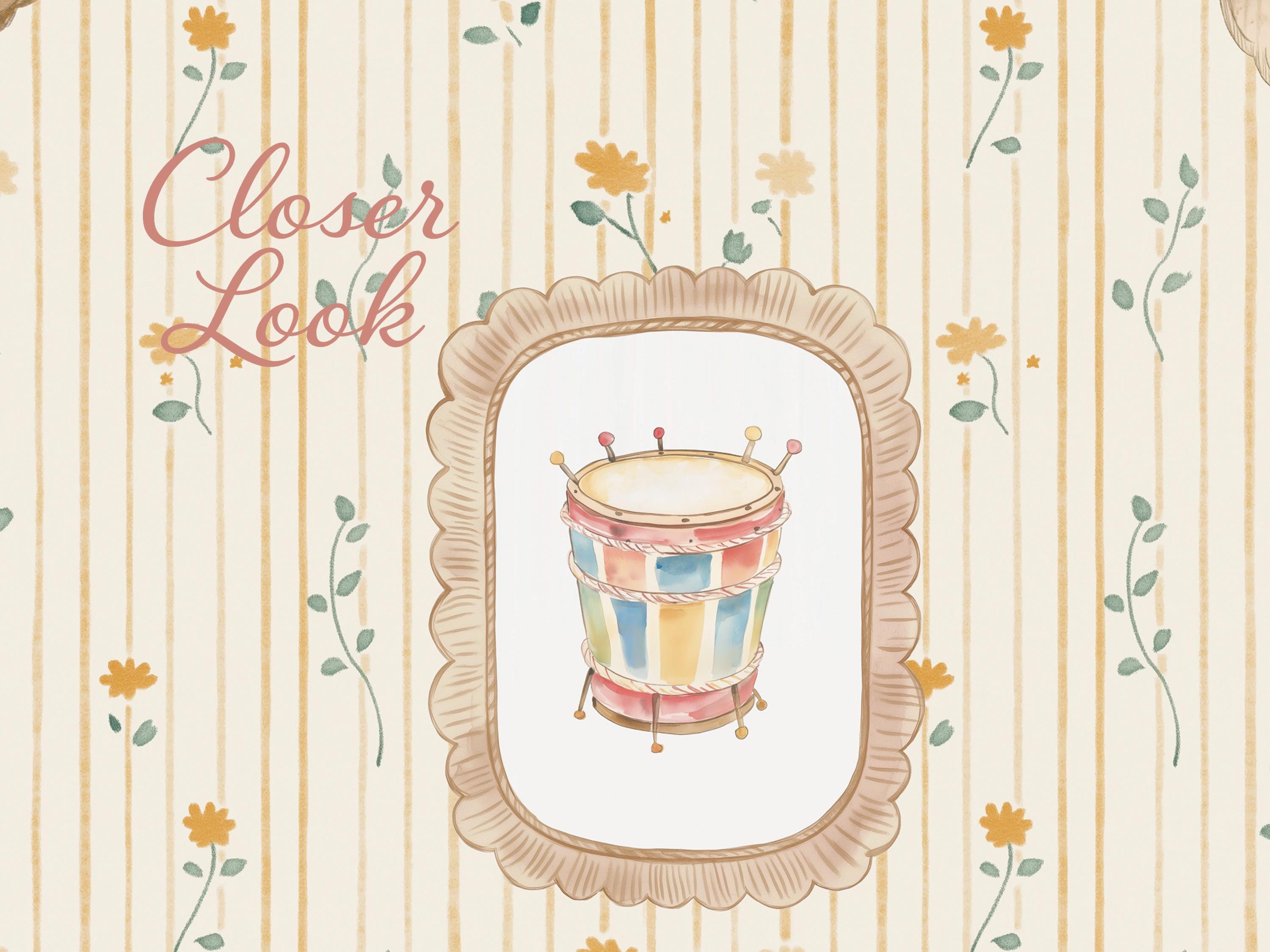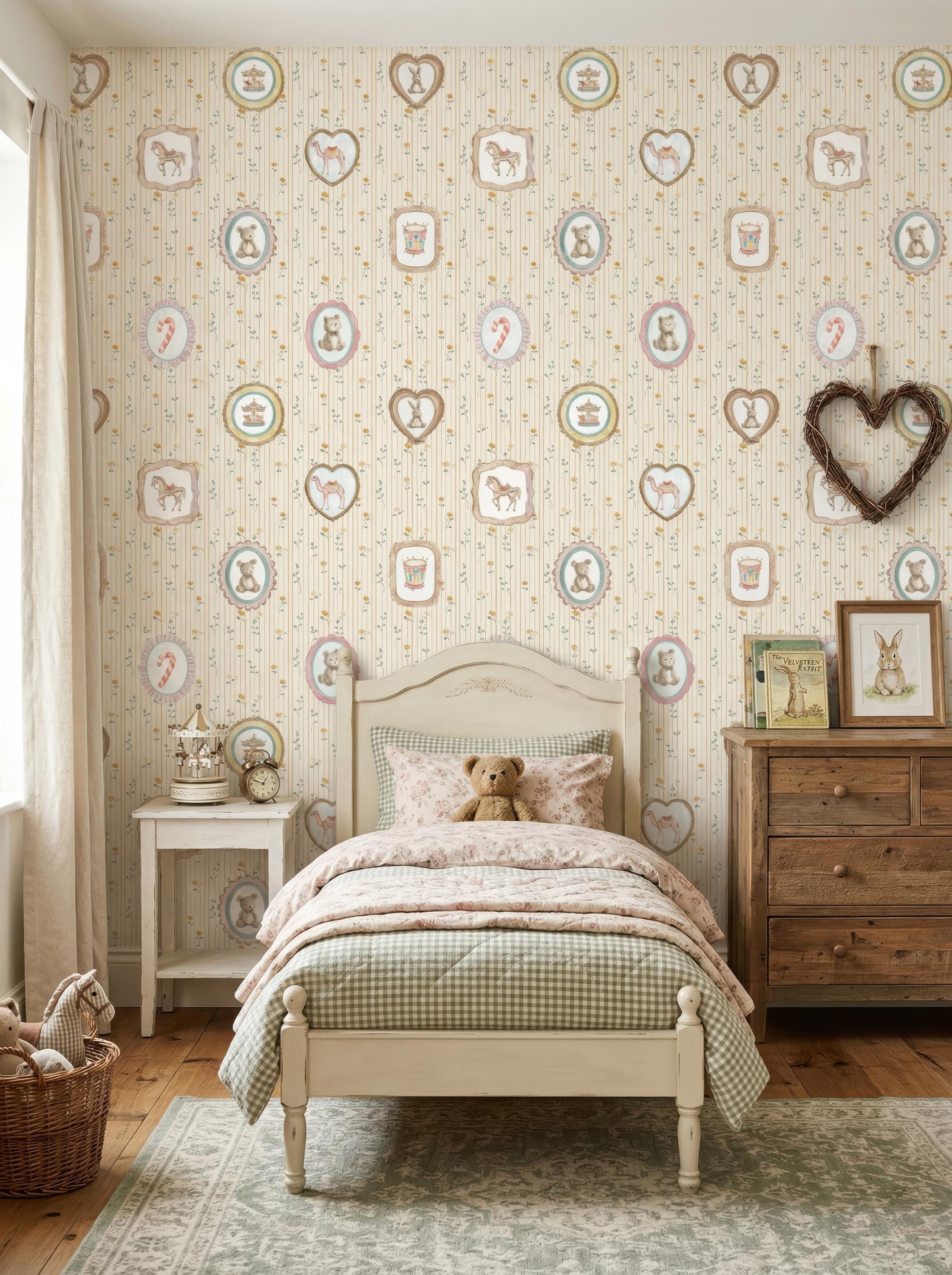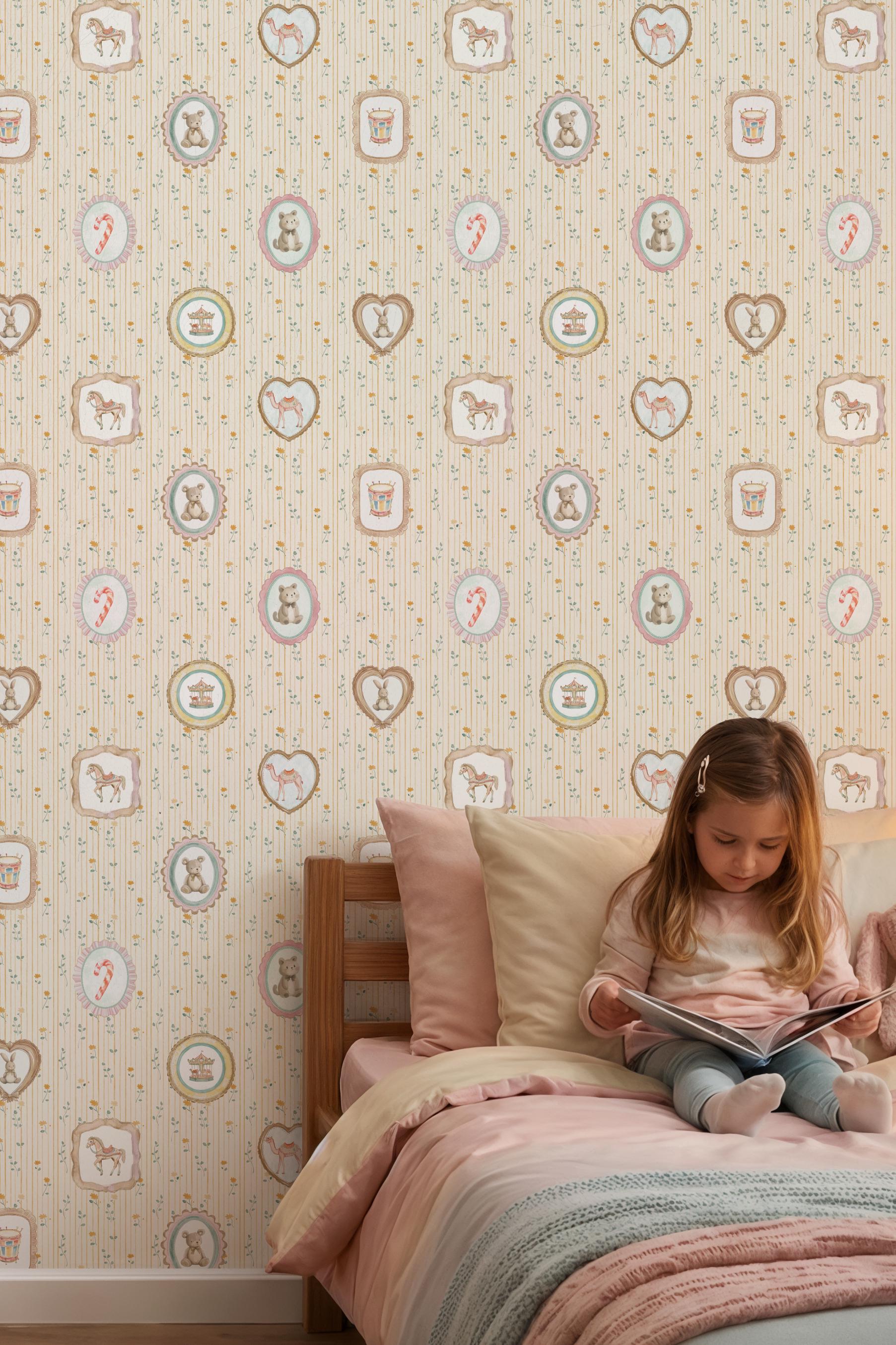 Create a warm and charming space with this vintage oquette nursery wallpaper featuring adorable teddy bears, carousel horses, and soft pastel accents. Perfect for baby rooms, toddler spaces, or storybook-inspired interiors, this timeless design blends classic elegance with cozy nursery vibes.