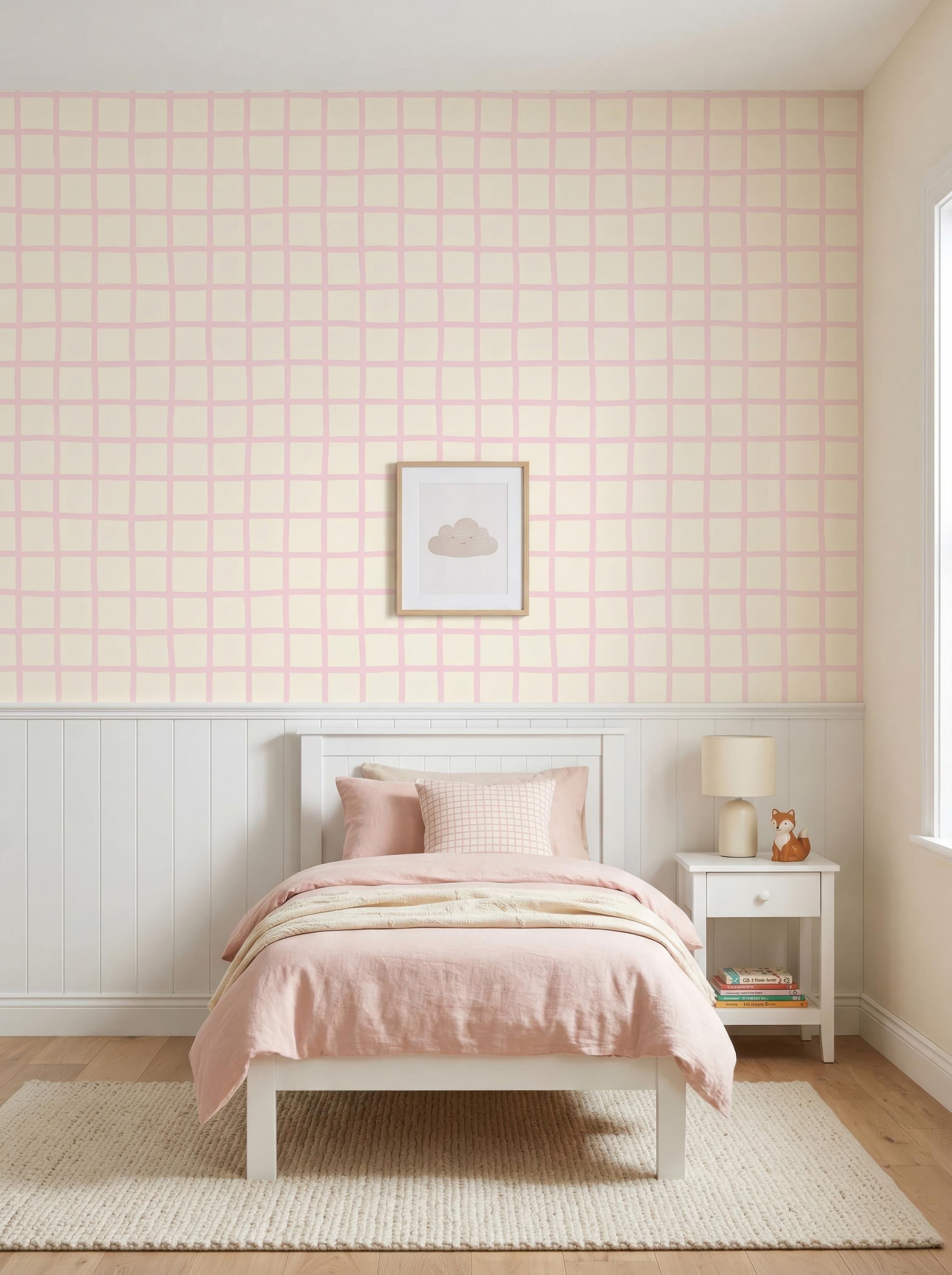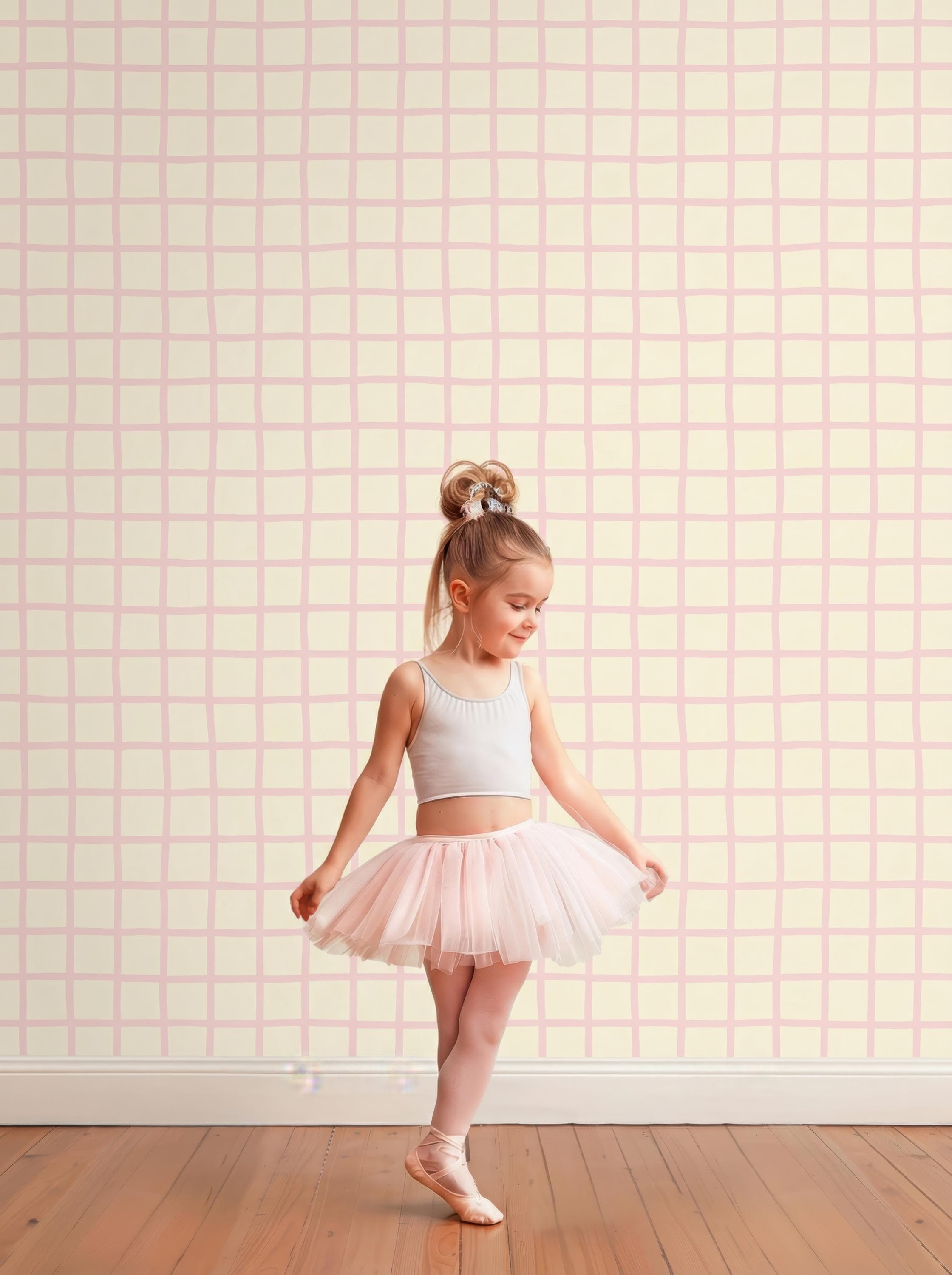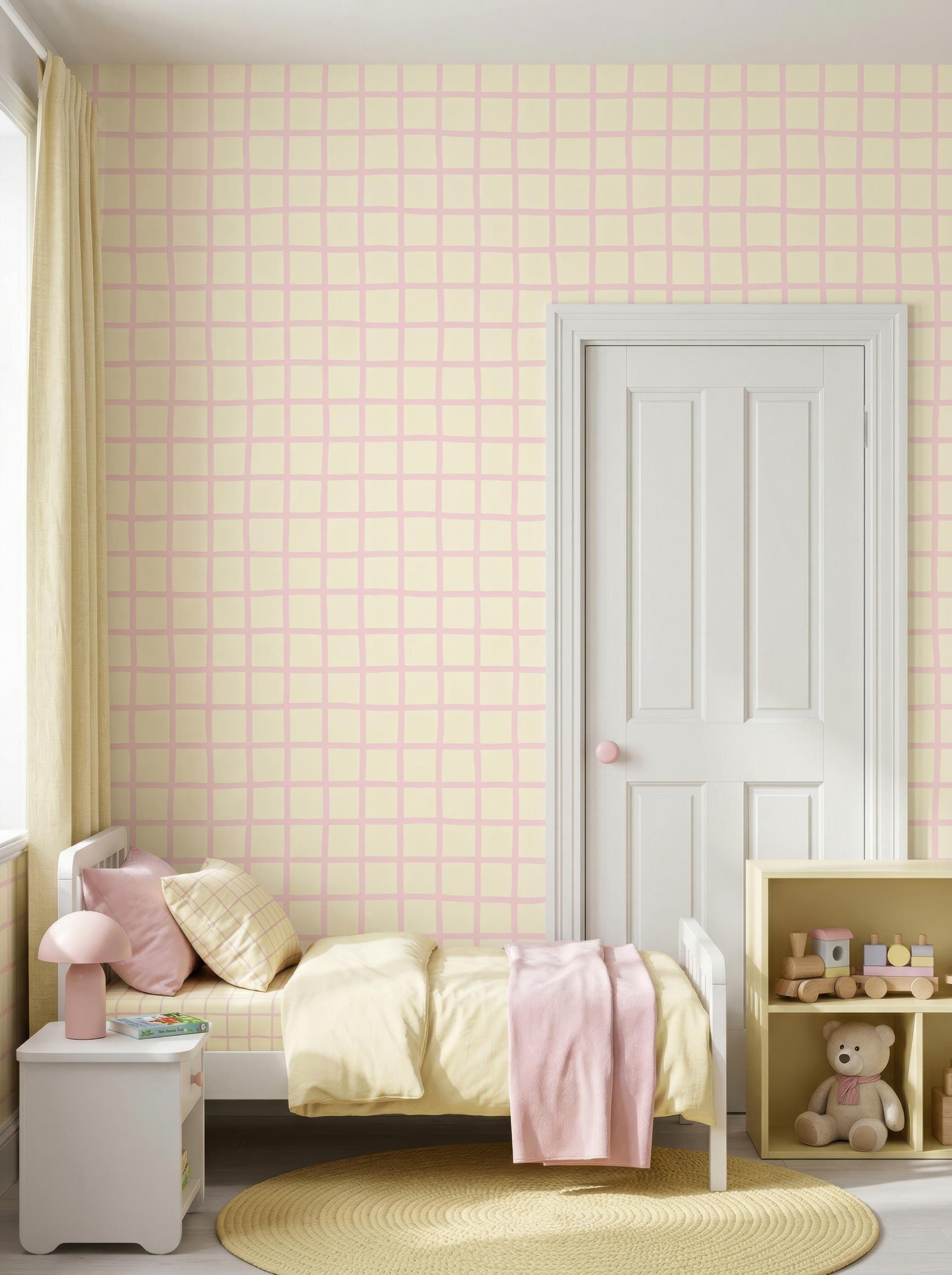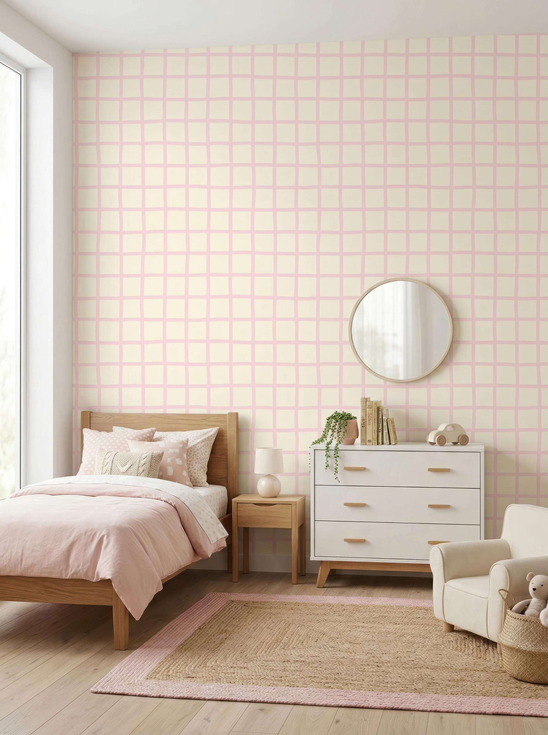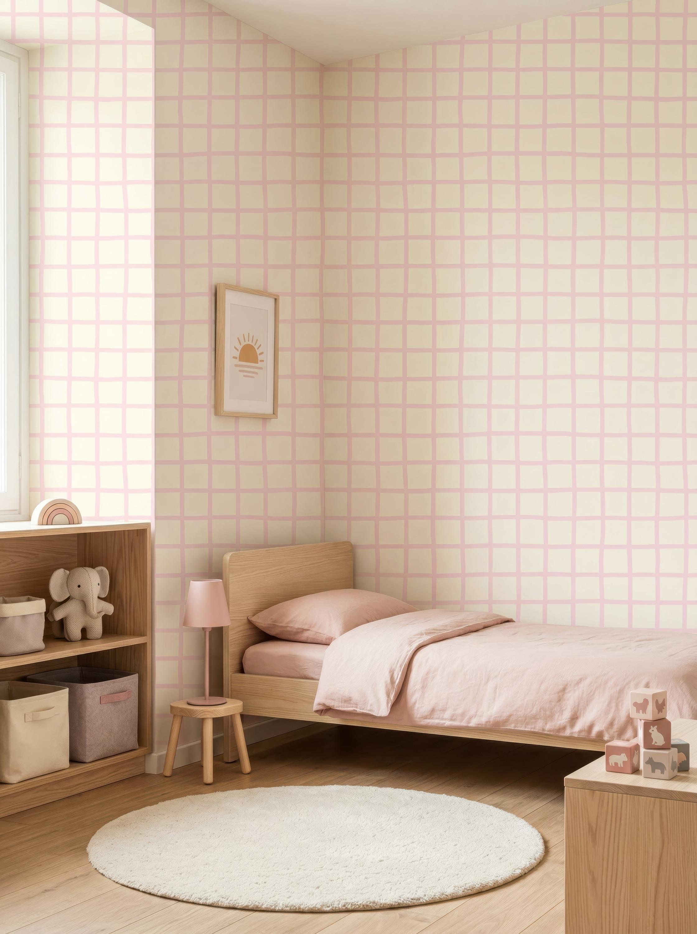 Soft Pink Checkered Nursery Wallpaper, Pastel Grid Baby Girl Room Wall Decor ( Peel Stick /Traditional) , Minimalist Kids Room Design
