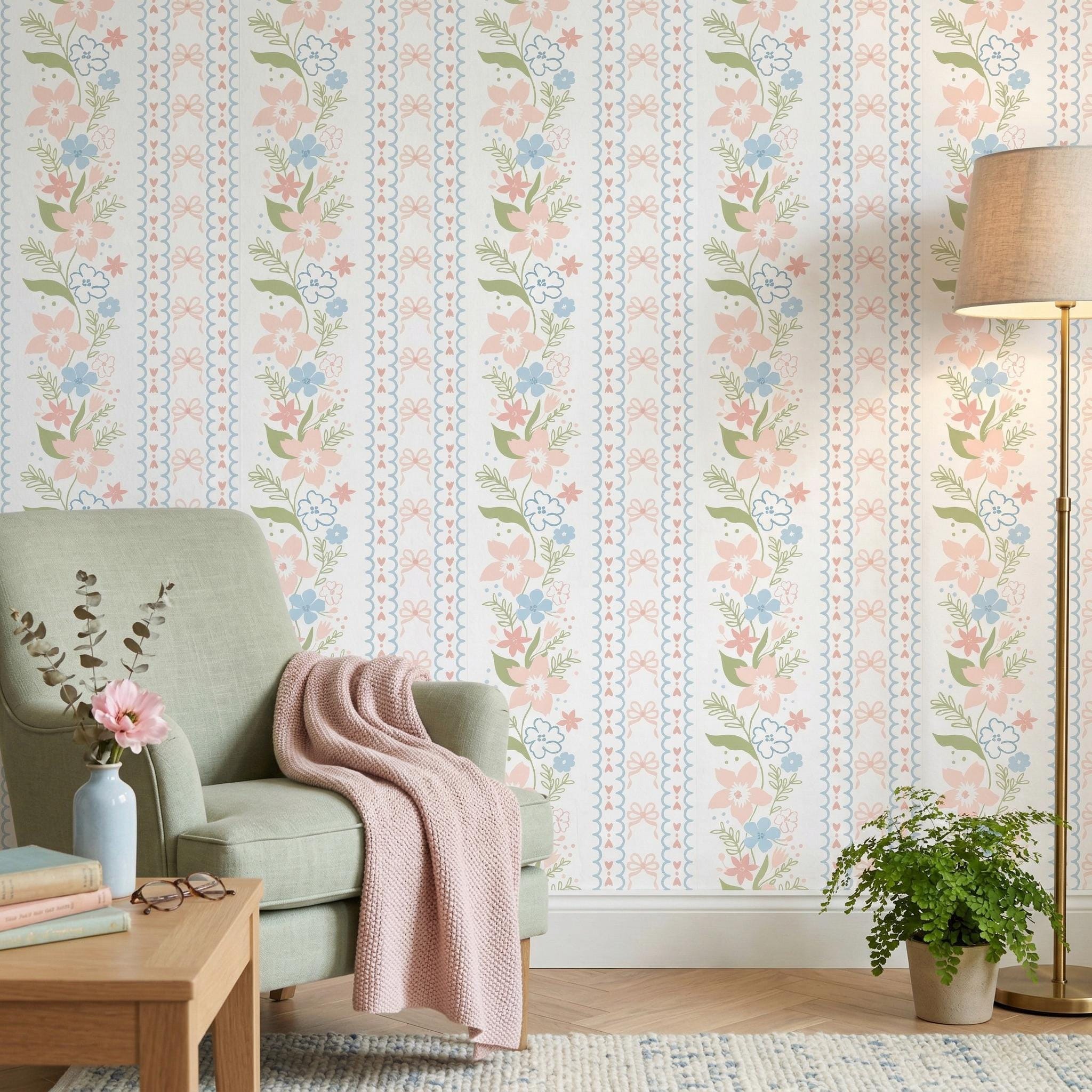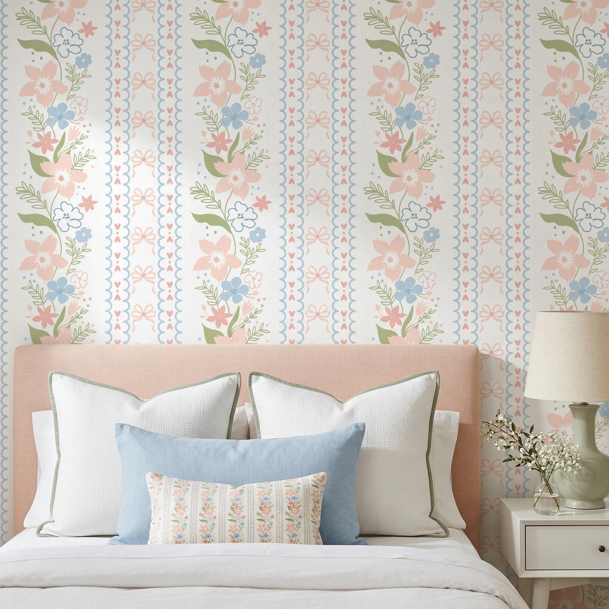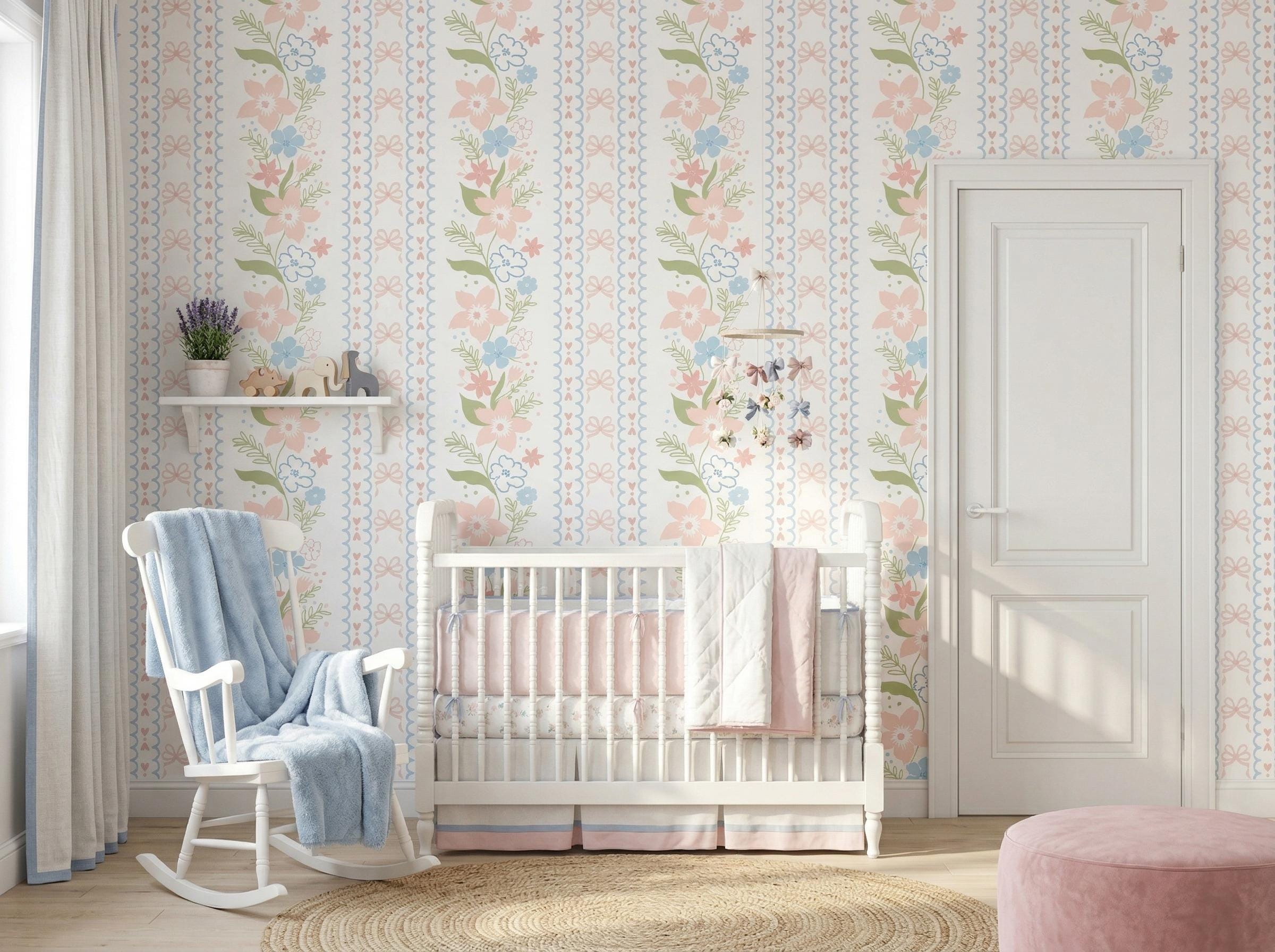 Create a dreamy and charming space with this coquette floral bow grandmillennial wallpaper, featuring soft pastel pink and blue flowers with delicate ribbon details—perfect for nursery decor, baby girl rooms, and vintage-inspired interiors.