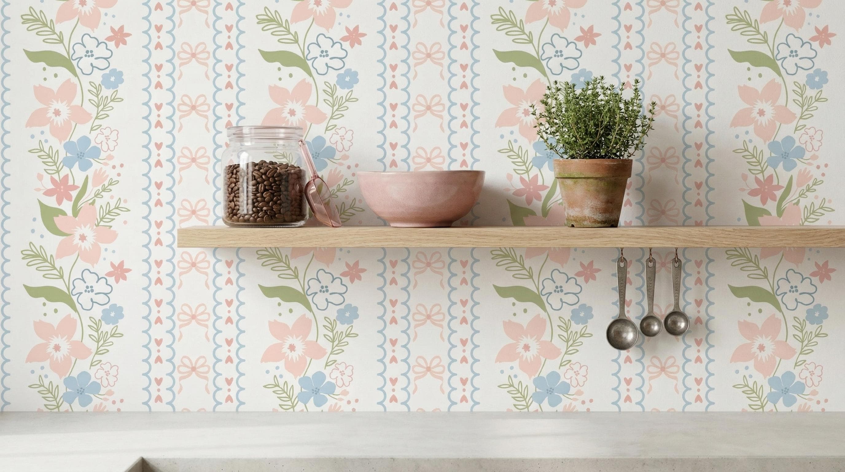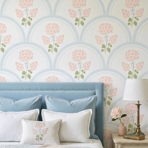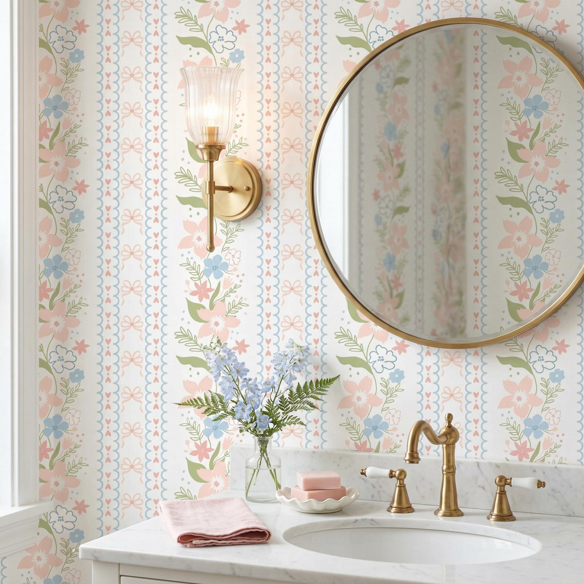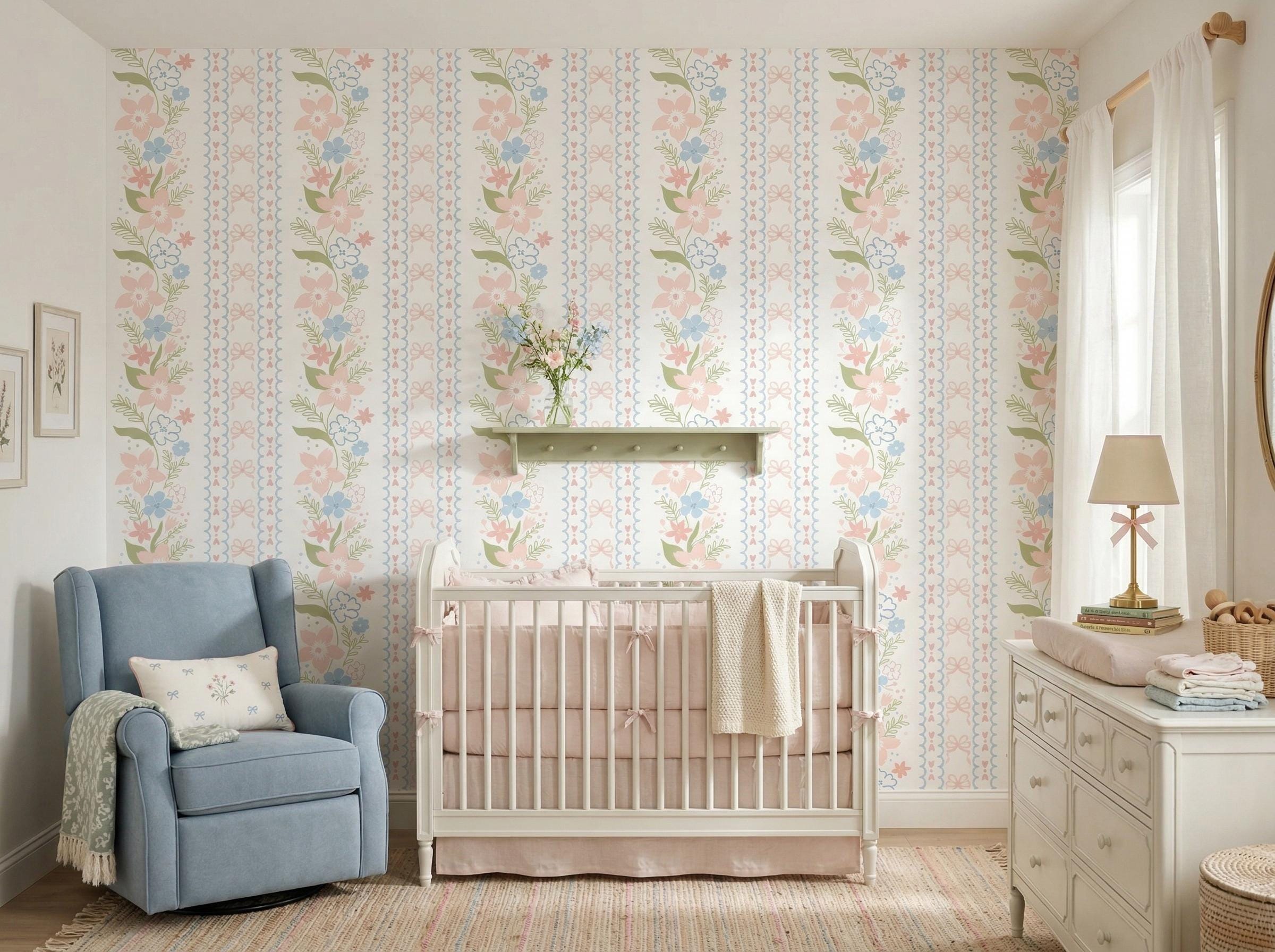 Create a dreamy and charming space with this coquette floral bow grandmillennial wallpaper, featuring soft pastel pink and blue flowers with delicate ribbon details—perfect for nursery decor, baby girl rooms, and vintage-inspired interiors.