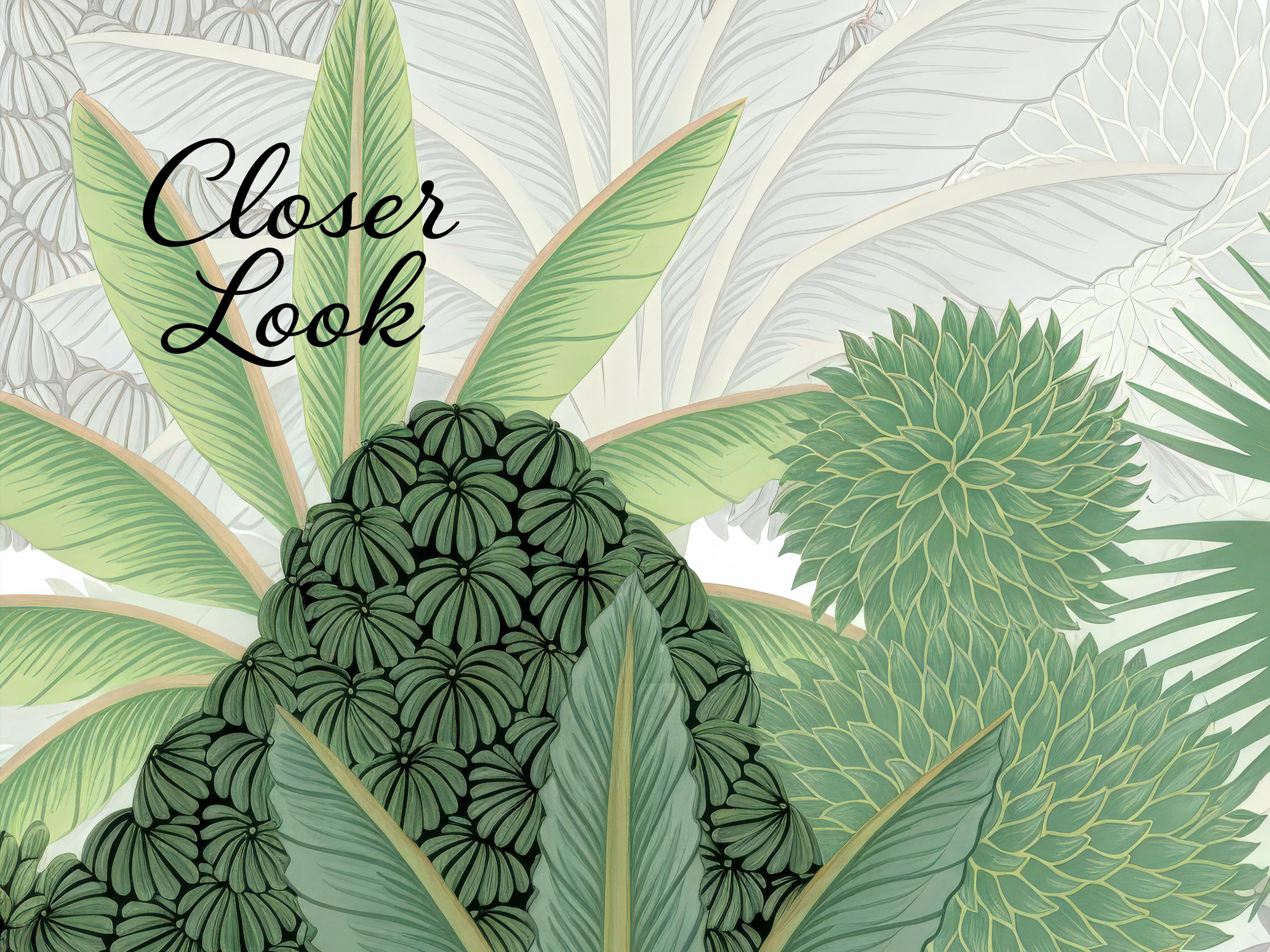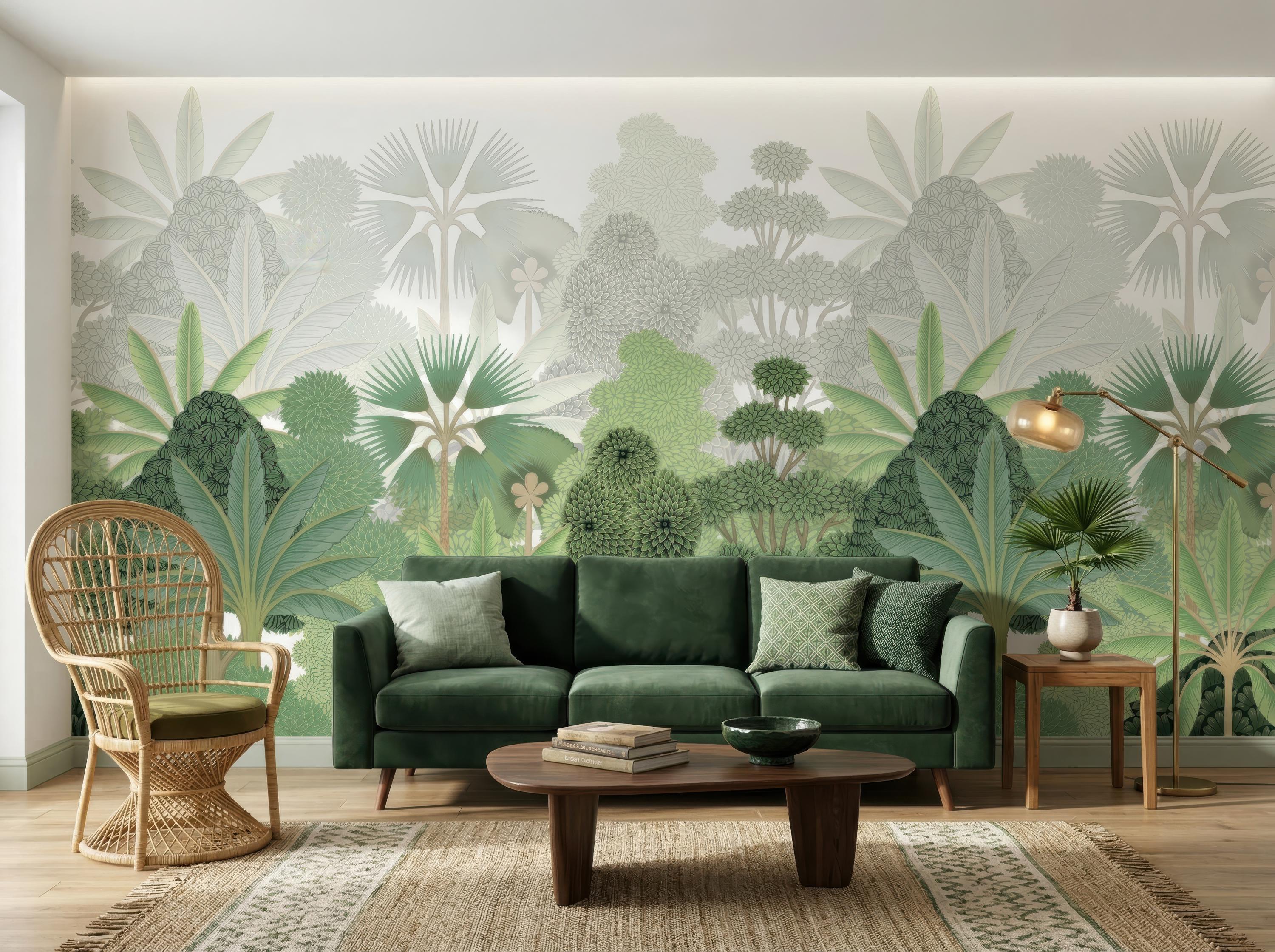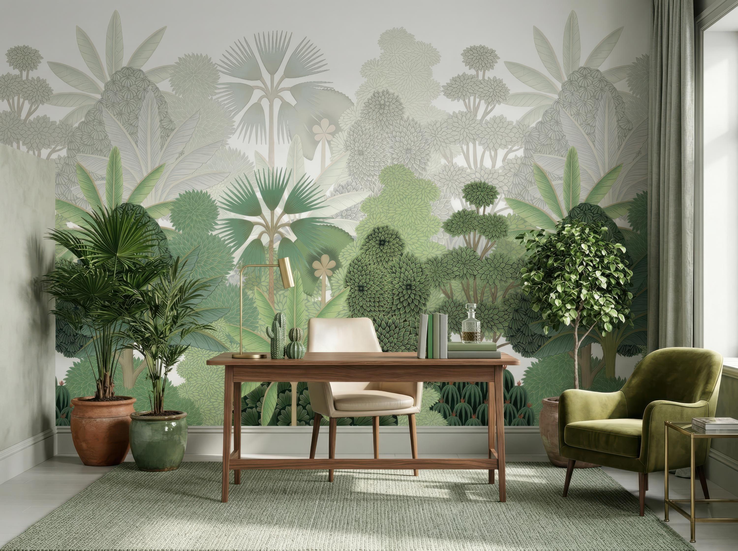 Bring the calming essence of nature indoors with this biophilic wallpaper featuring lush tropical botanical elements in soft green tones. Designed for modern organic interiors, this elegant wall mural creates a serene, airy, and nature-inspired living space.