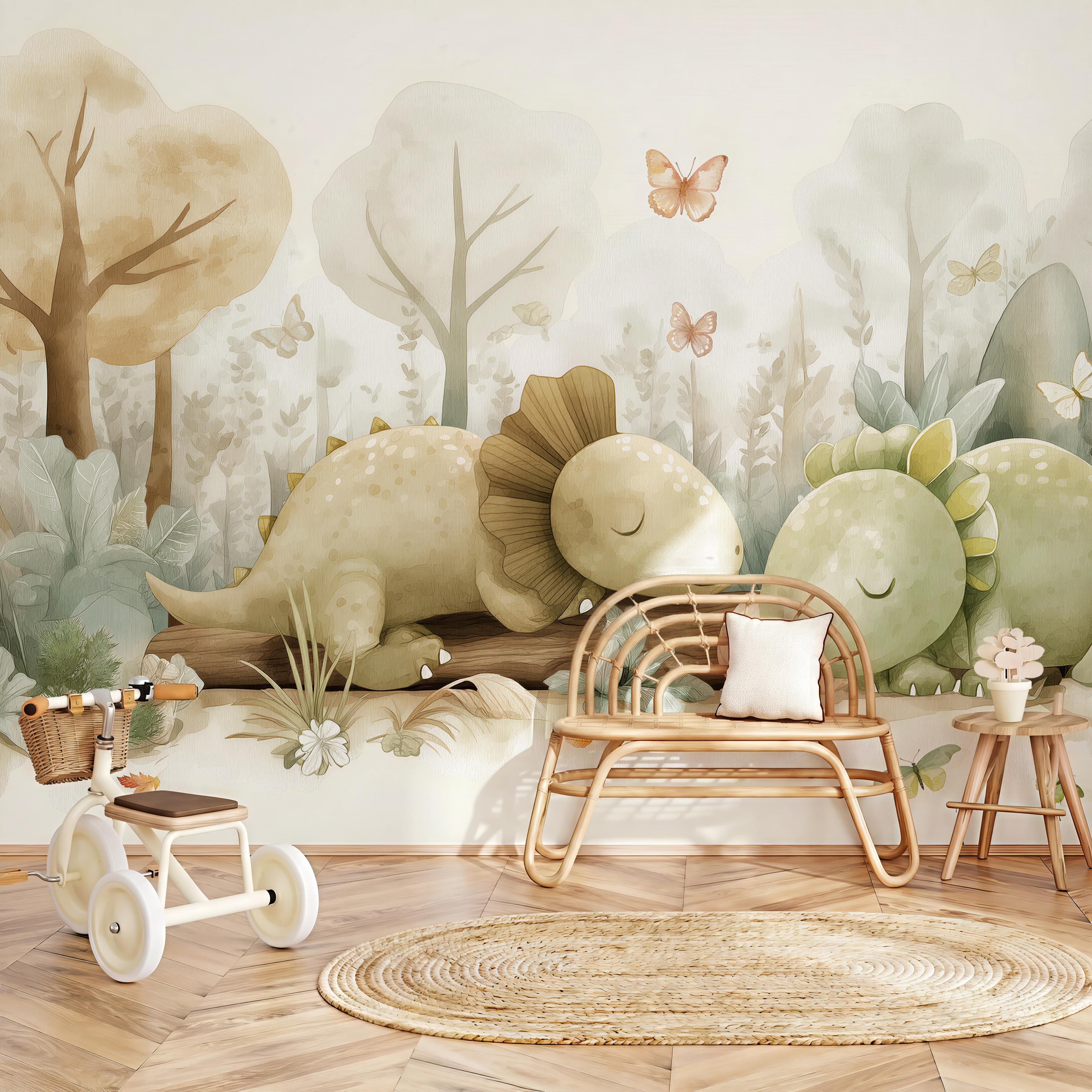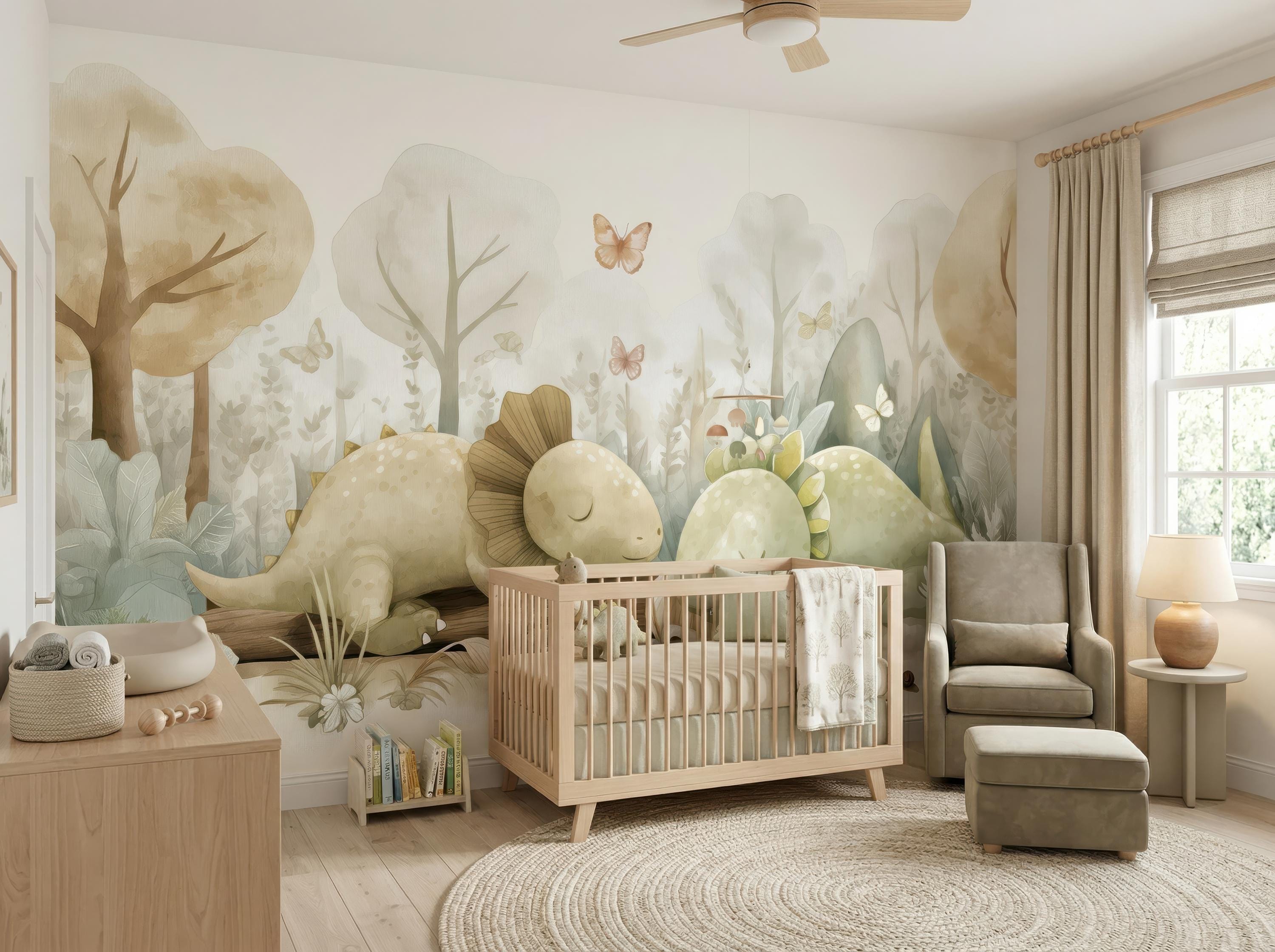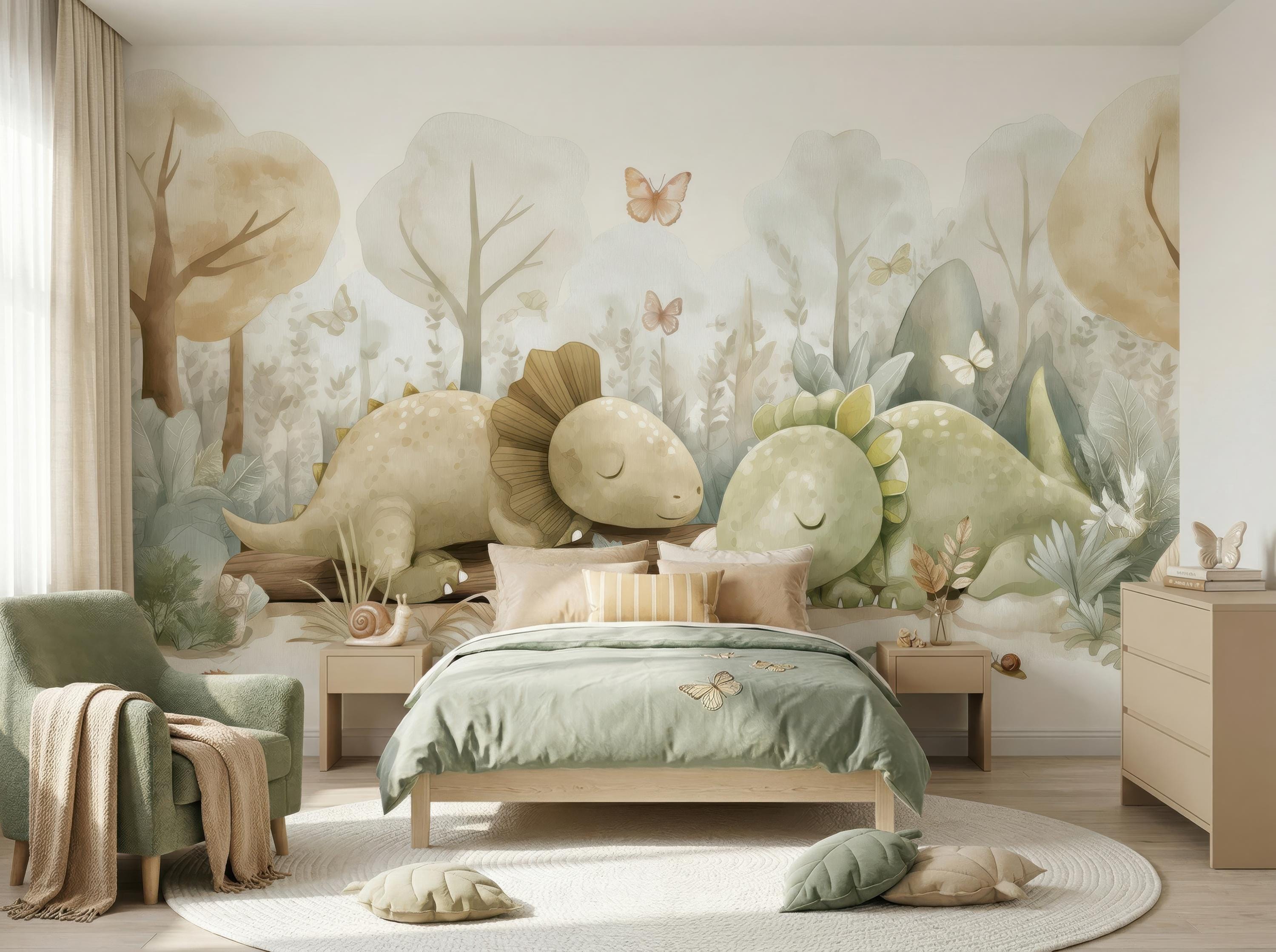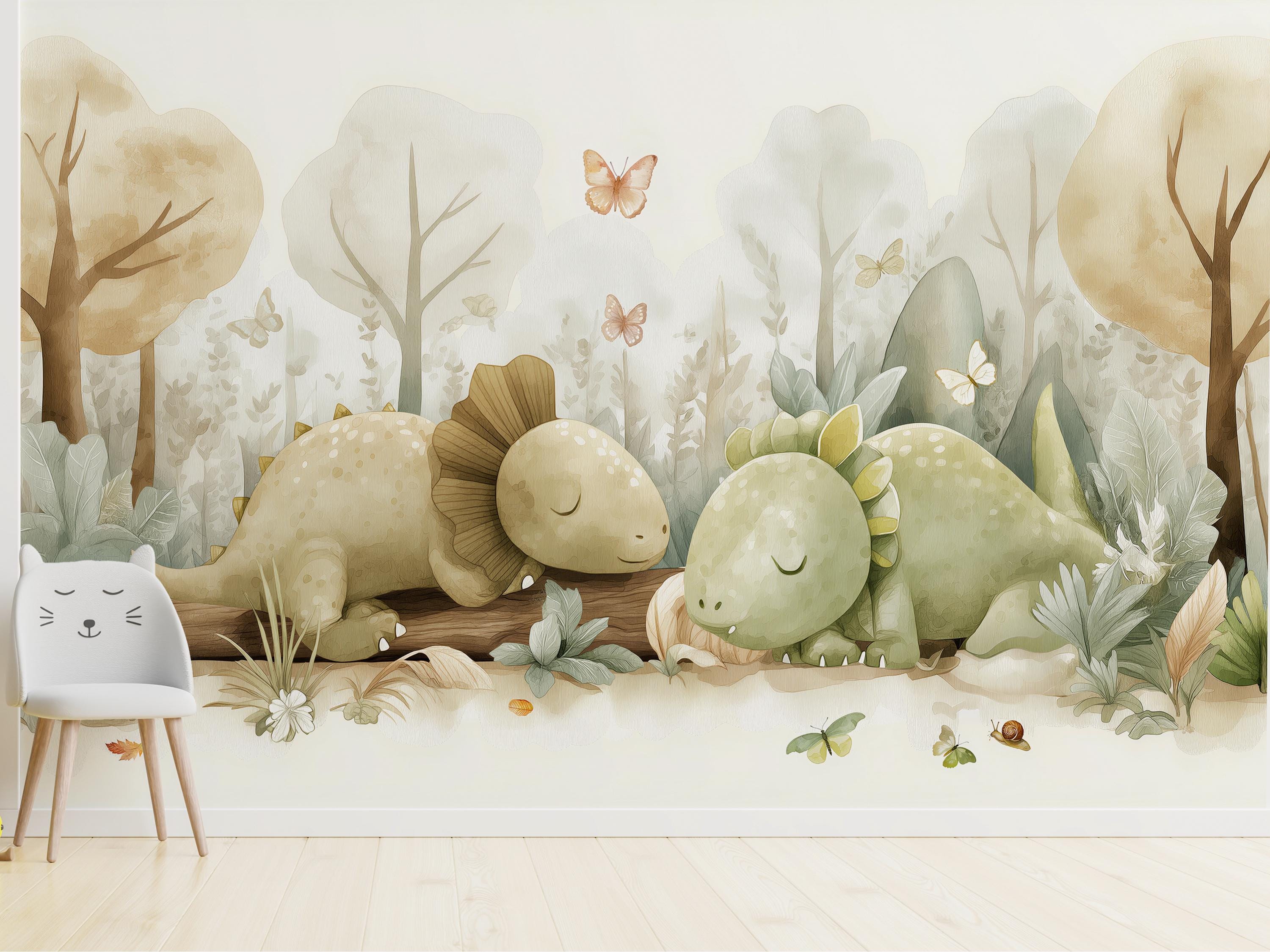 Create a dreamy and calming space with this adorable watercolor dinosaur wall mural, designed in soft neutral tones with gentle forest elements. Perfect for nurseries and kids’ rooms, this charming design features sweet sleeping dinos, butterflies, and nature details that bring warmth and imagination into your home.