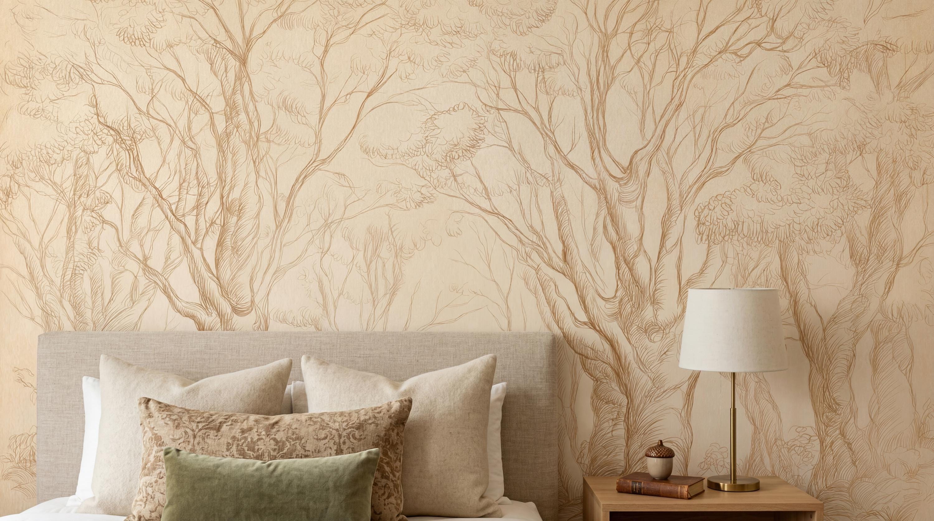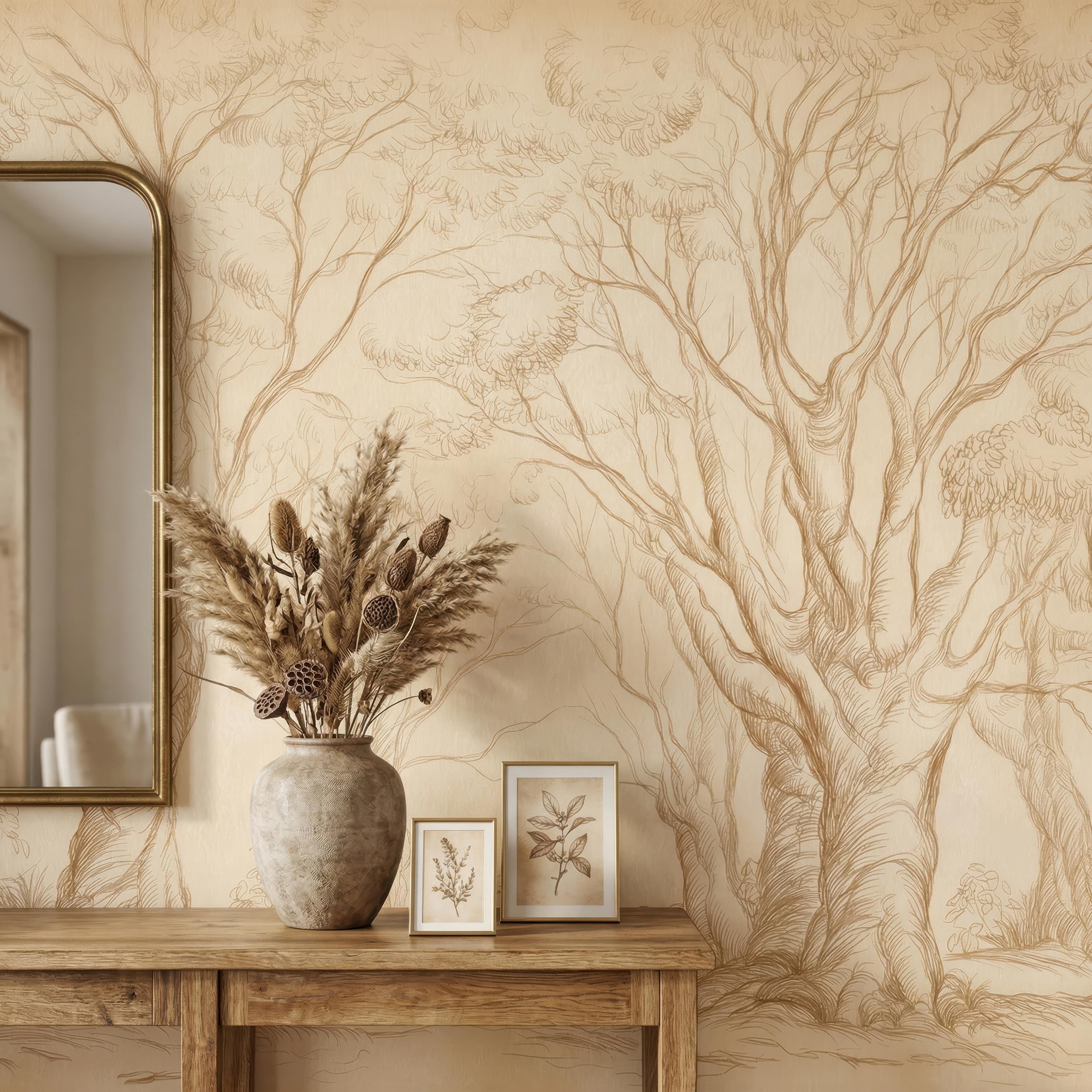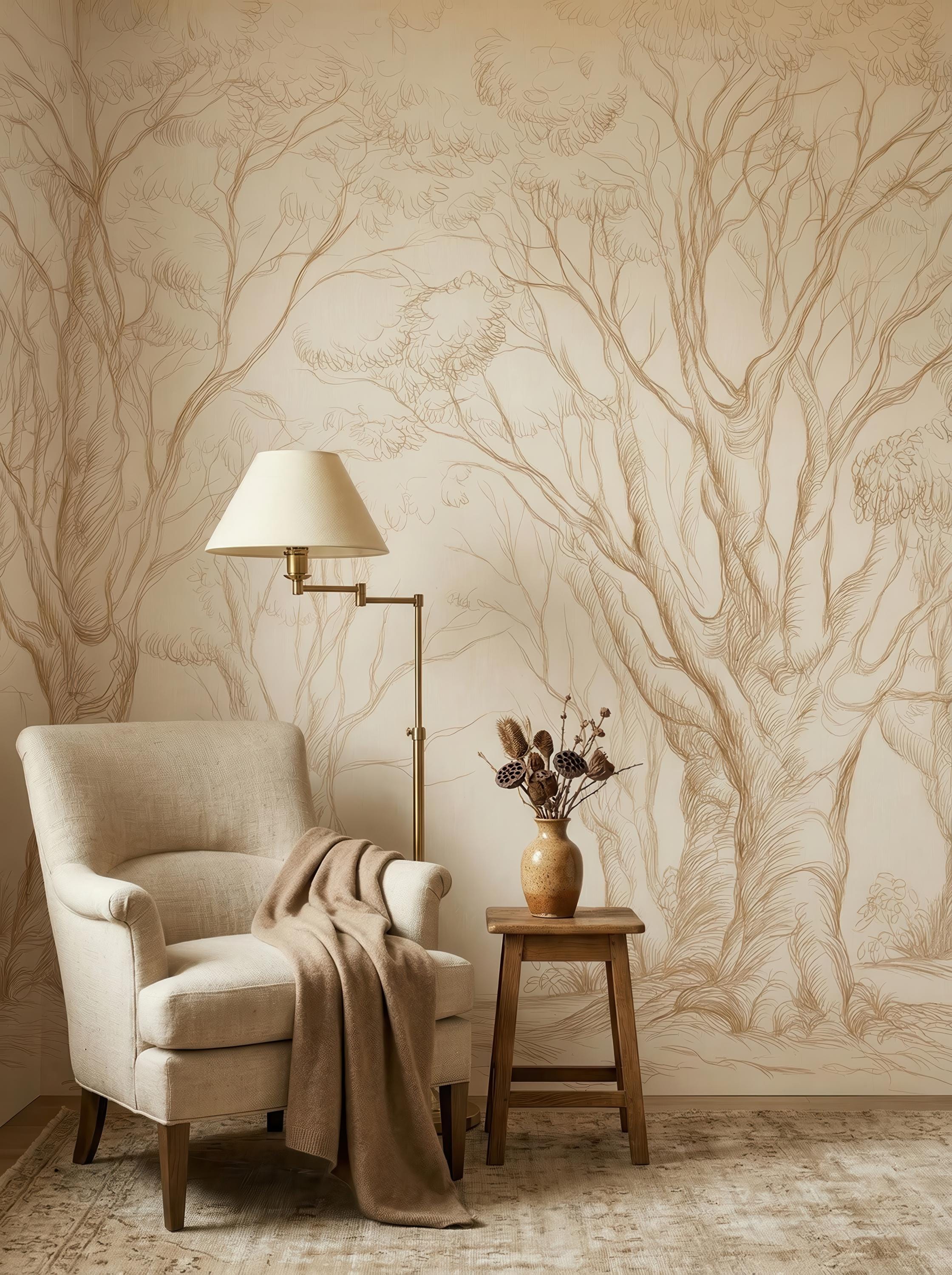 Bring calm and timeless elegance into your home with this neutral tree sketch wallpaper, designed with soft beige tones and delicate botanical line art. Perfect for Scandinavian, minimalist, and modern rustic interiors, this nature-inspired wall mural creates a warm and inviting atmosphere in any space. 🌿