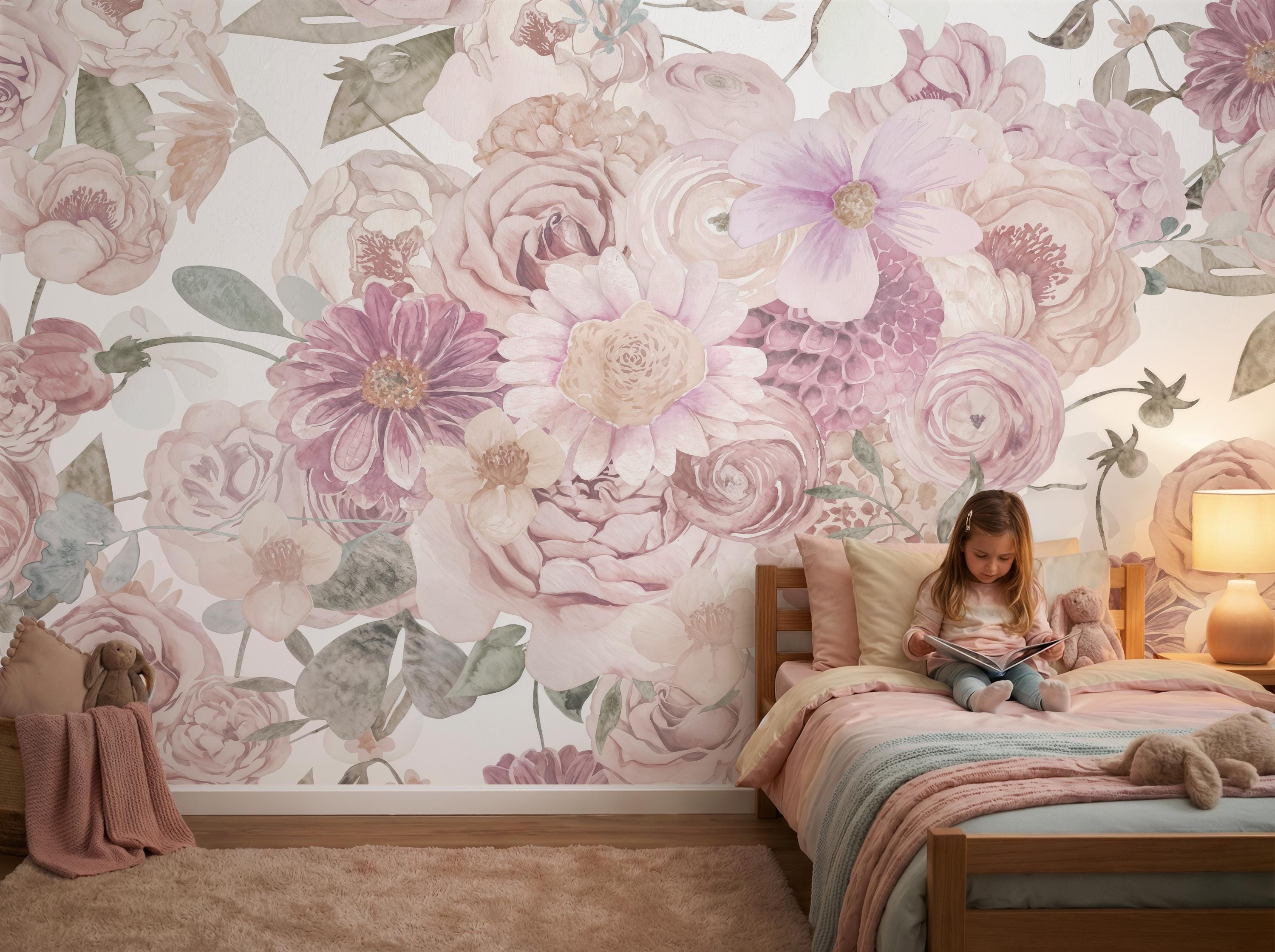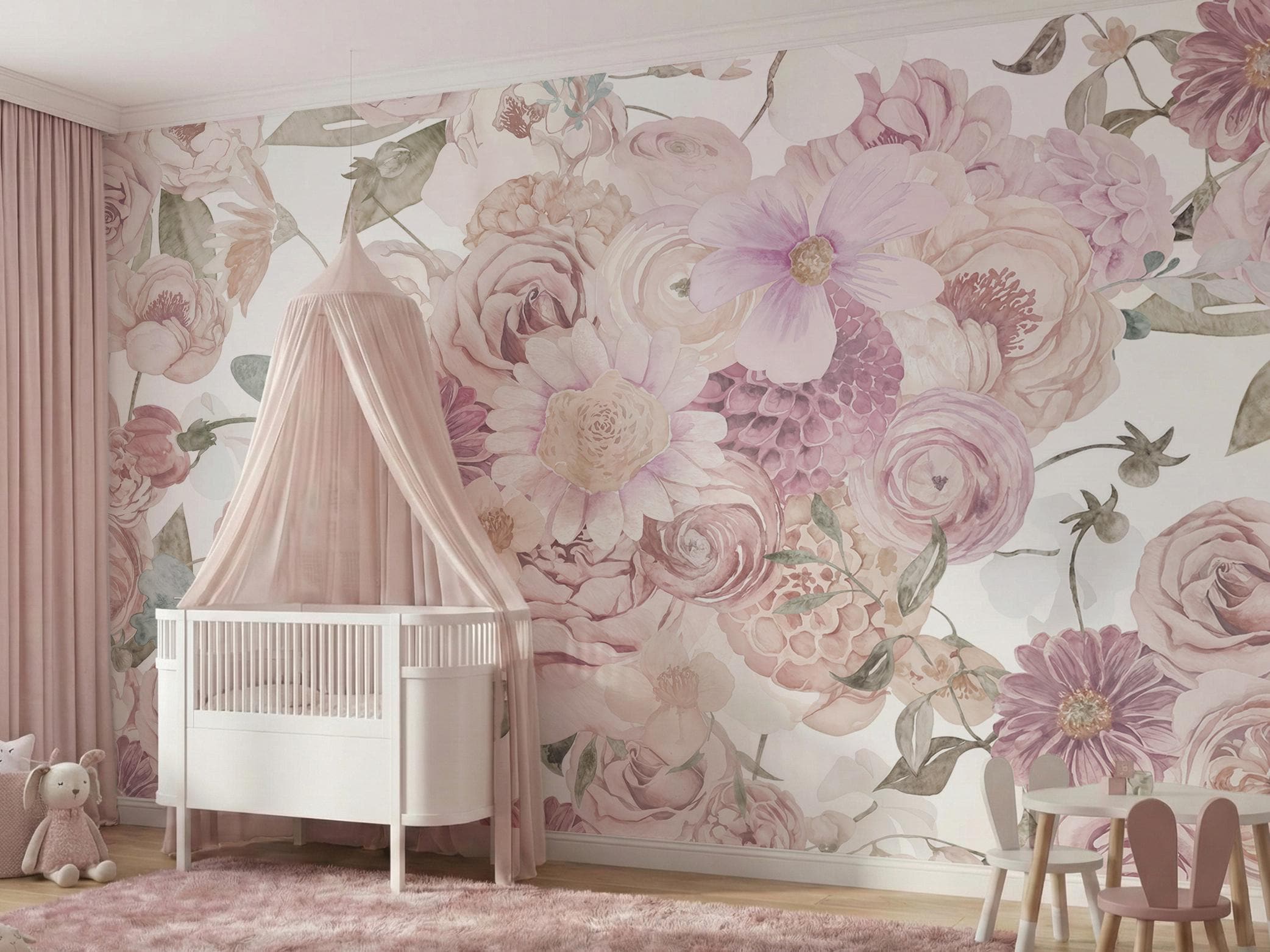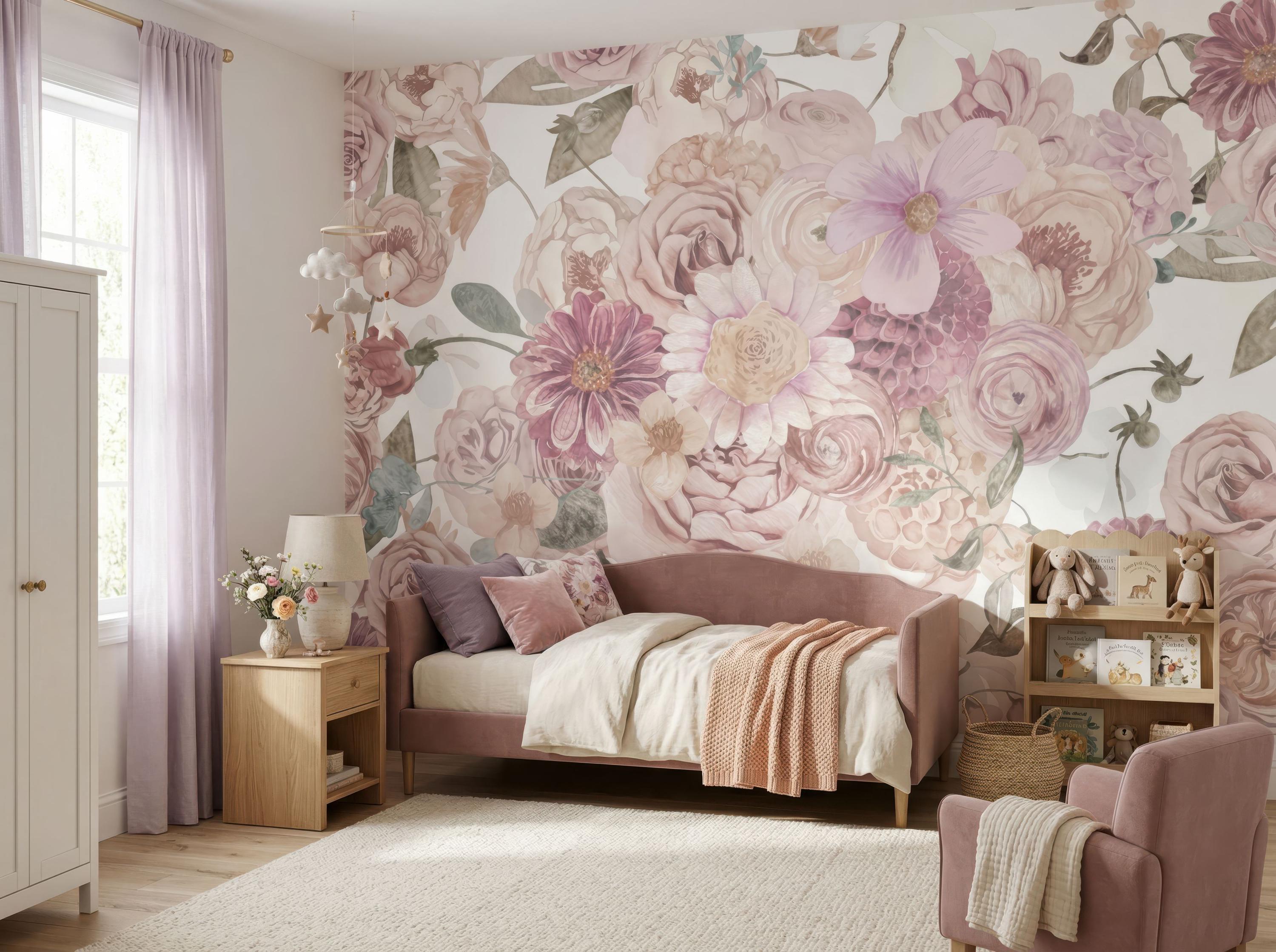 Create a dreamy and elegant atmosphere with this blush pink floral wall mural featuring soft watercolor flowers in delicate pastel tones. Perfect for nurseries, girls’ bedrooms, or feminine living spaces, this design brings warmth, charm, and timeless beauty 🌸