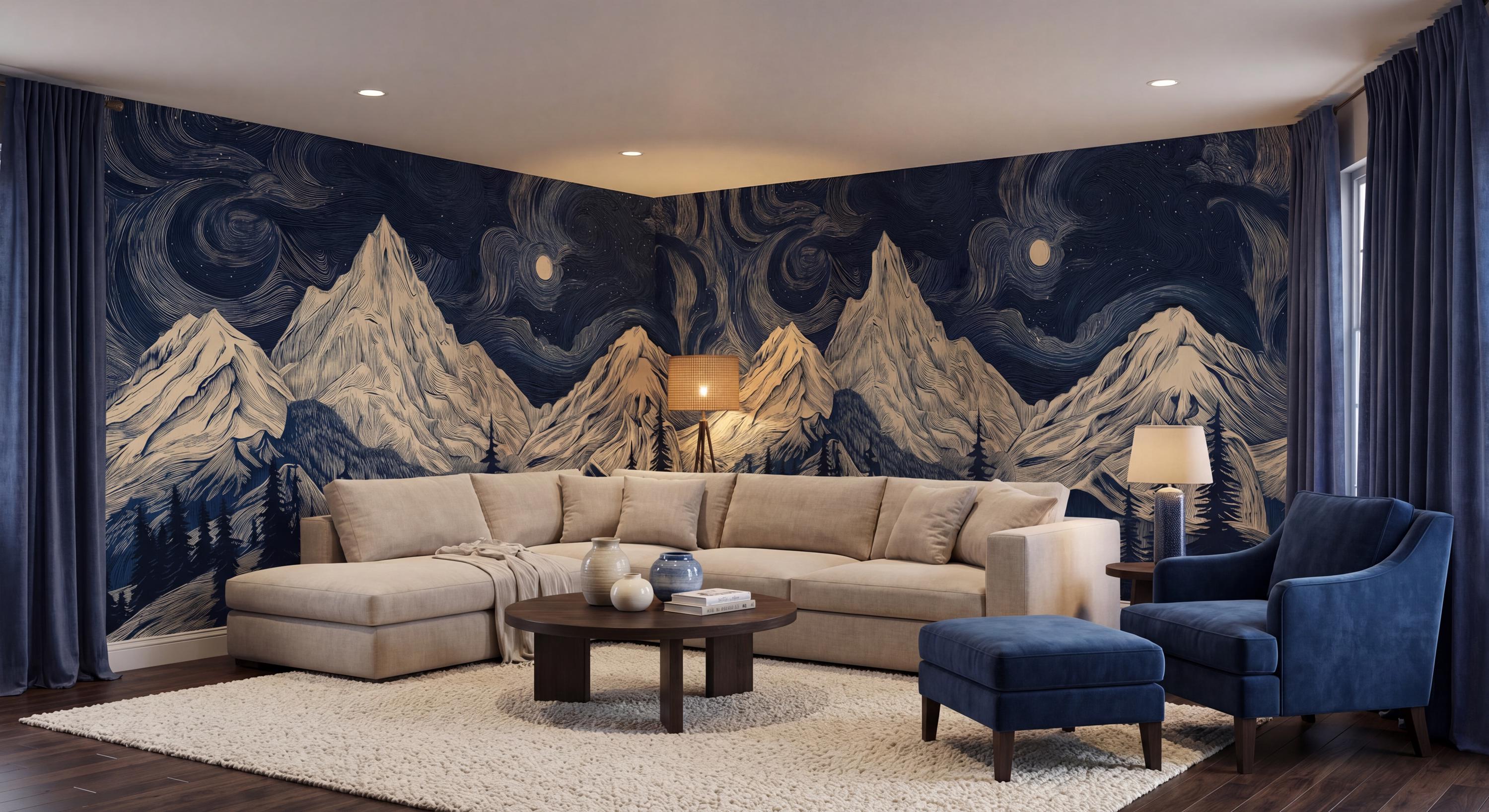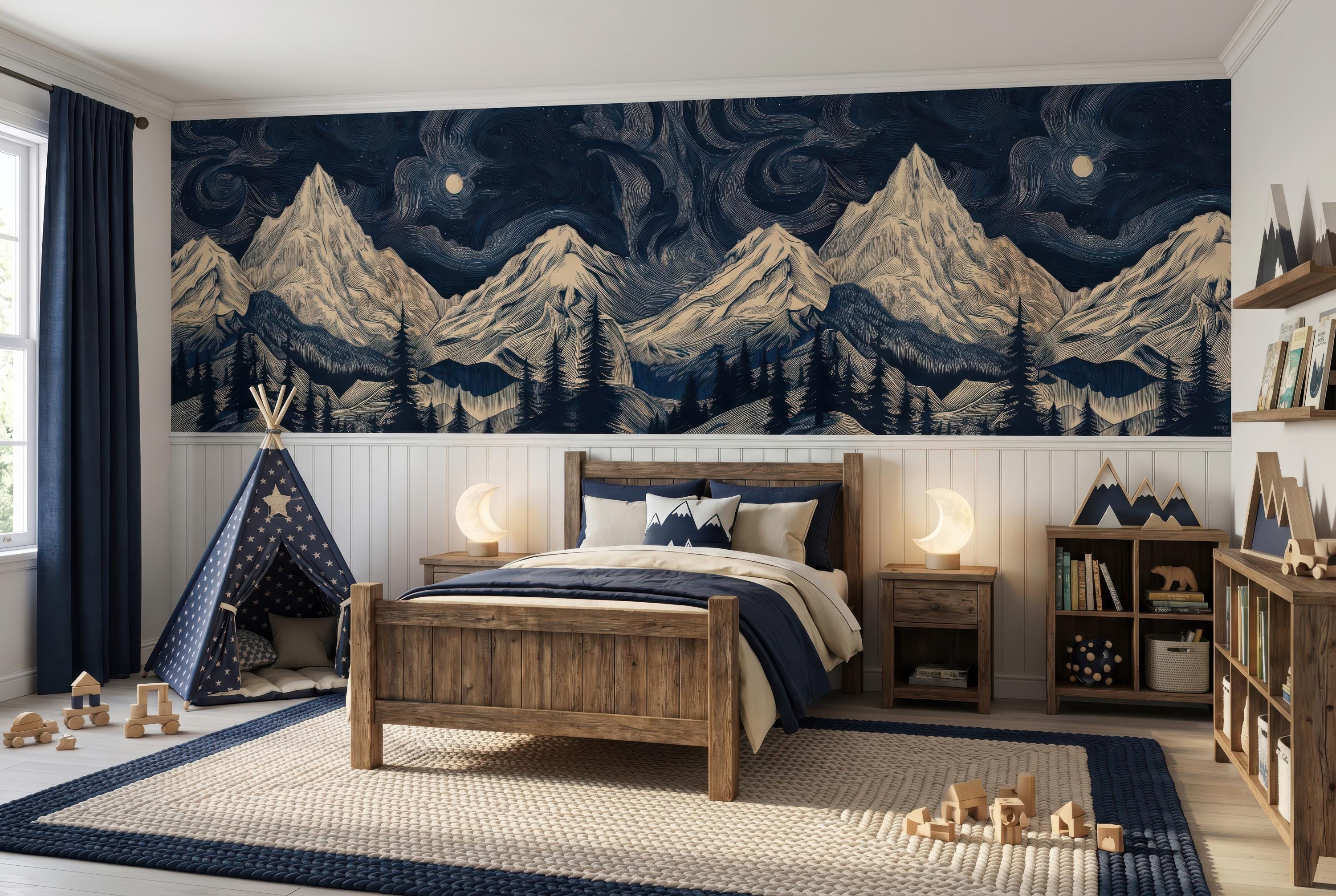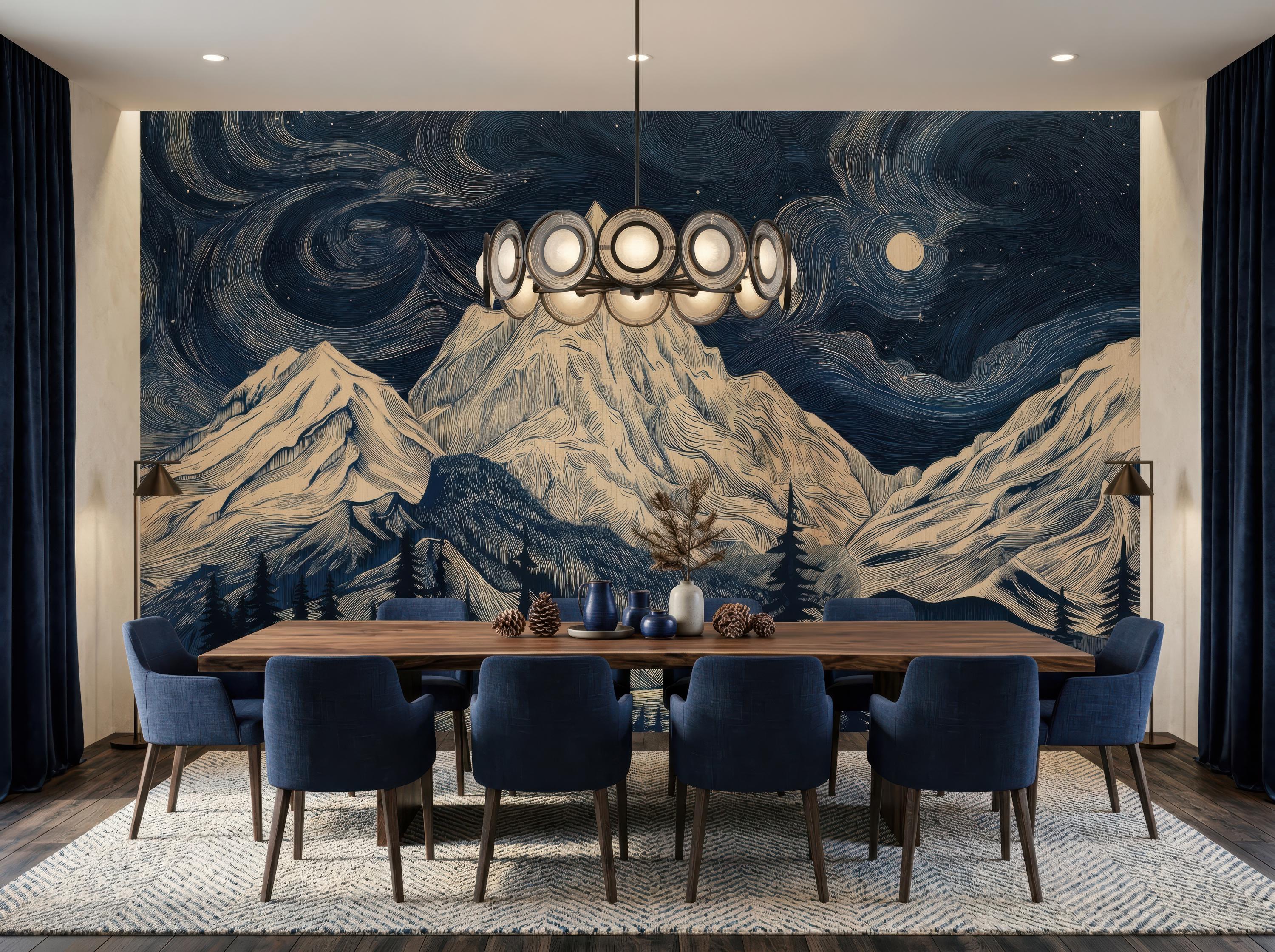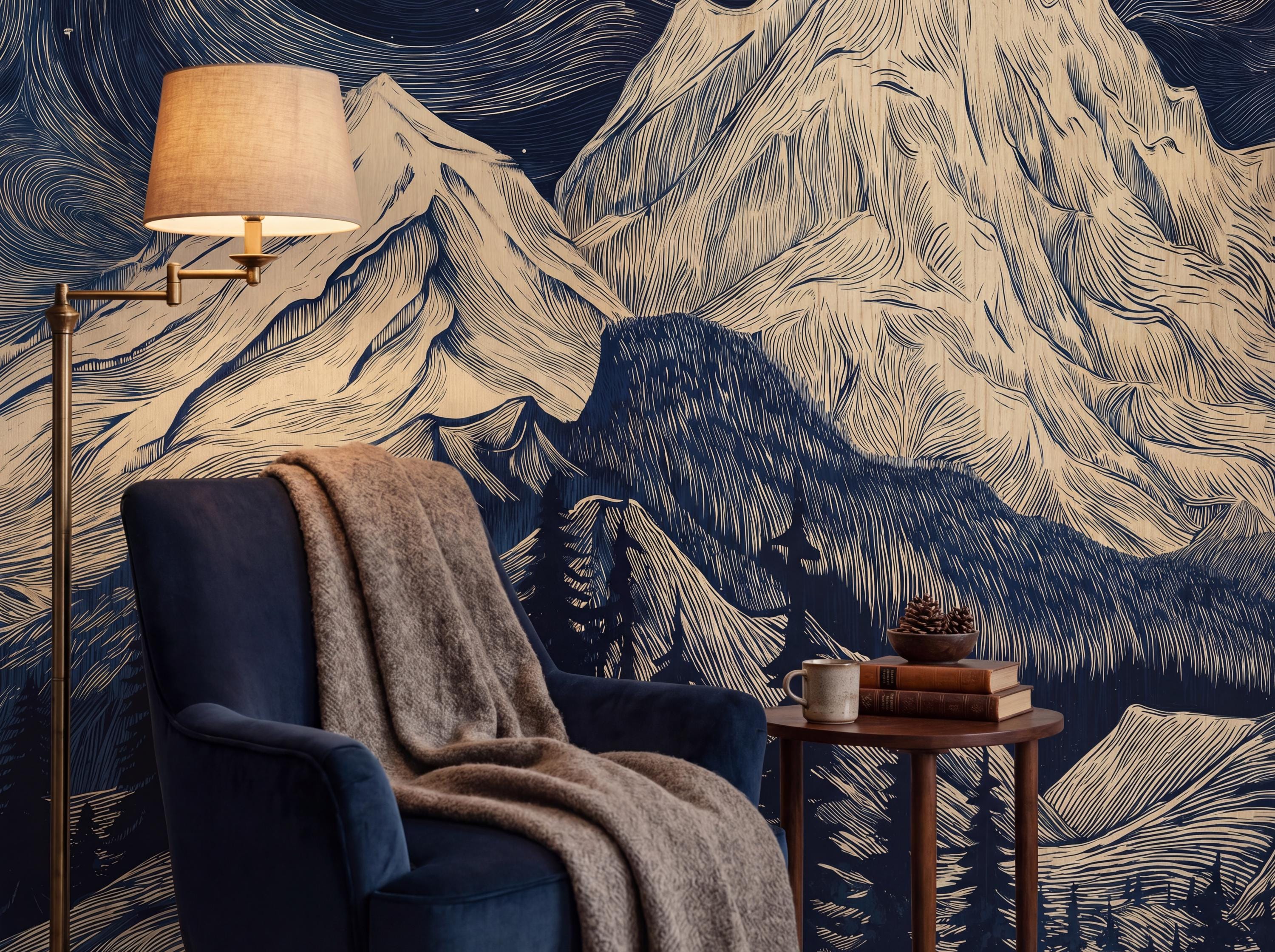 Elevate your interior with this stunning navy blue mountain wall mural featuring a dreamy starry night sky and detailed alpine landscape. This bold yet elegant wallpaper blends modern design with nature-inspired artistry, creating a cozy and sophisticated atmosphere. 🌙✨