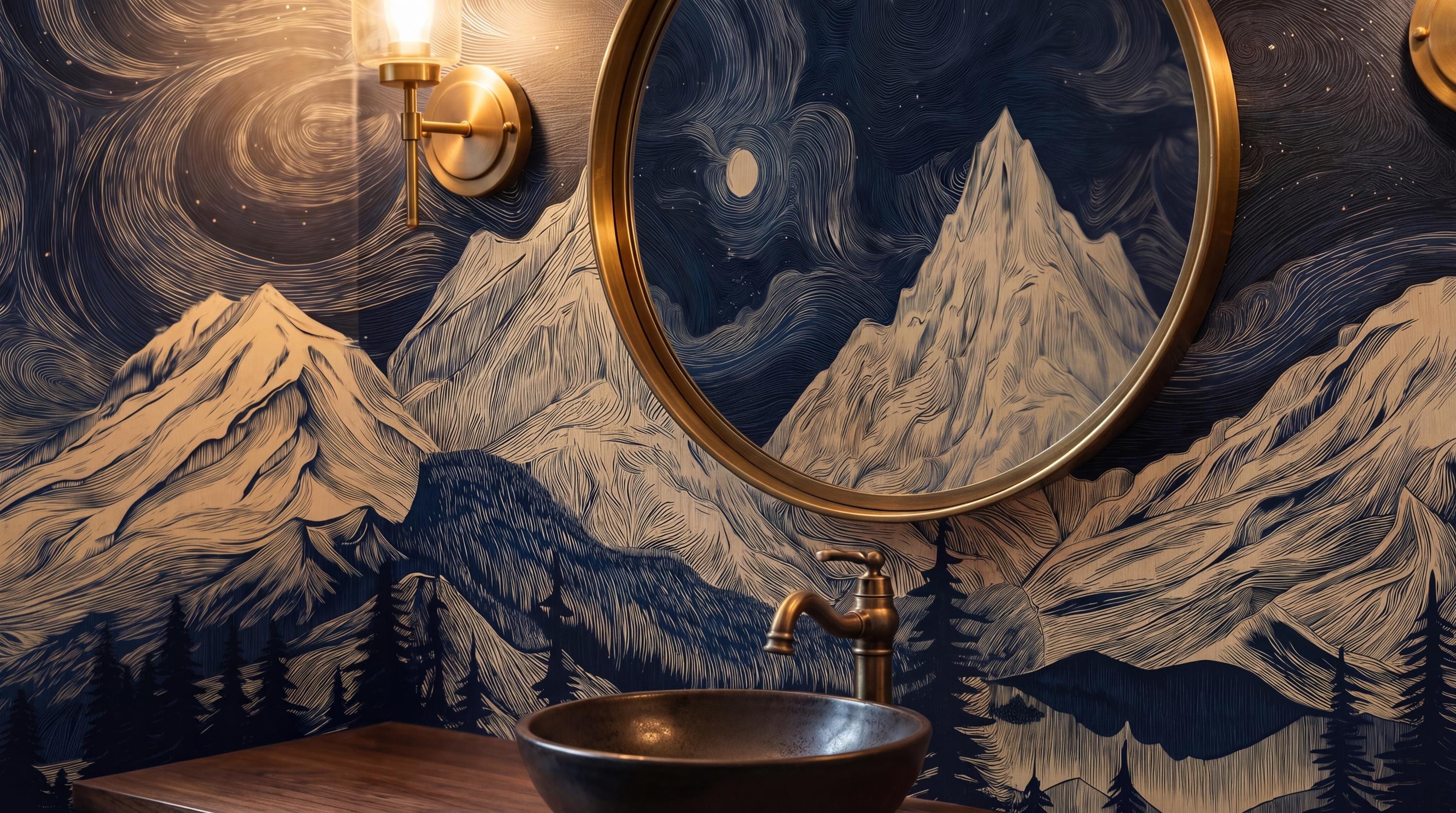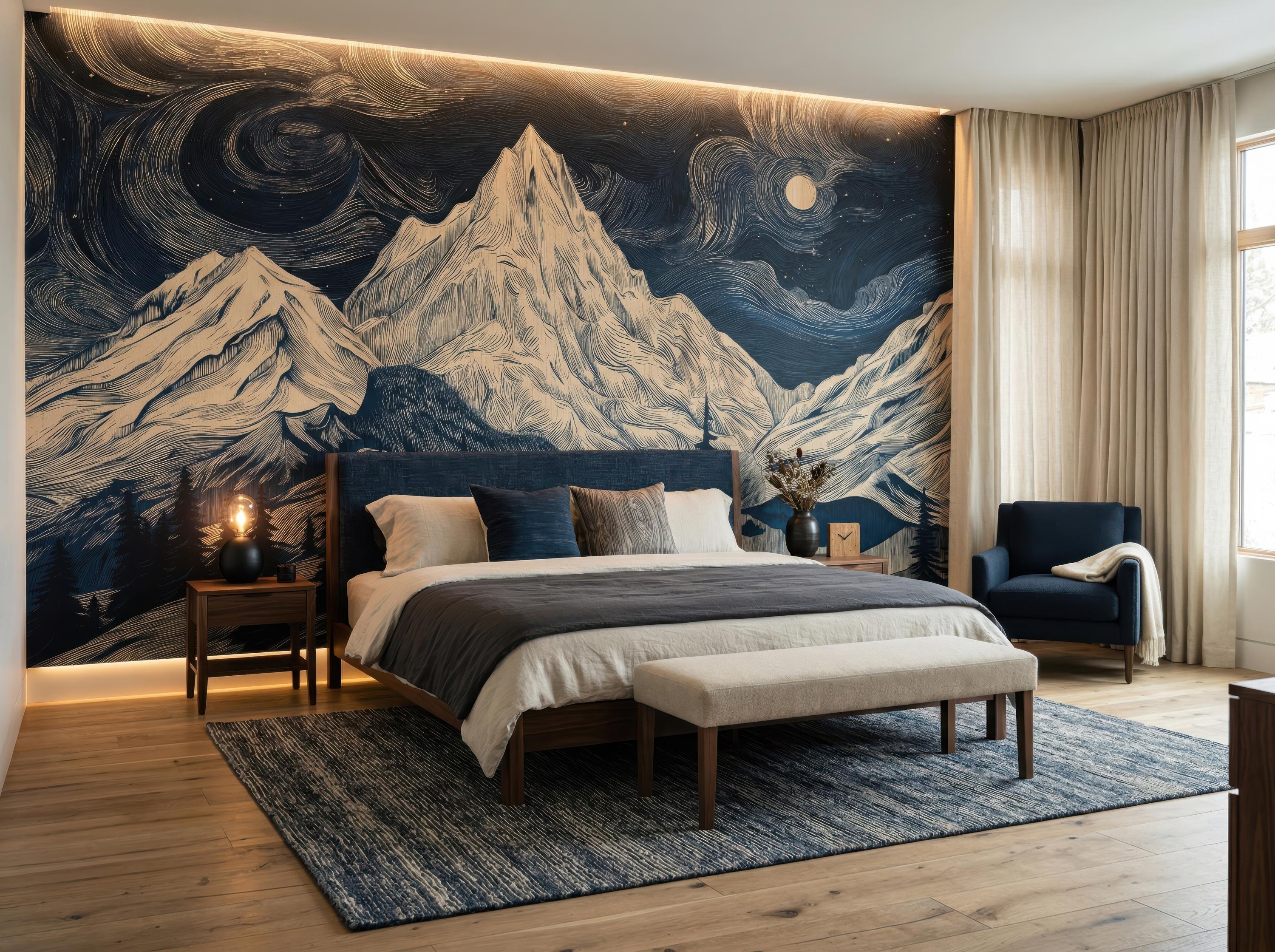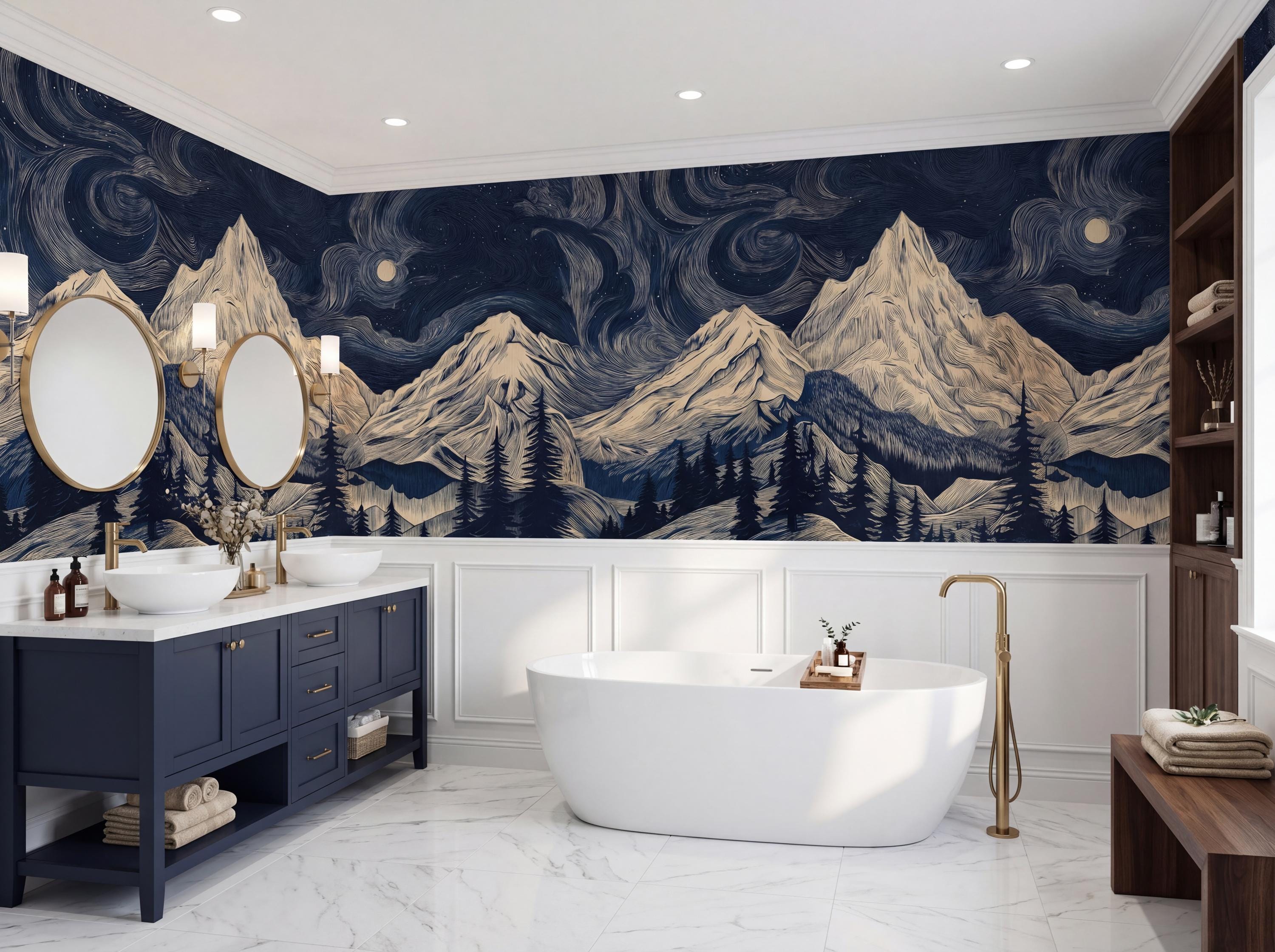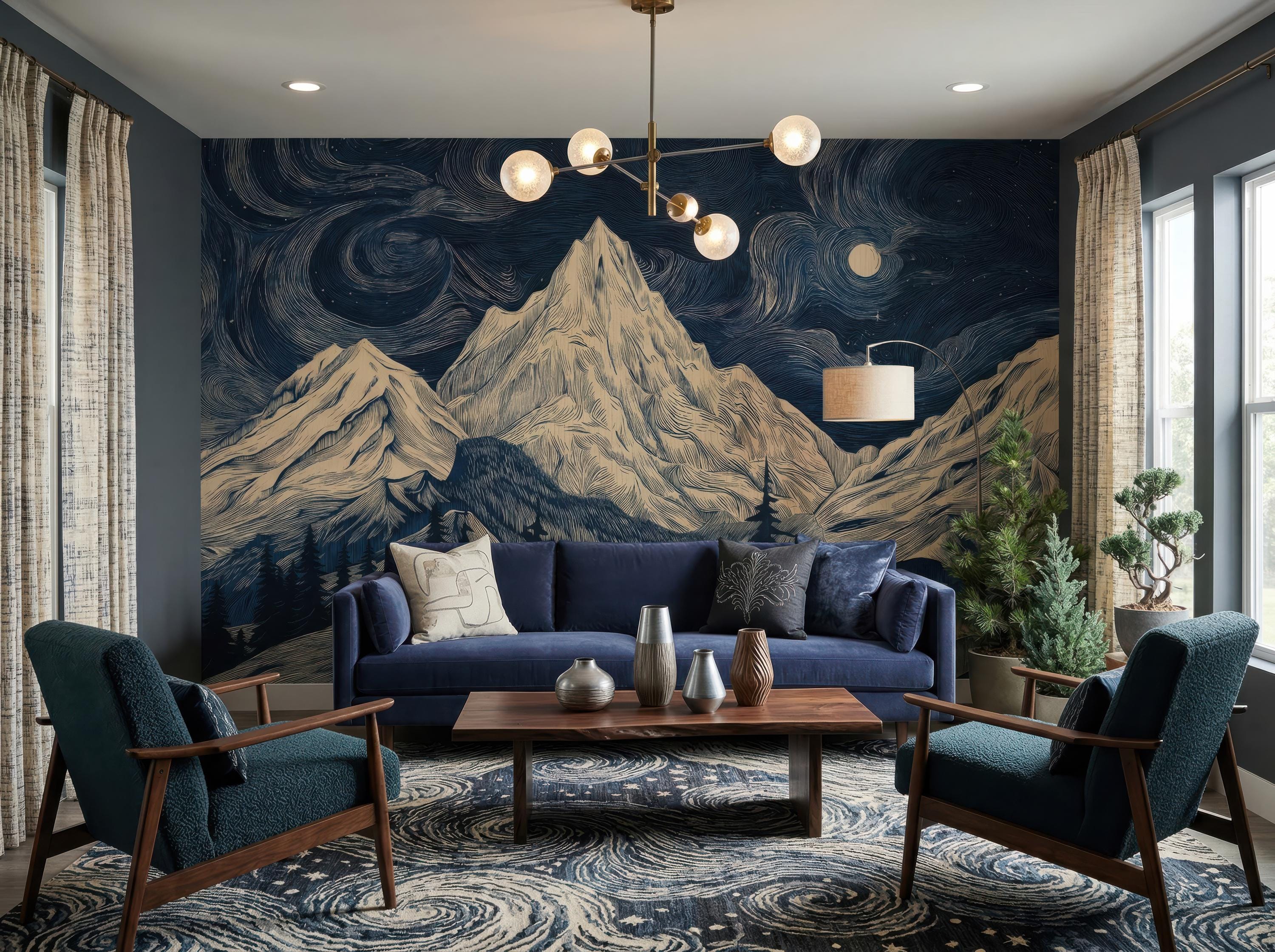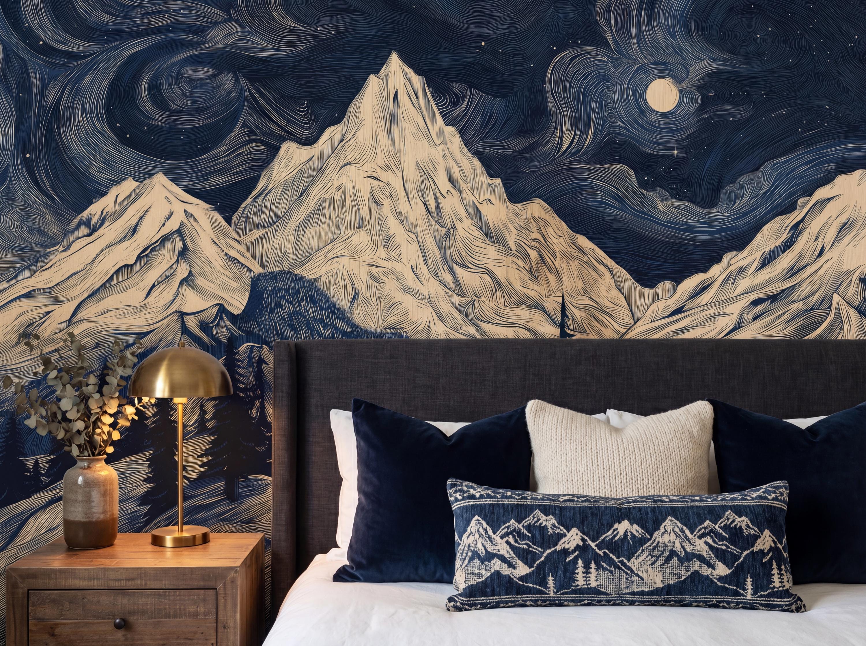 Elevate your interior with this stunning navy blue mountain wall mural featuring a dreamy starry night sky and detailed alpine landscape. This bold yet elegant wallpaper blends modern design with nature-inspired artistry, creating a cozy and sophisticated atmosphere. 🌙✨
