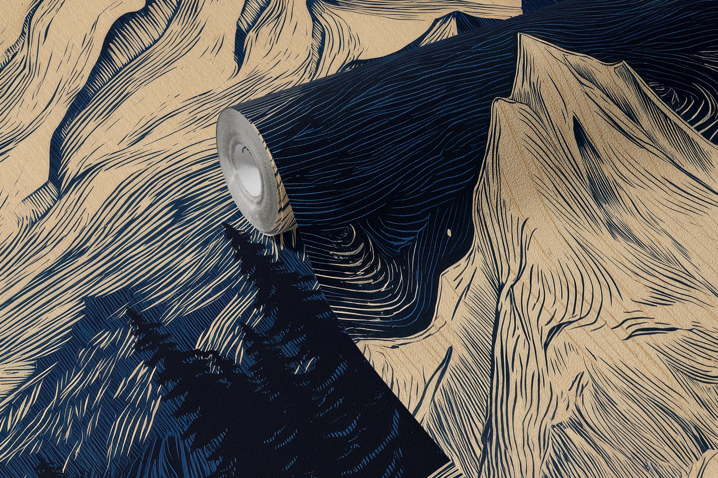 Starry Night Mountain Wall Mural, Navy Blue Etched Landscape Wallpaper (Peel & Stick / Traditional )