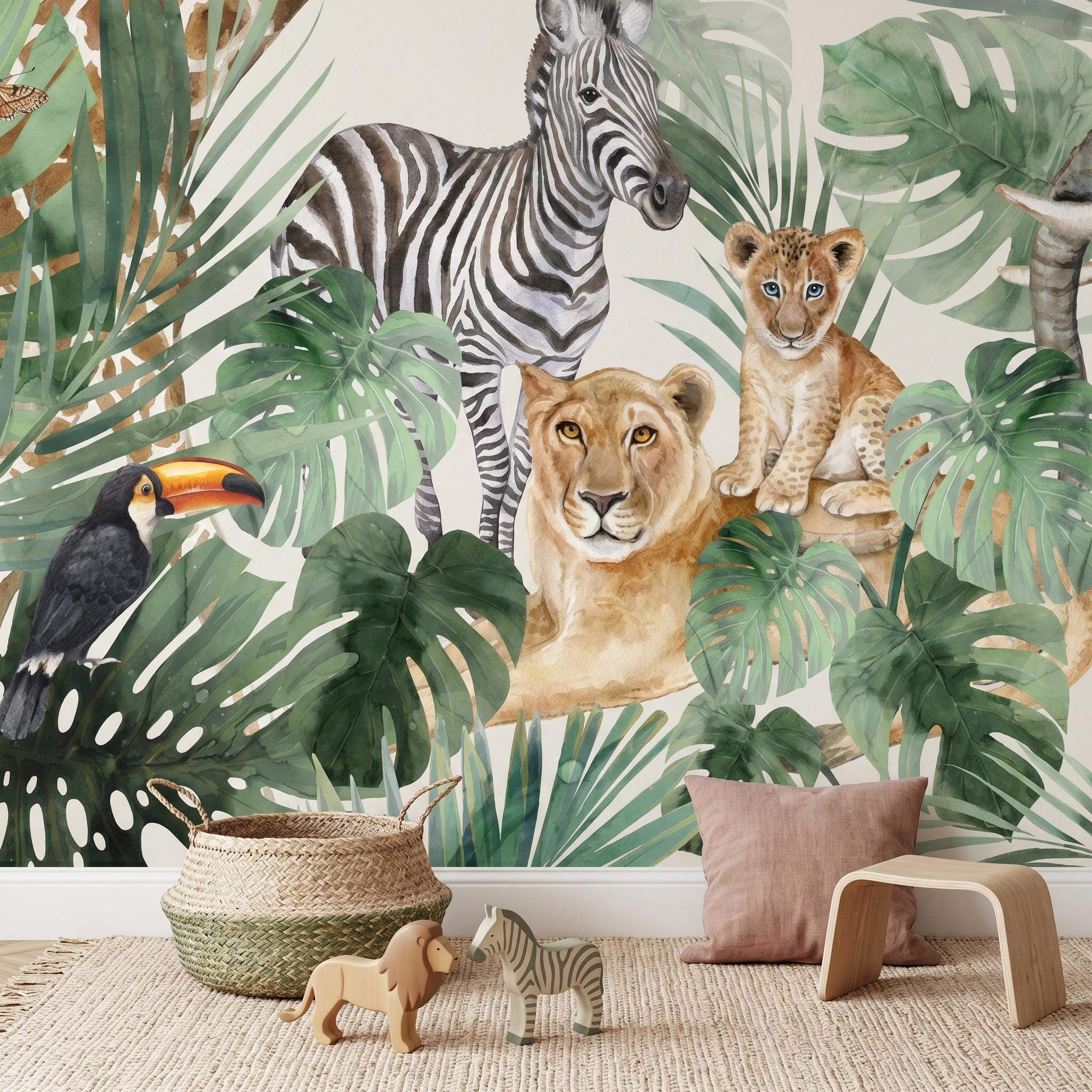 Create a calming yet adventurous space with this watercolor safari nursery wallpaper featuring jungle animals and tropical leaves. Designed to bring nature indoors, this wall mural adds warmth, charm, and a playful atmosphere to any baby room or kids bedroom. 🦒🌿