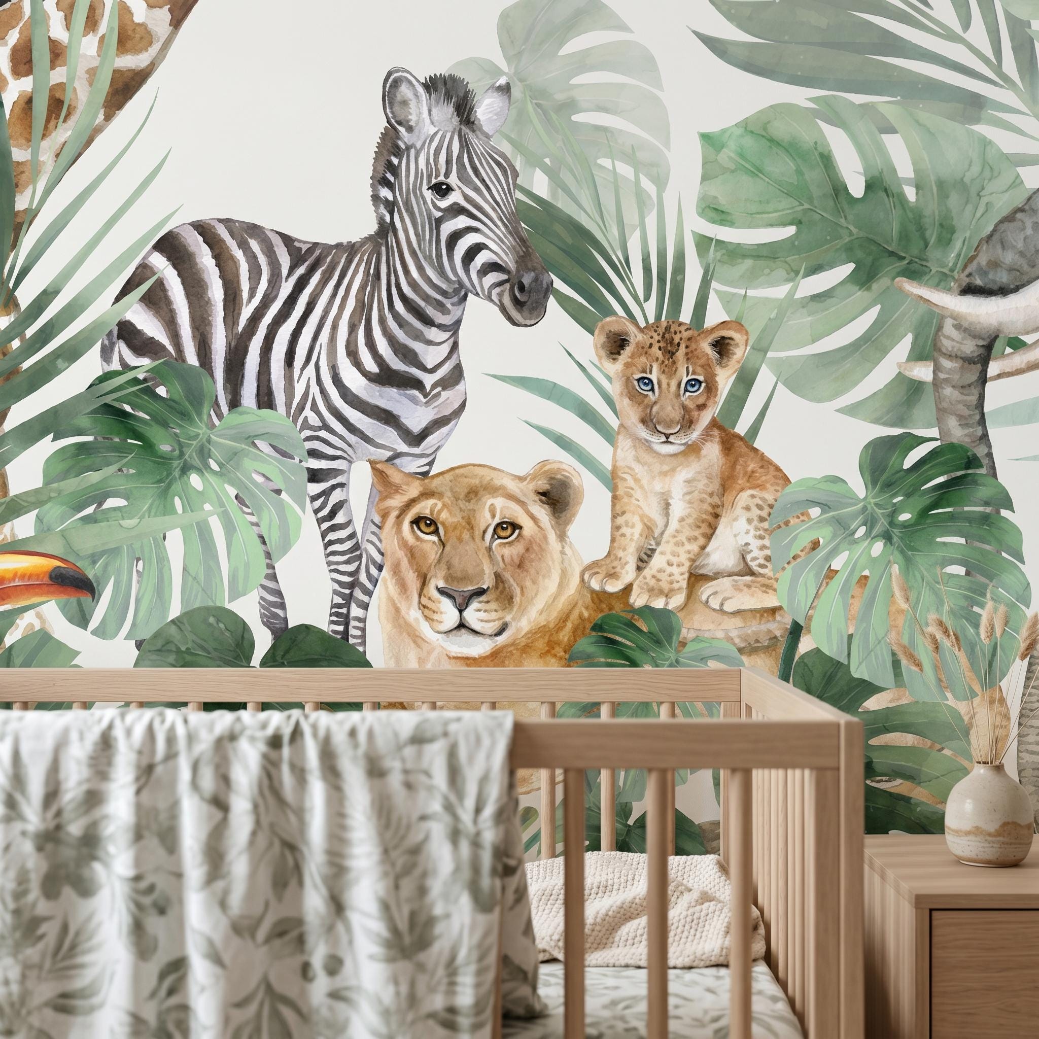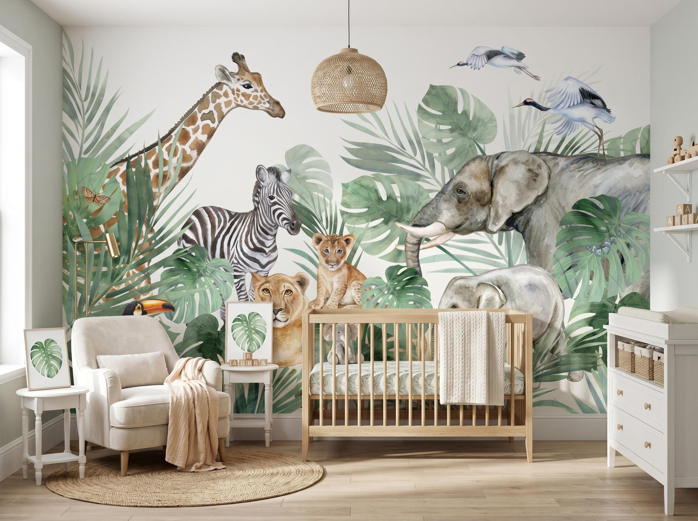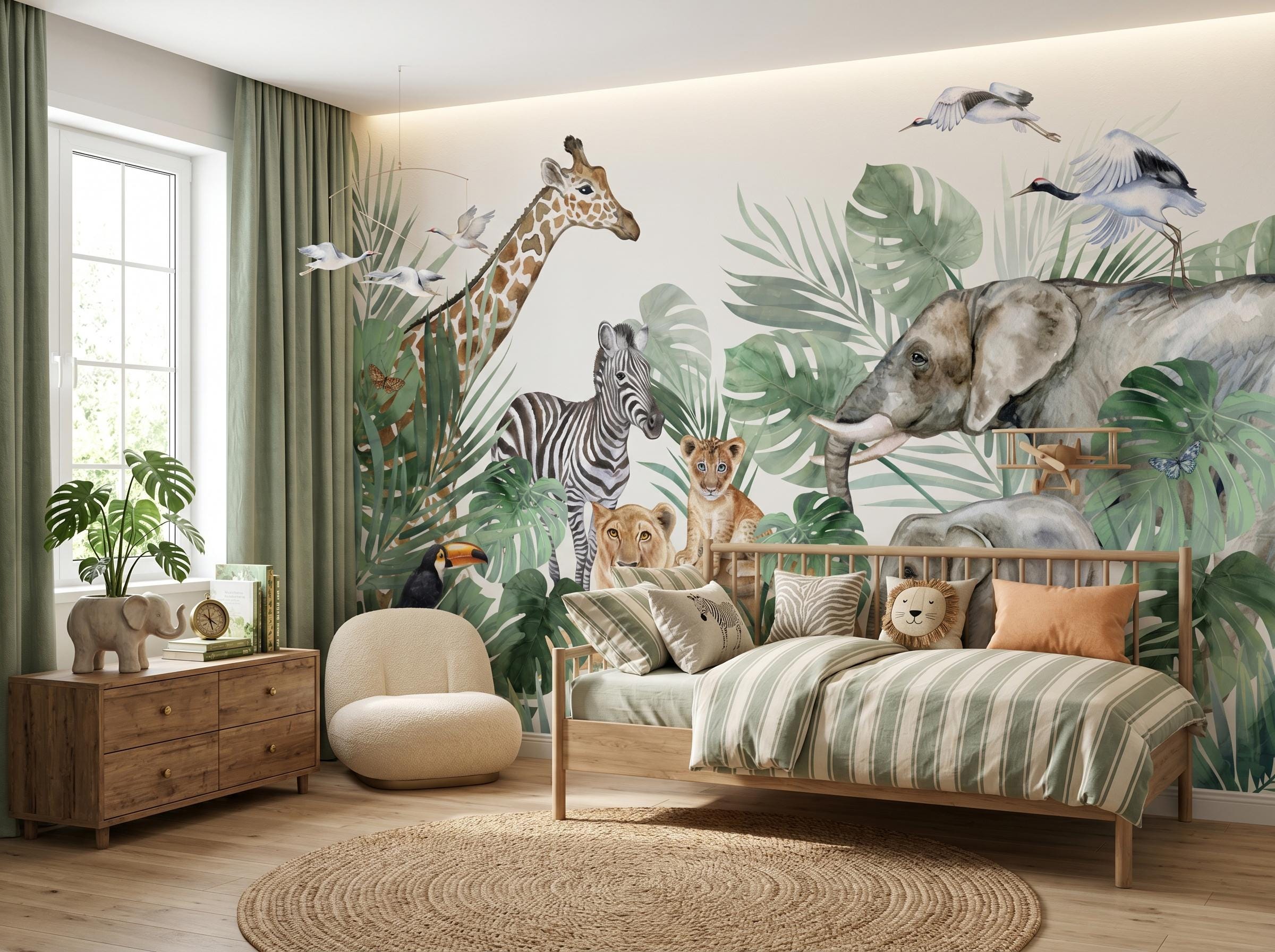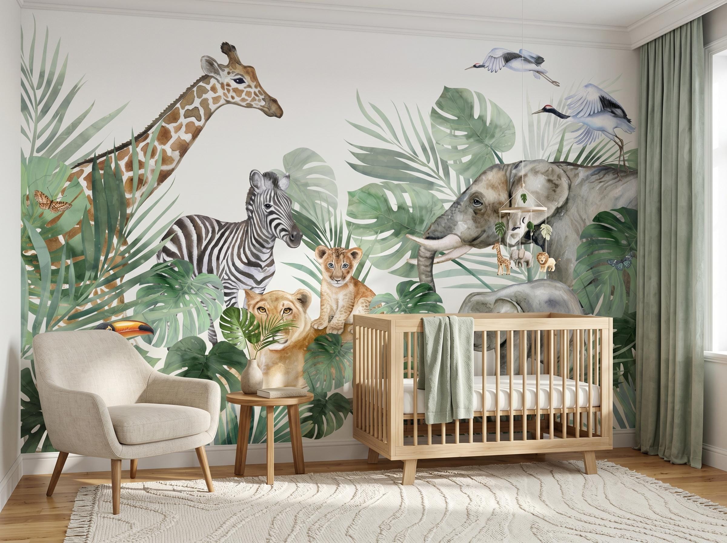* 🐘 Safari Animal Theme: Includes giraffe, elephant, zebra, lion, and exotic birds in a soft watercolor style