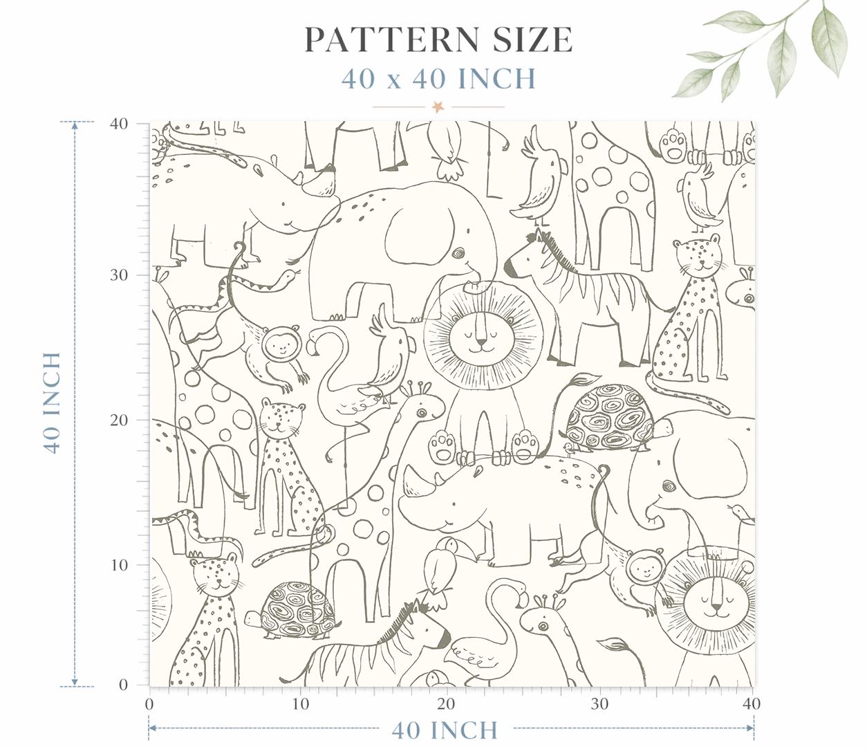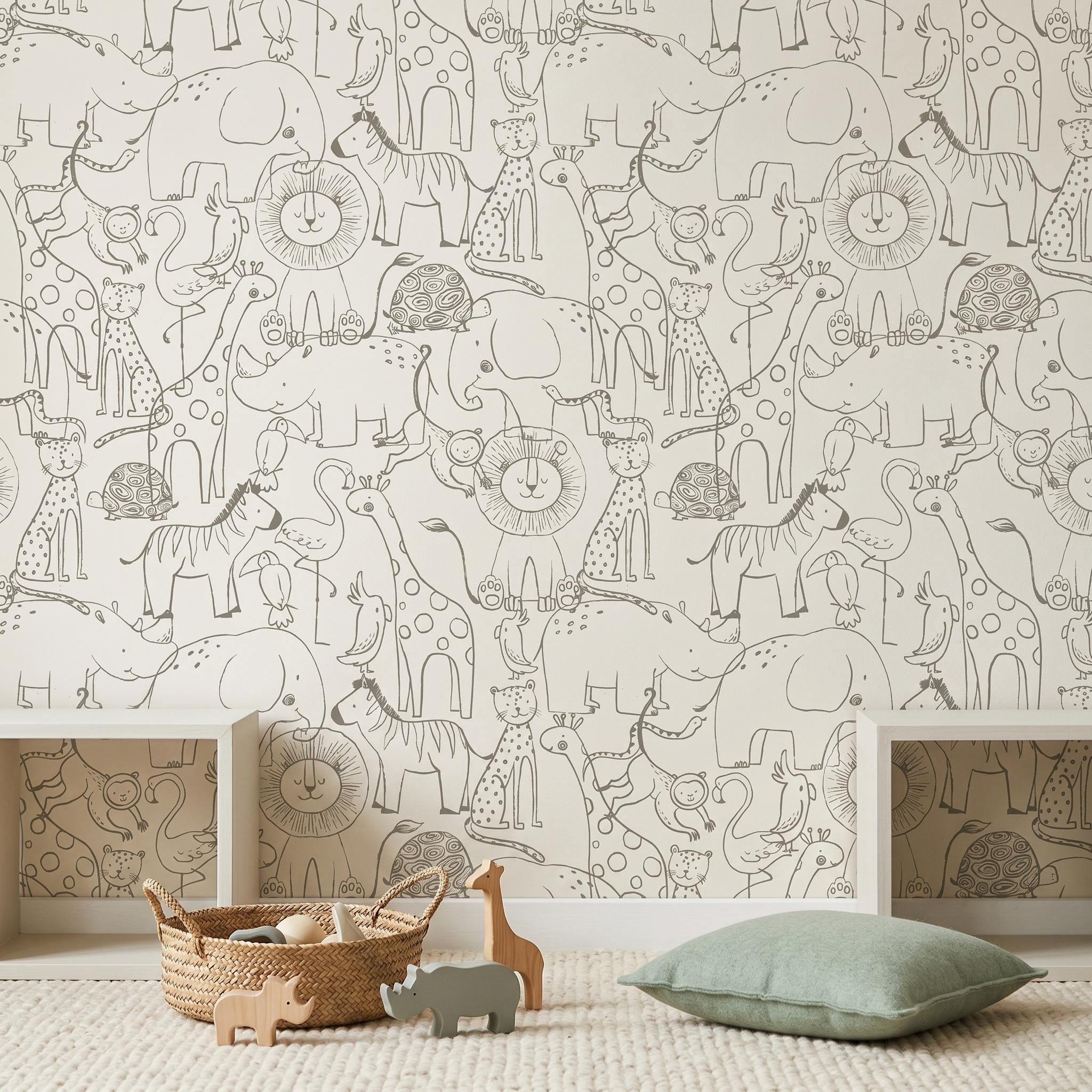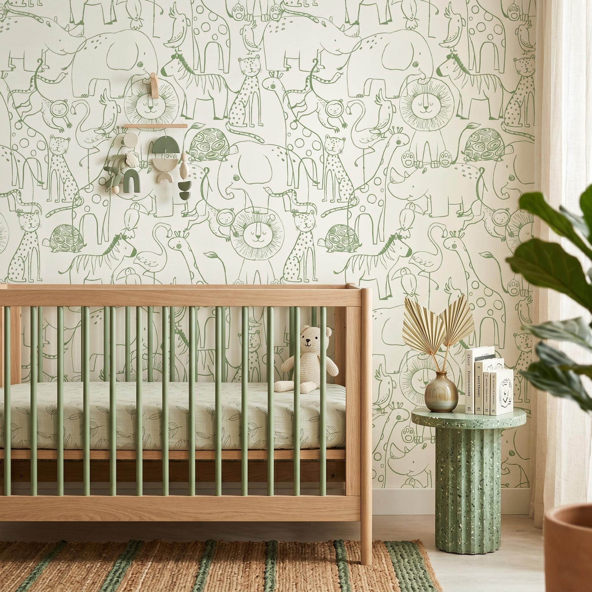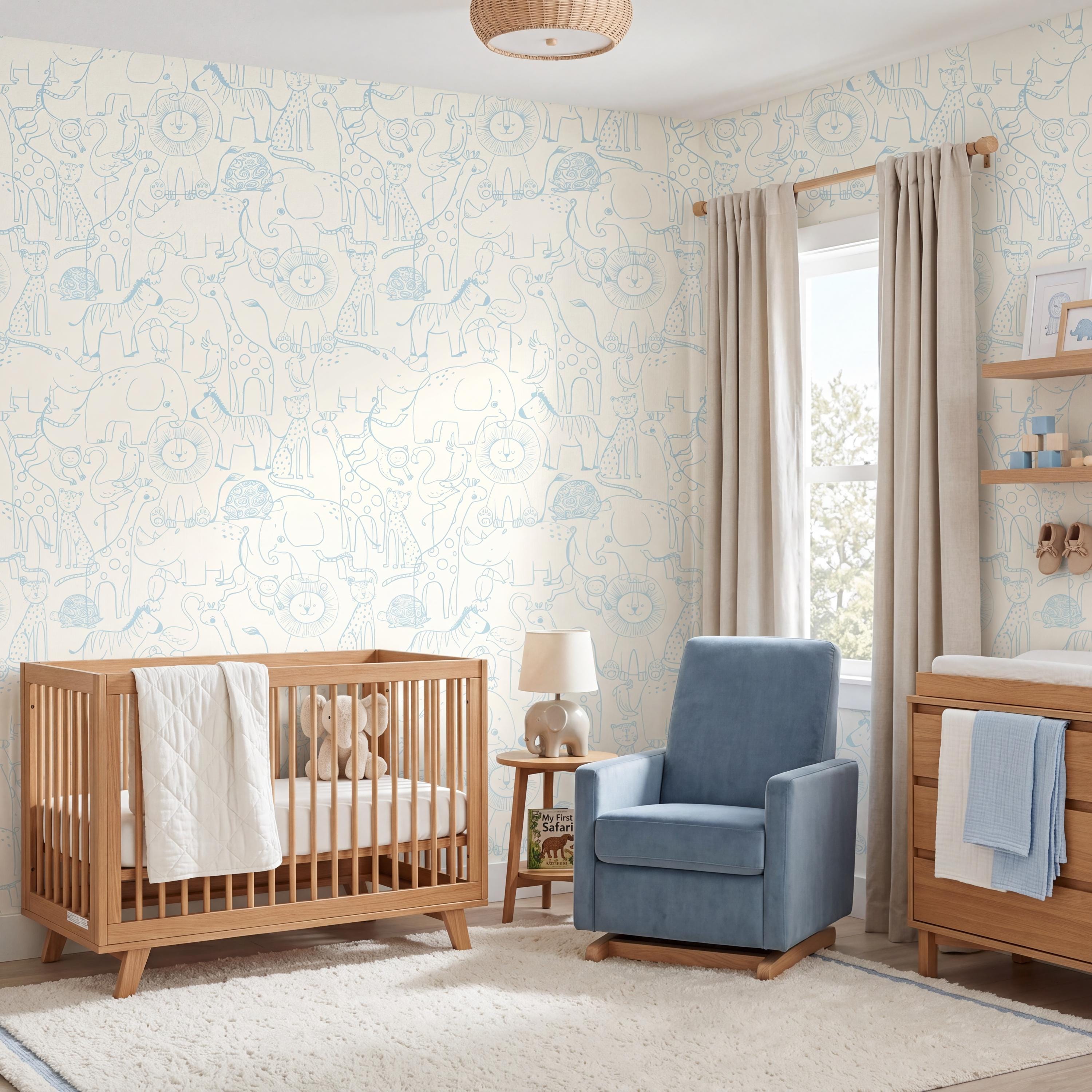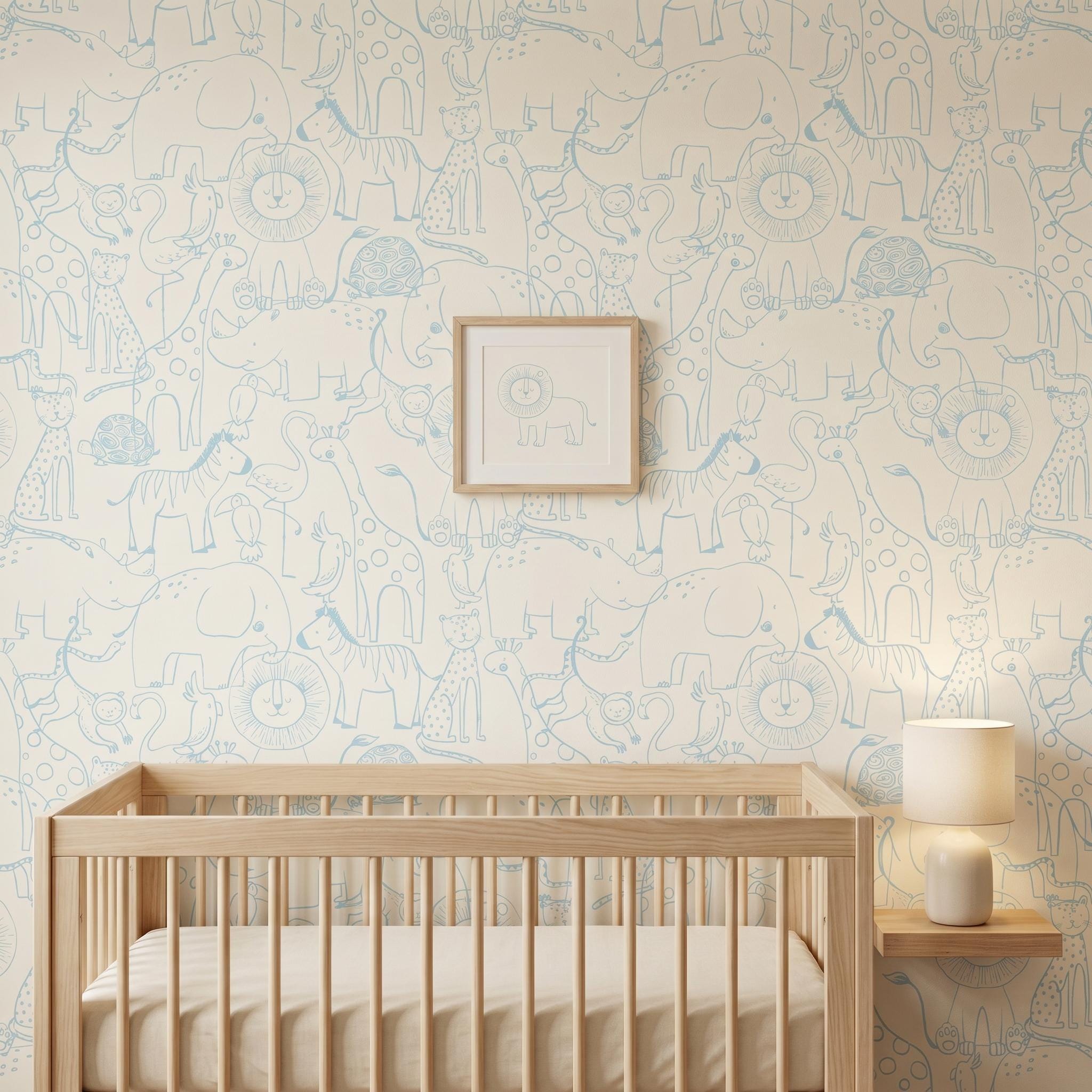 Bring a soft and playful safari atmosphere into your baby’s room with this adorable jungle animal wallpaper. Featuring hand-drawn elephants, lions, giraffes, and more, this charming pattern creates a calming and stylish nursery space perfect for modern parents.