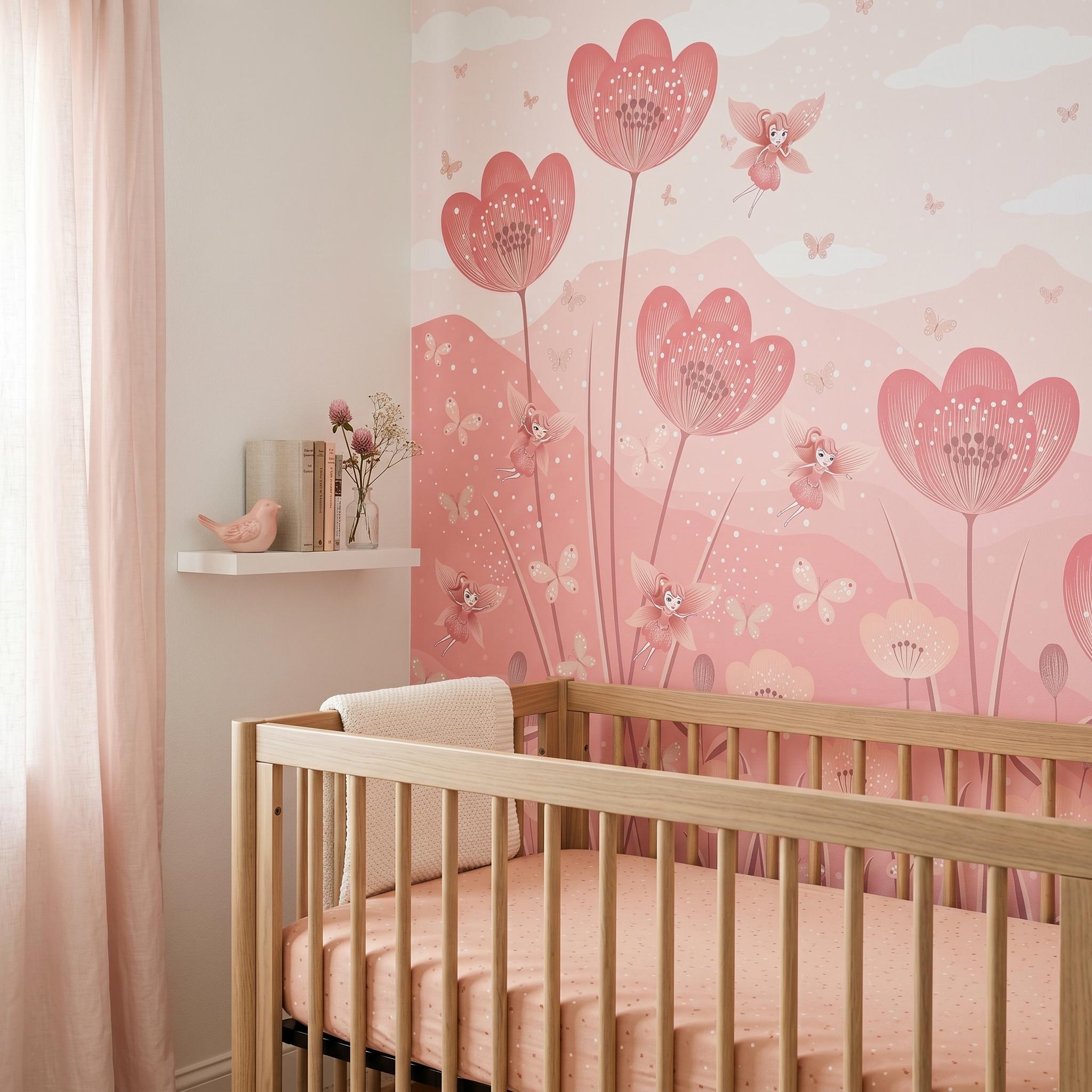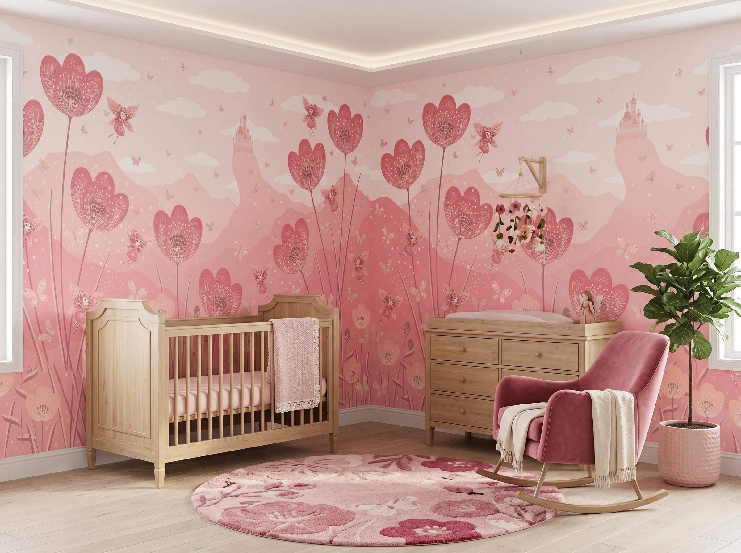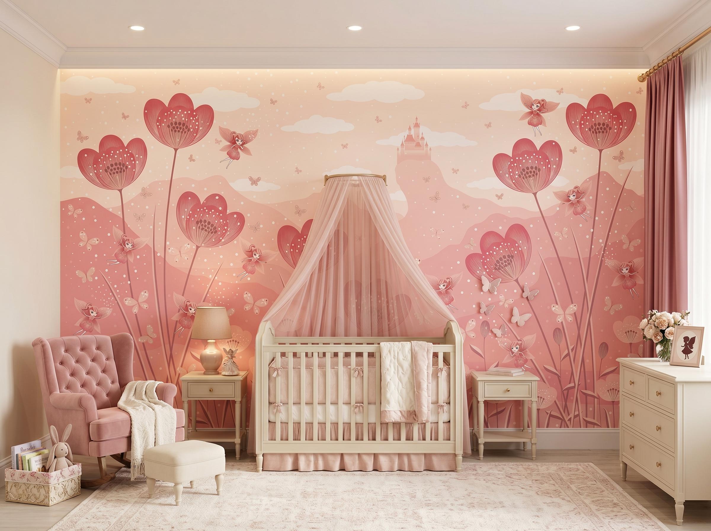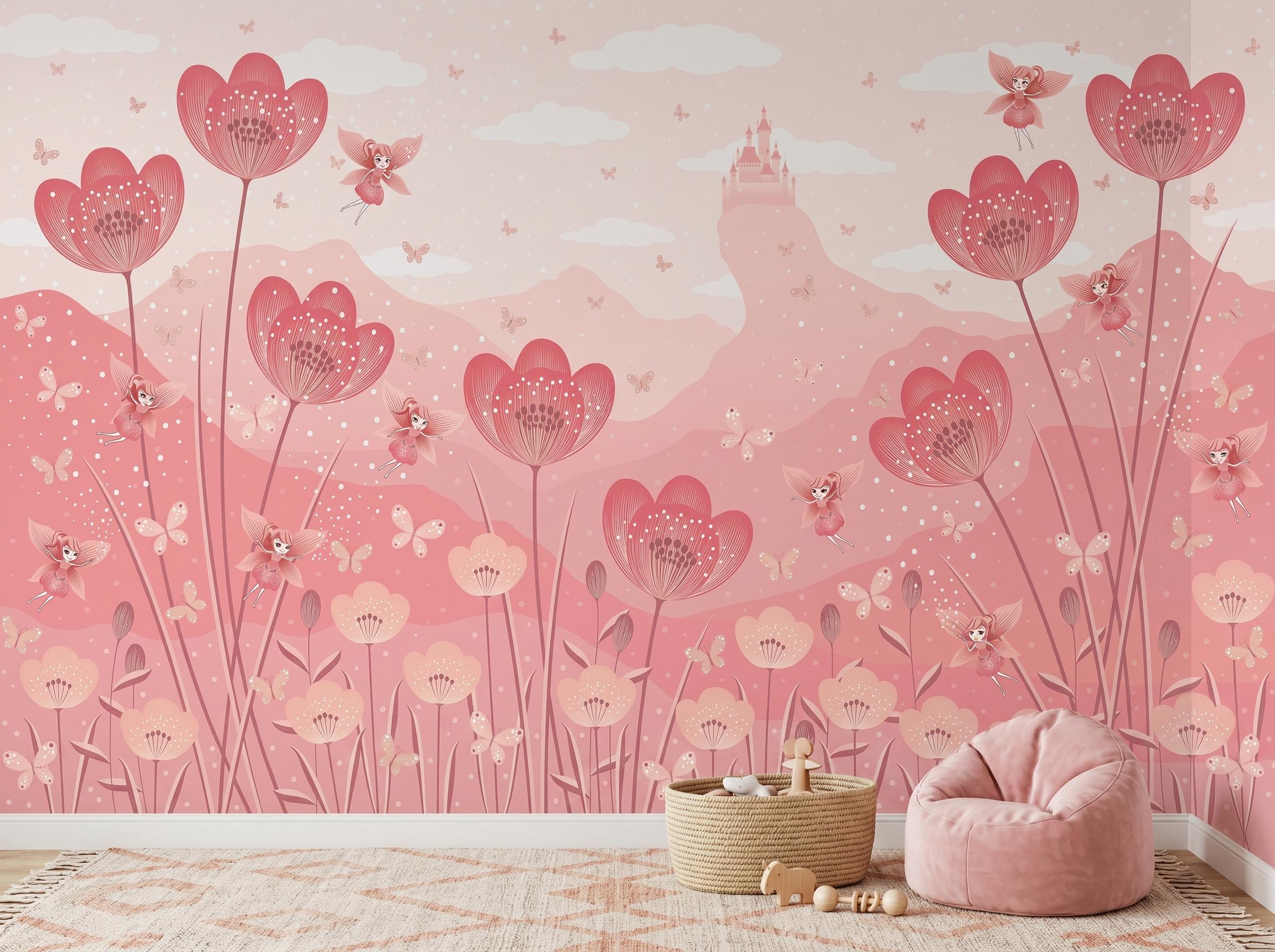 Create a dreamy and magical nursery with this pink fairy flower wall mural 🌸🧚 Perfect for baby girls’ rooms, toddler bedrooms, princess nurseries, and whimsical playrooms. Featuring soft pink floral designs, flying fairies, butterflies, clouds, and a dreamy castle background, this wallpaper transforms any wall into an enchanting fairytale space.